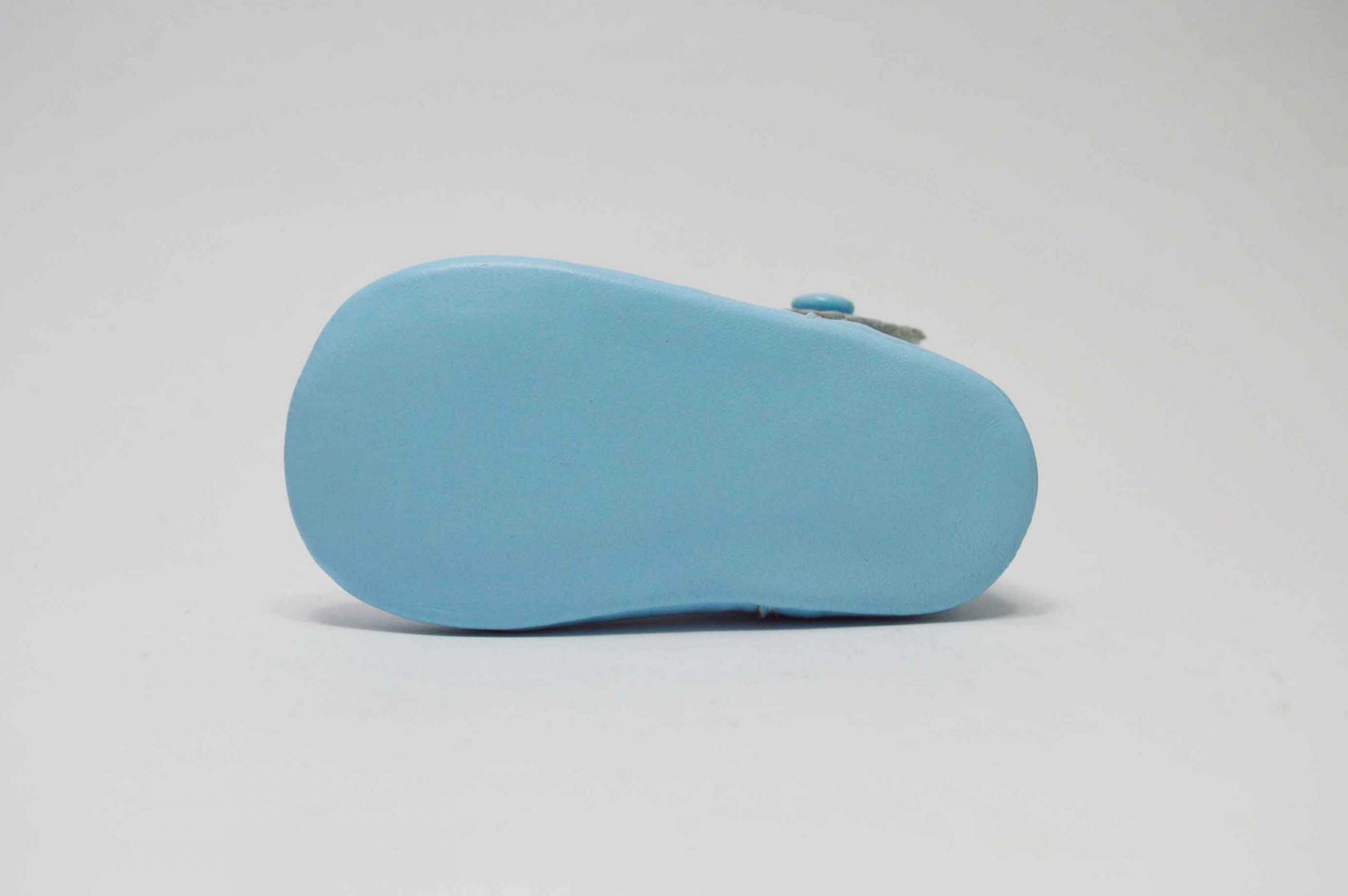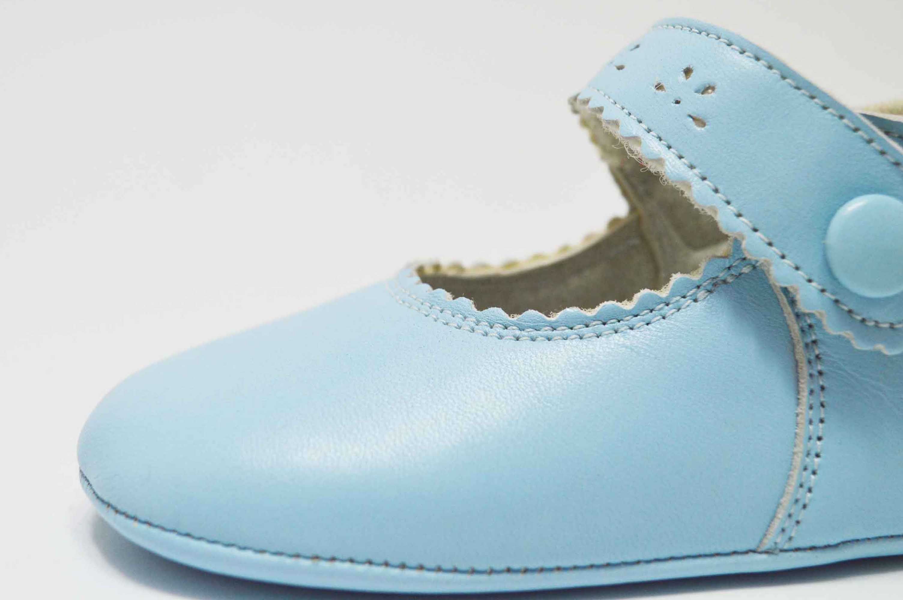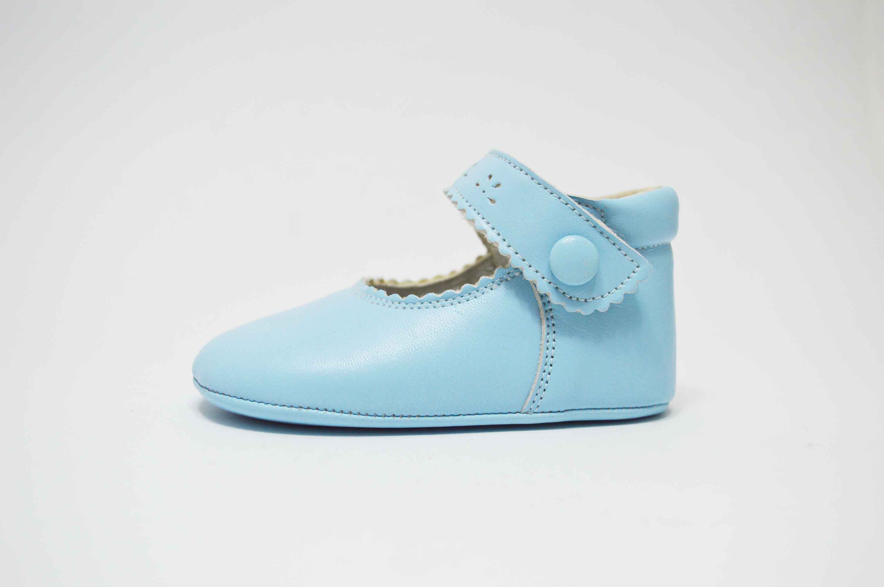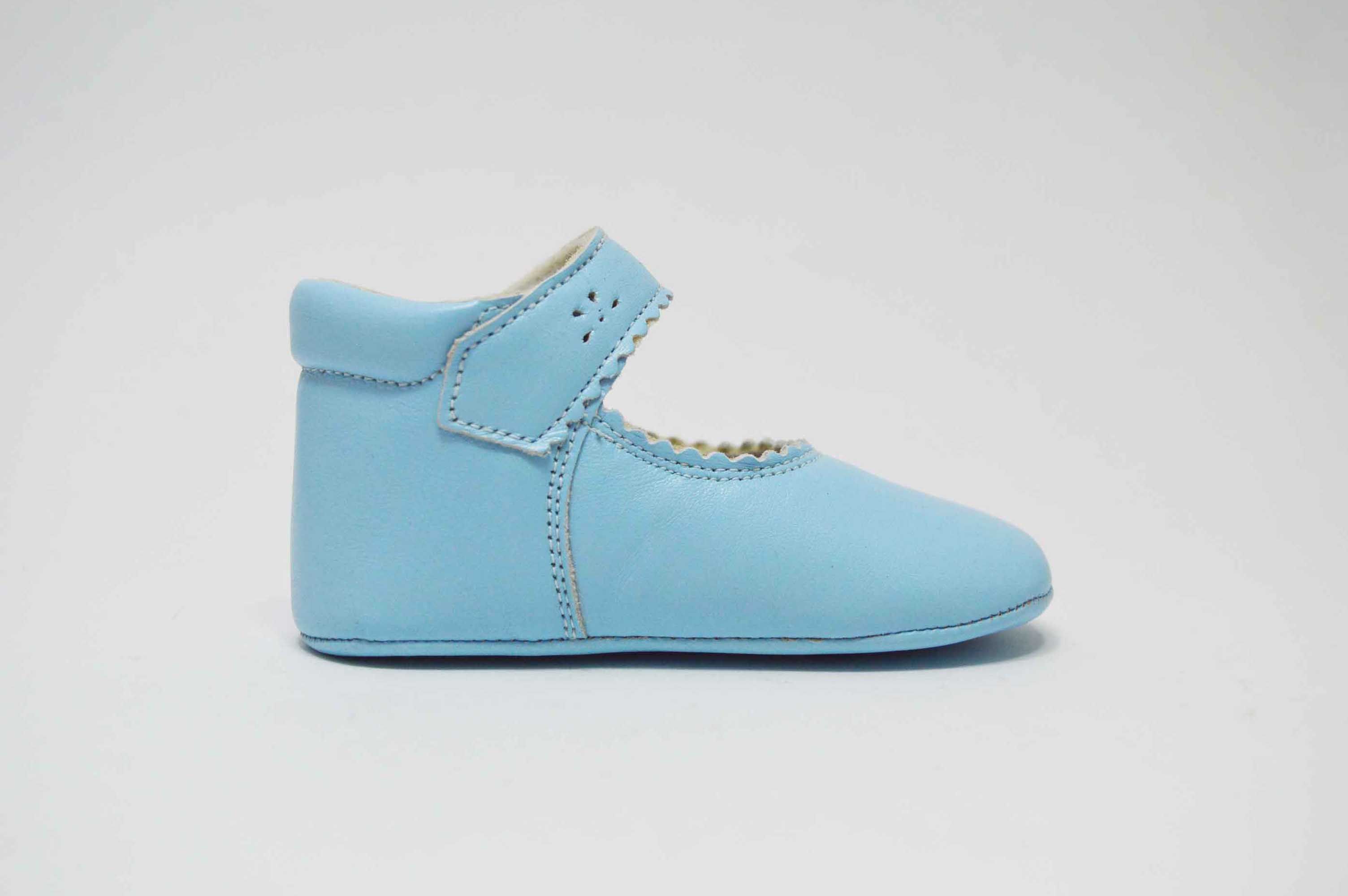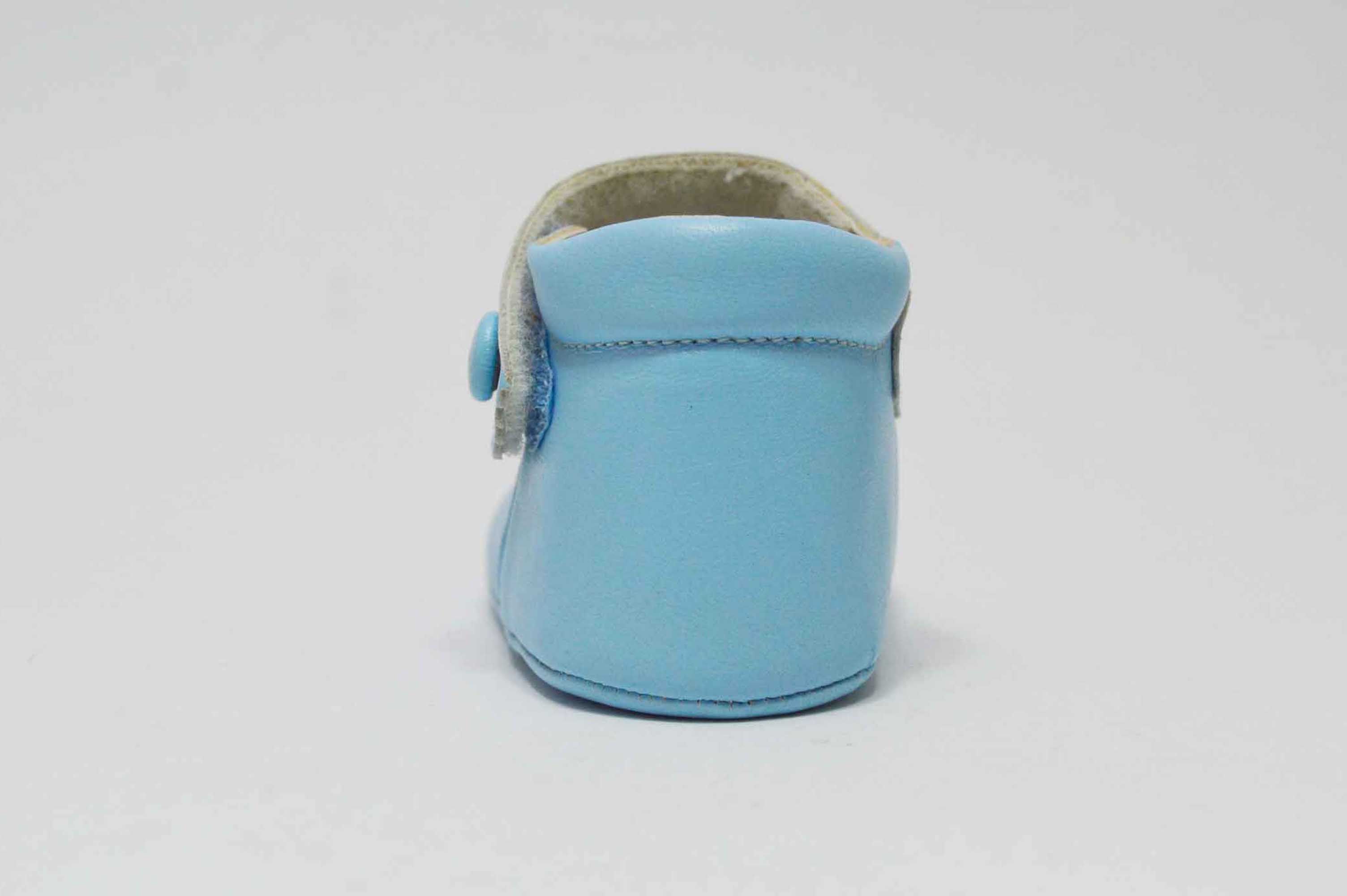 Zapato bebé tipo mecedita sin suela en piel natural de color con cierre adherente. Lleva unas florecitas en la correa. Fabricado en España.