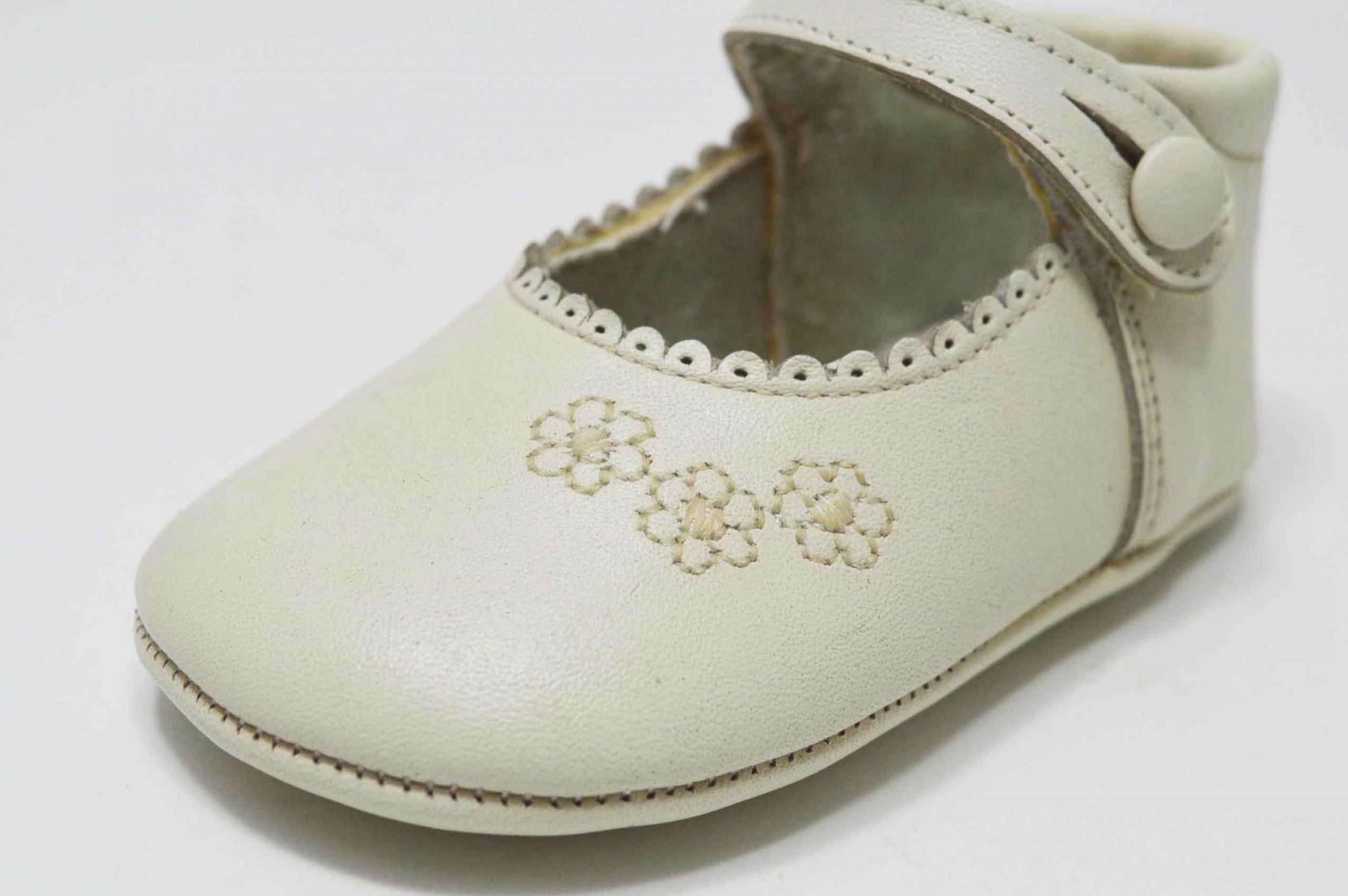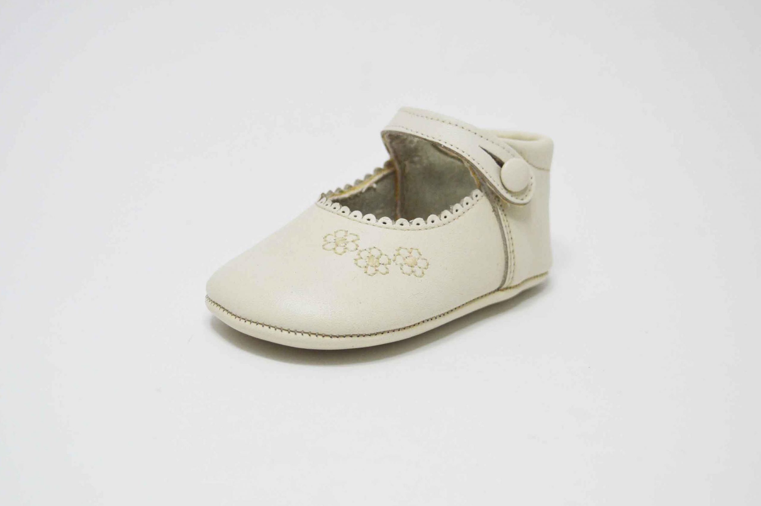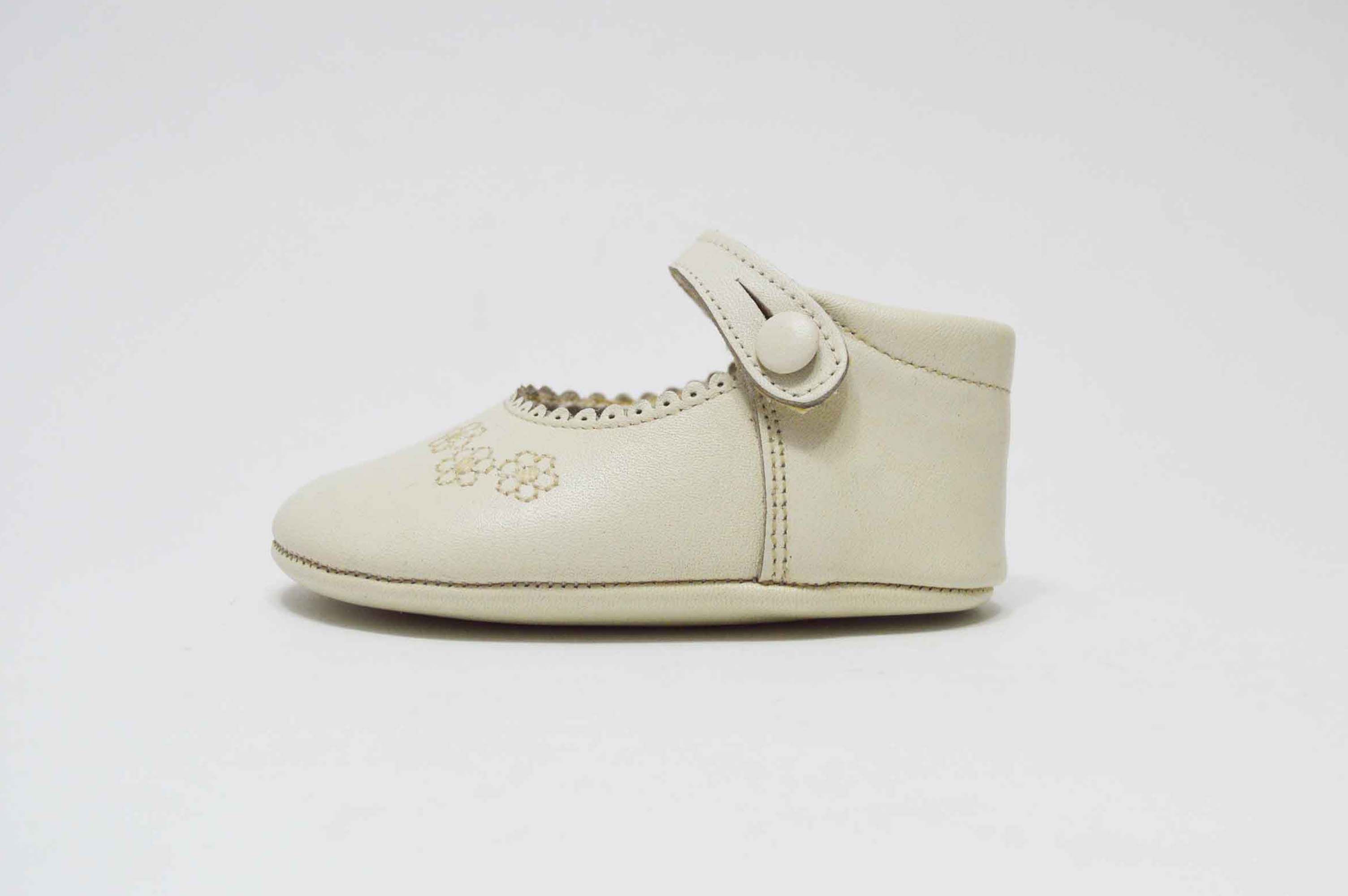 Zapato bebé sin suela para niña. La mercedita lleva unas florecitas en el lateral del hueco. Con cierre de botón. Fabricado en piel natural. Hecho en España.