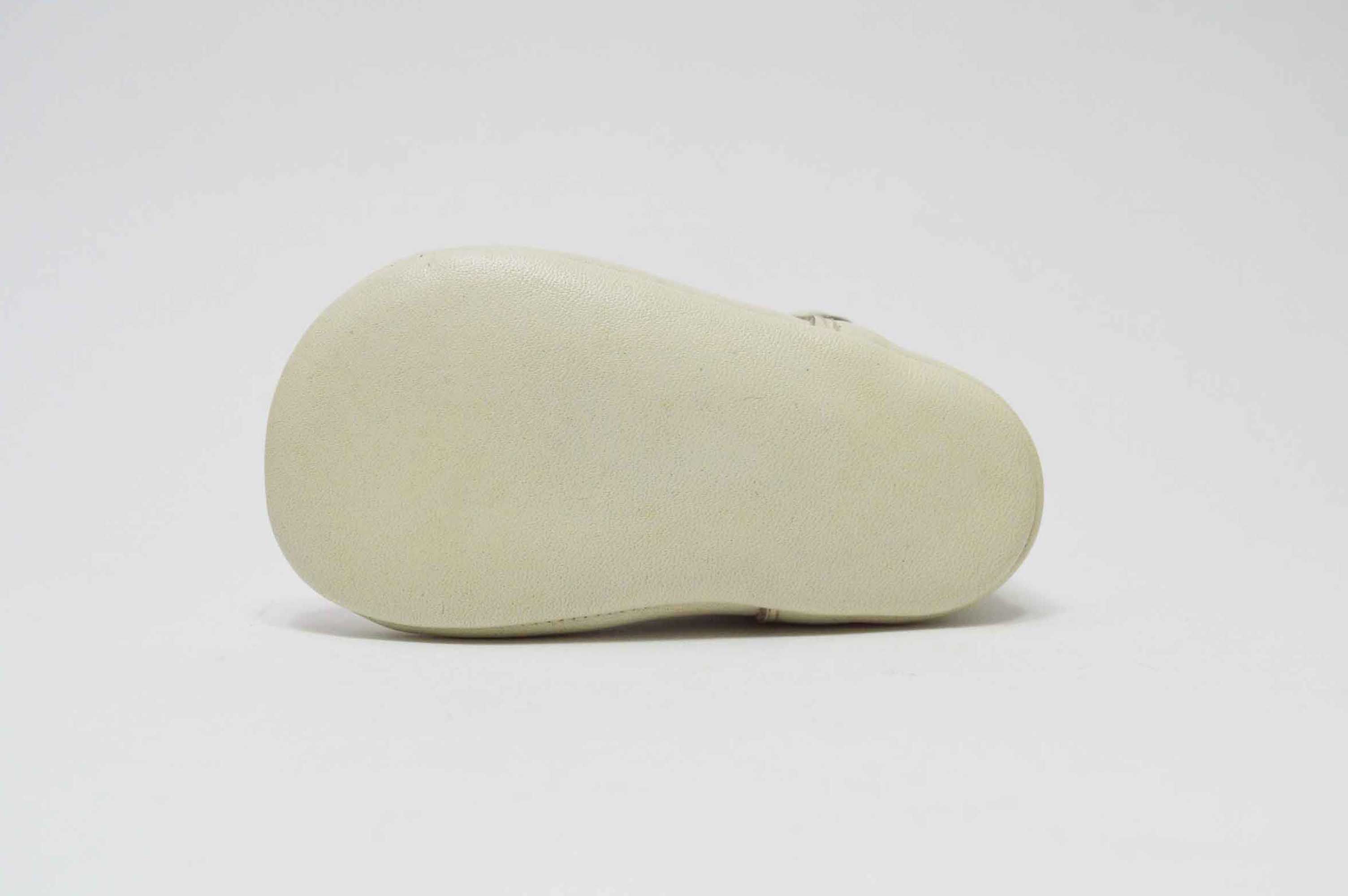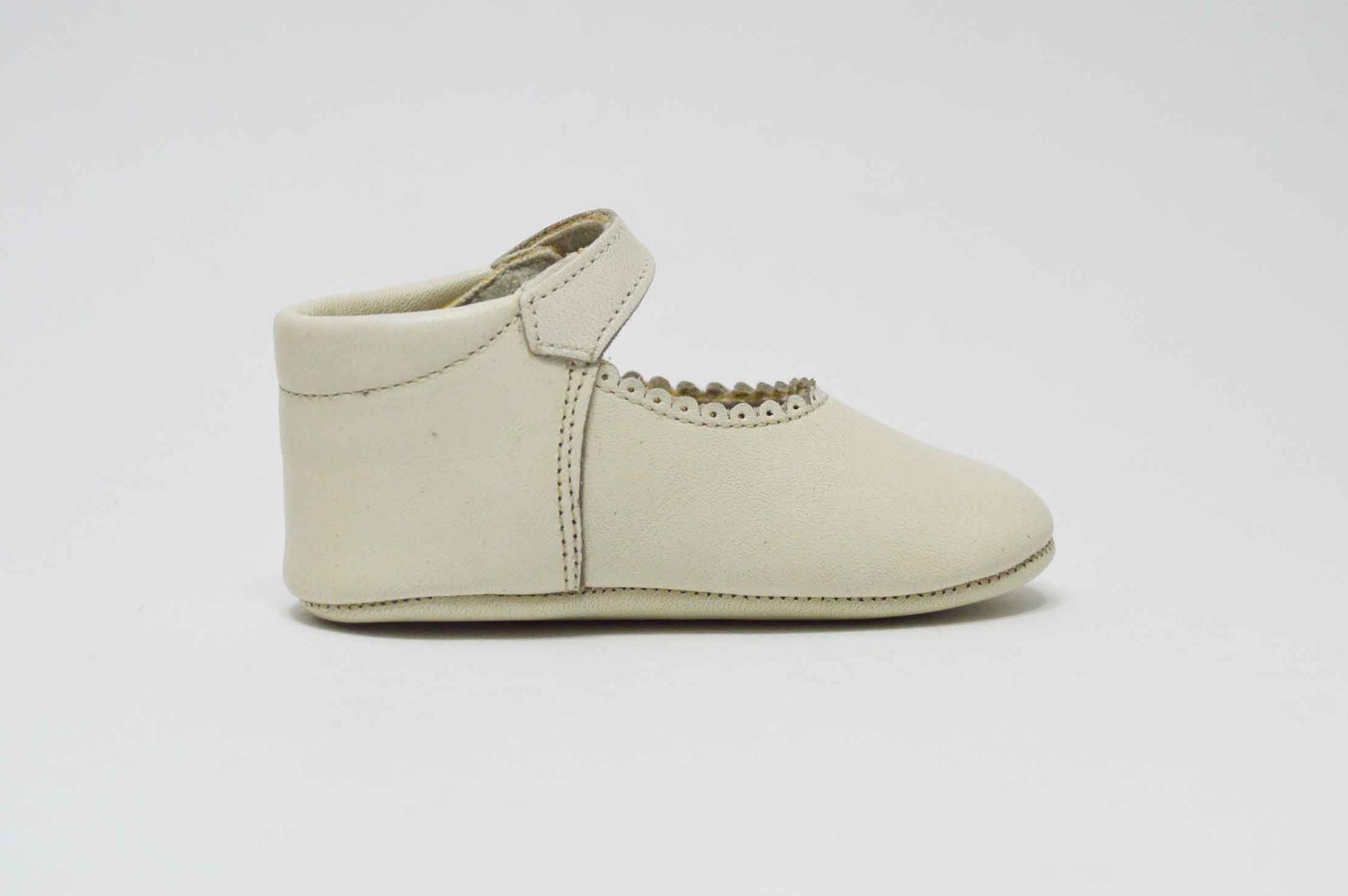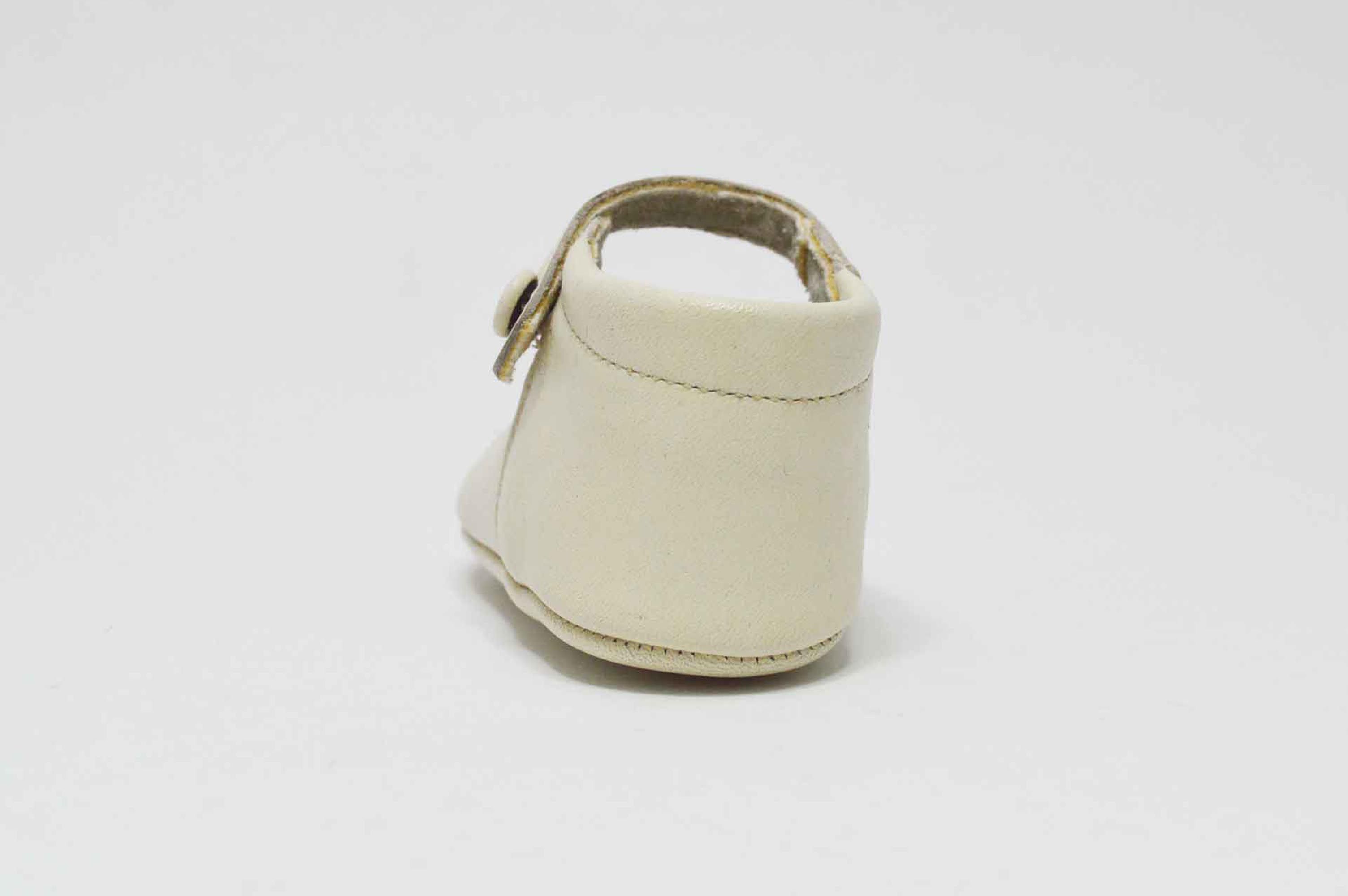 Zapato bebé sin suela para niña. La mercedita lleva unas florecitas en el lateral del hueco. Con cierre de botón. Fabricado en piel natural. Hecho en España.