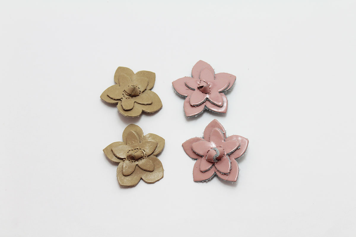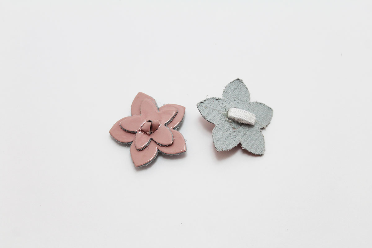 Pareja de una florecita fabricada en piel. La forma de engancharlo al cierre del zapato es con un elástico que tiene debajo. Se puede poner en las correas con cierre de hebilla o adherentes.