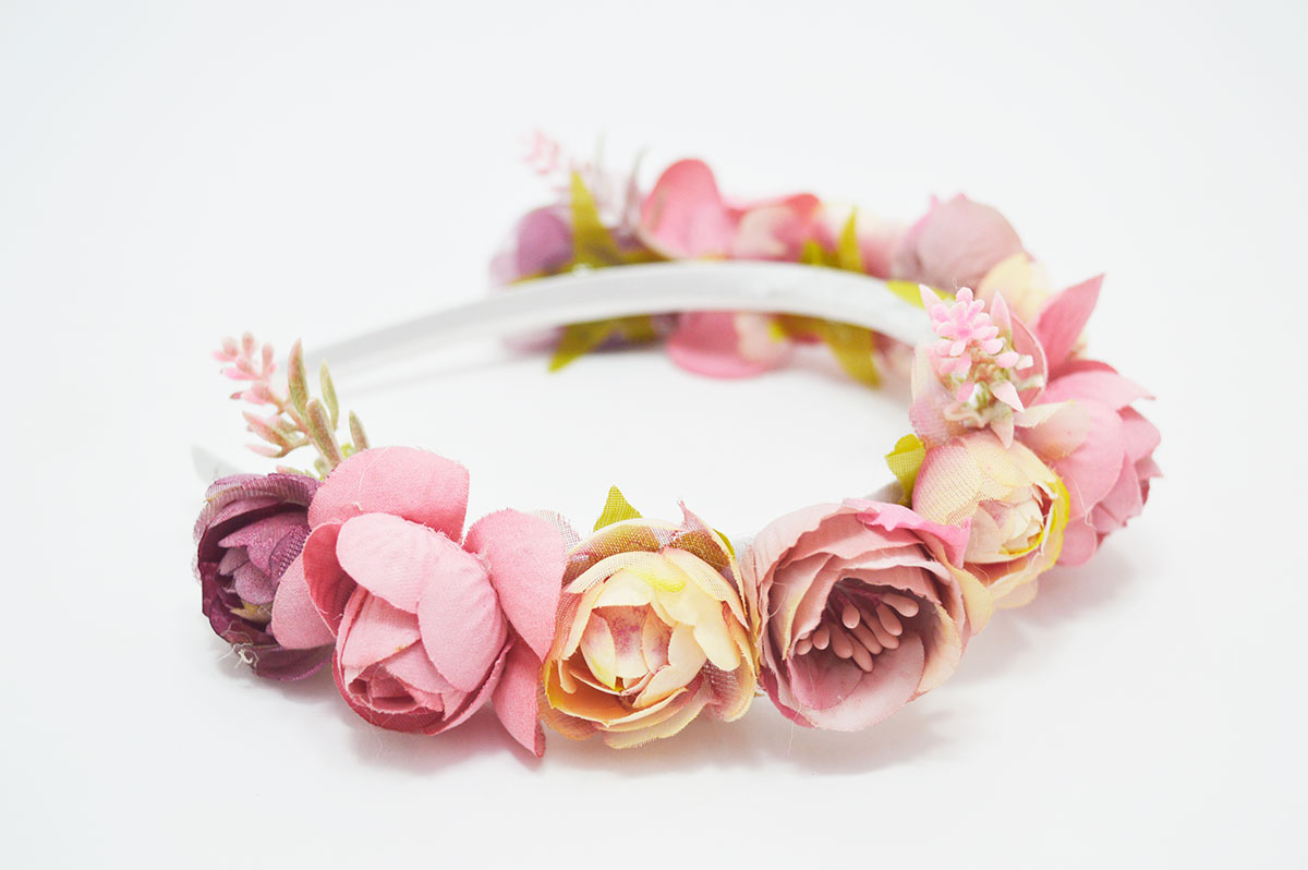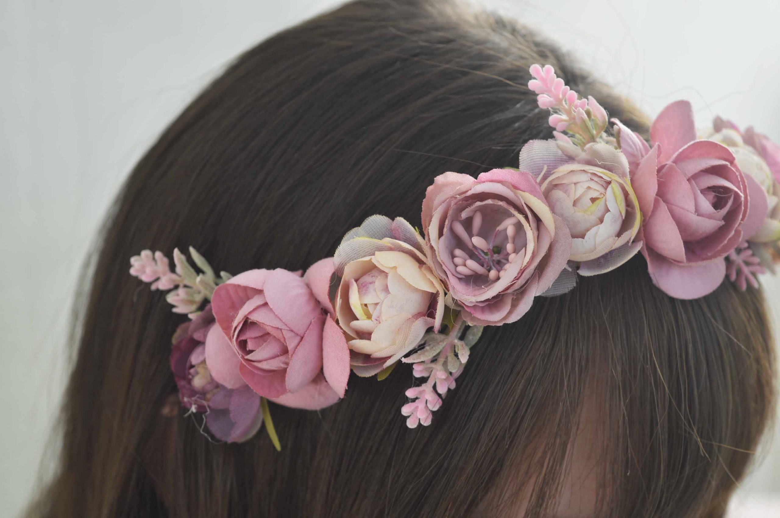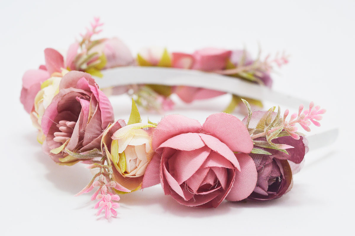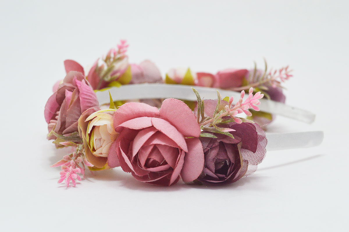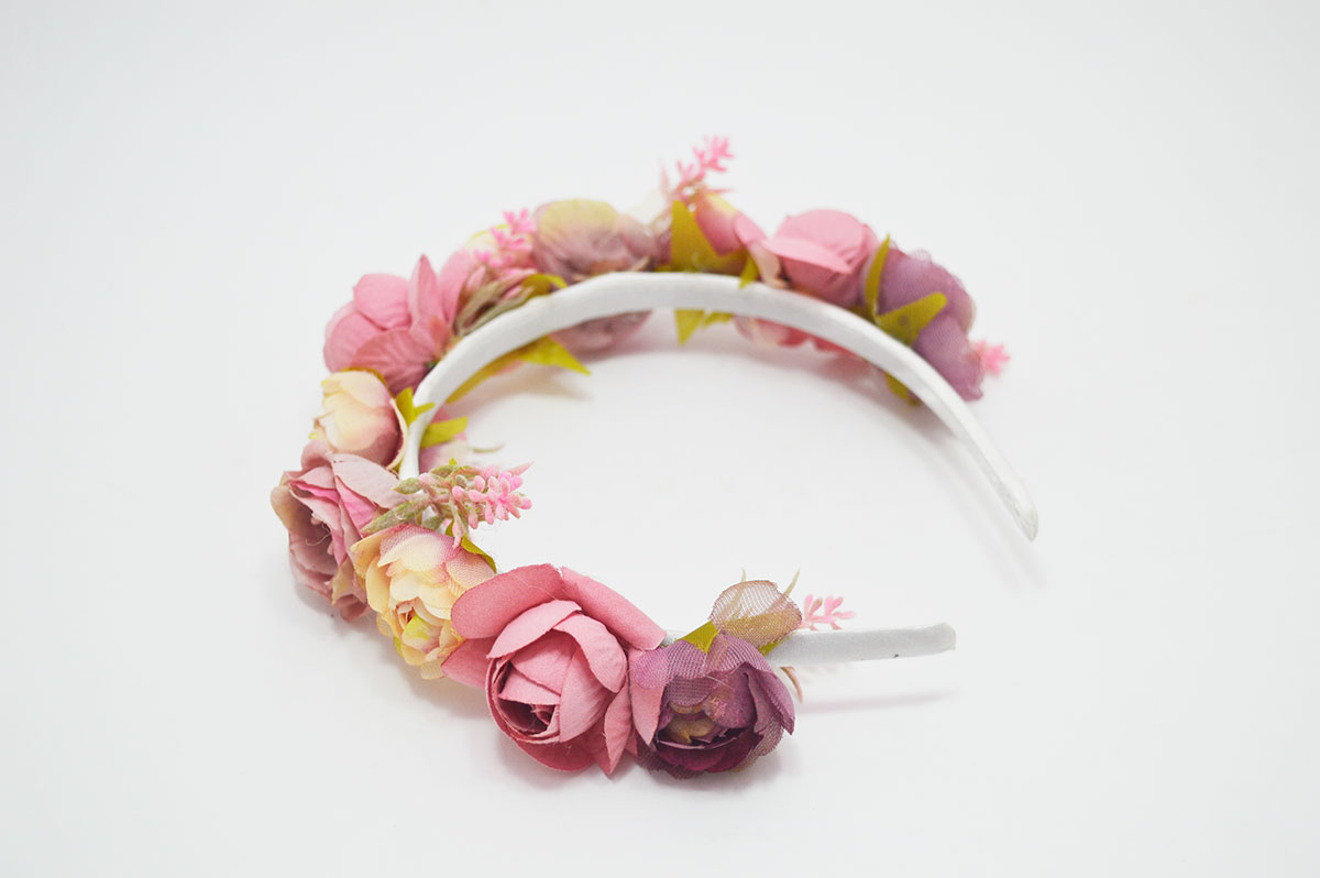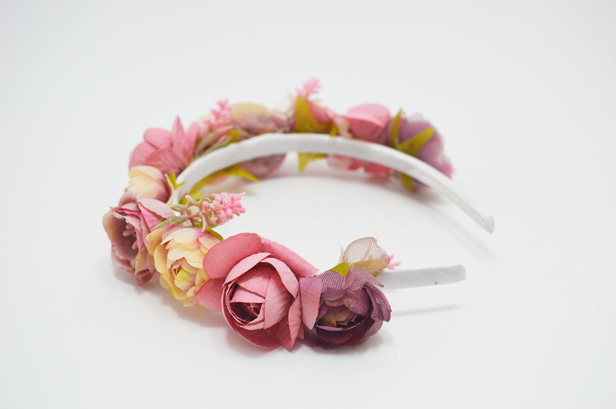 Diadema de flores en tonos rosas para niñas. Los complementos para el pelo como las coronas, diademas, tiaras o pasadores se han convertido en la última tendencia en ceremonias.