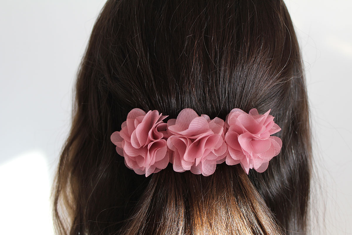 Pasador en tonos rosa con el mismo tipo de flor, es una pinza para el pelo que se adapta genial para que puedas recoger la cantidad de pelo que quieras.