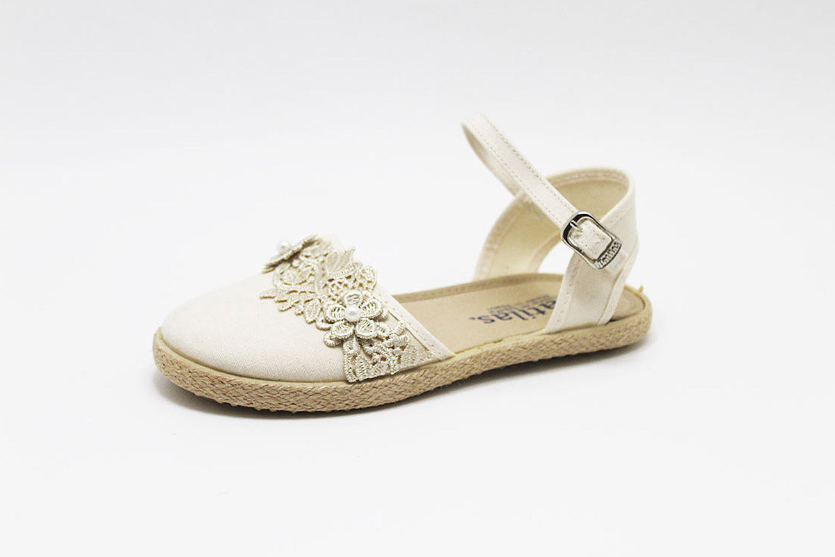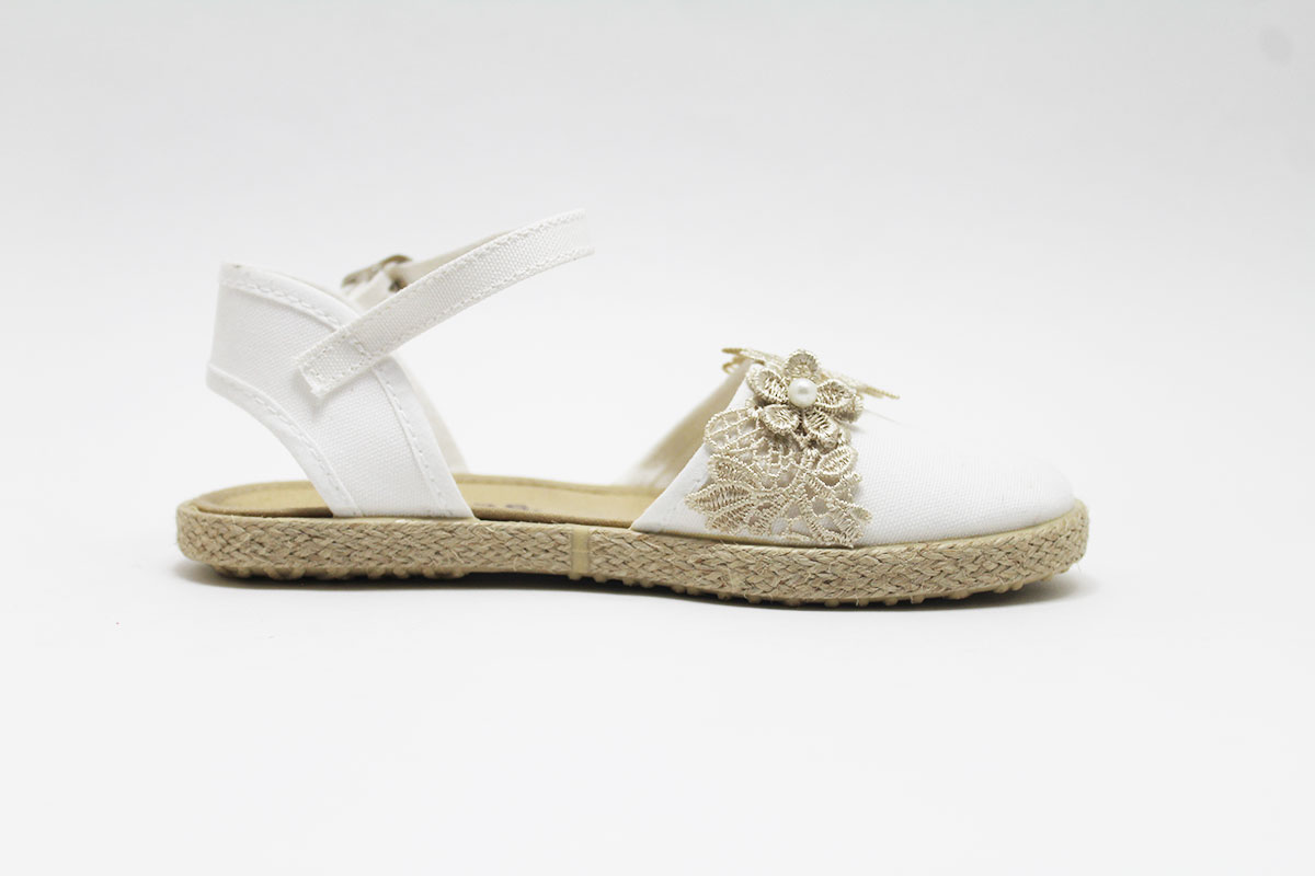 Alpargata clásica tipo sandalia en lona y con cierre de hebilla. Es una alpargata con un bonito bordado dorado de flores al tono y detalles de perlitas blancas. Este modelo es totalmente plano, por lo que lo podrán usar las niñas más pequeñas. Disponible en dos colores preciosos: blanco y beige.