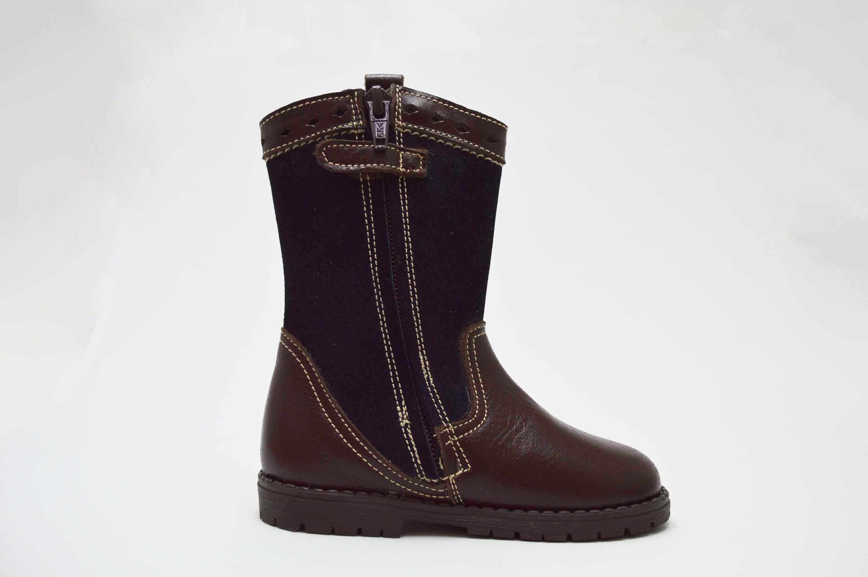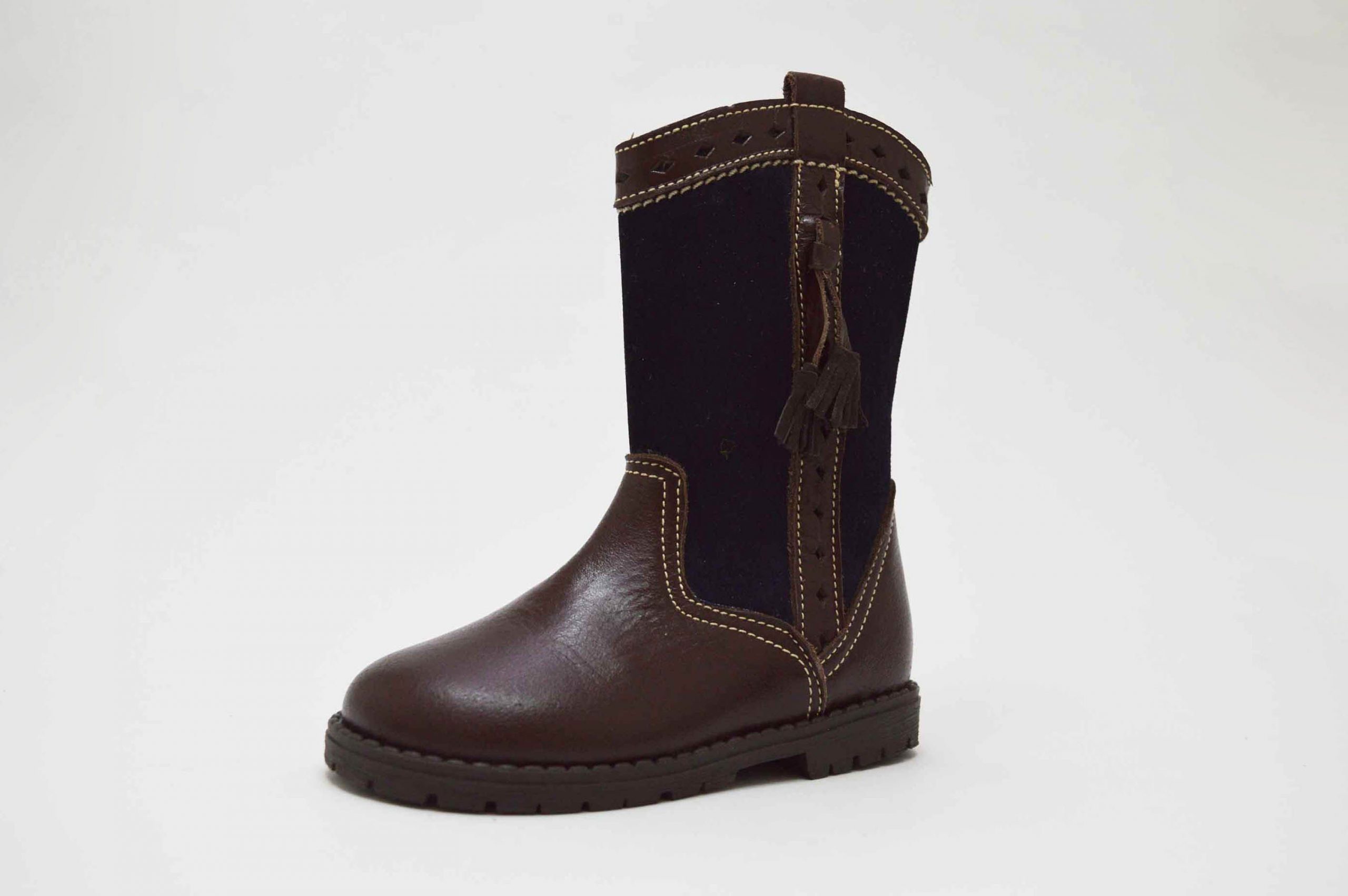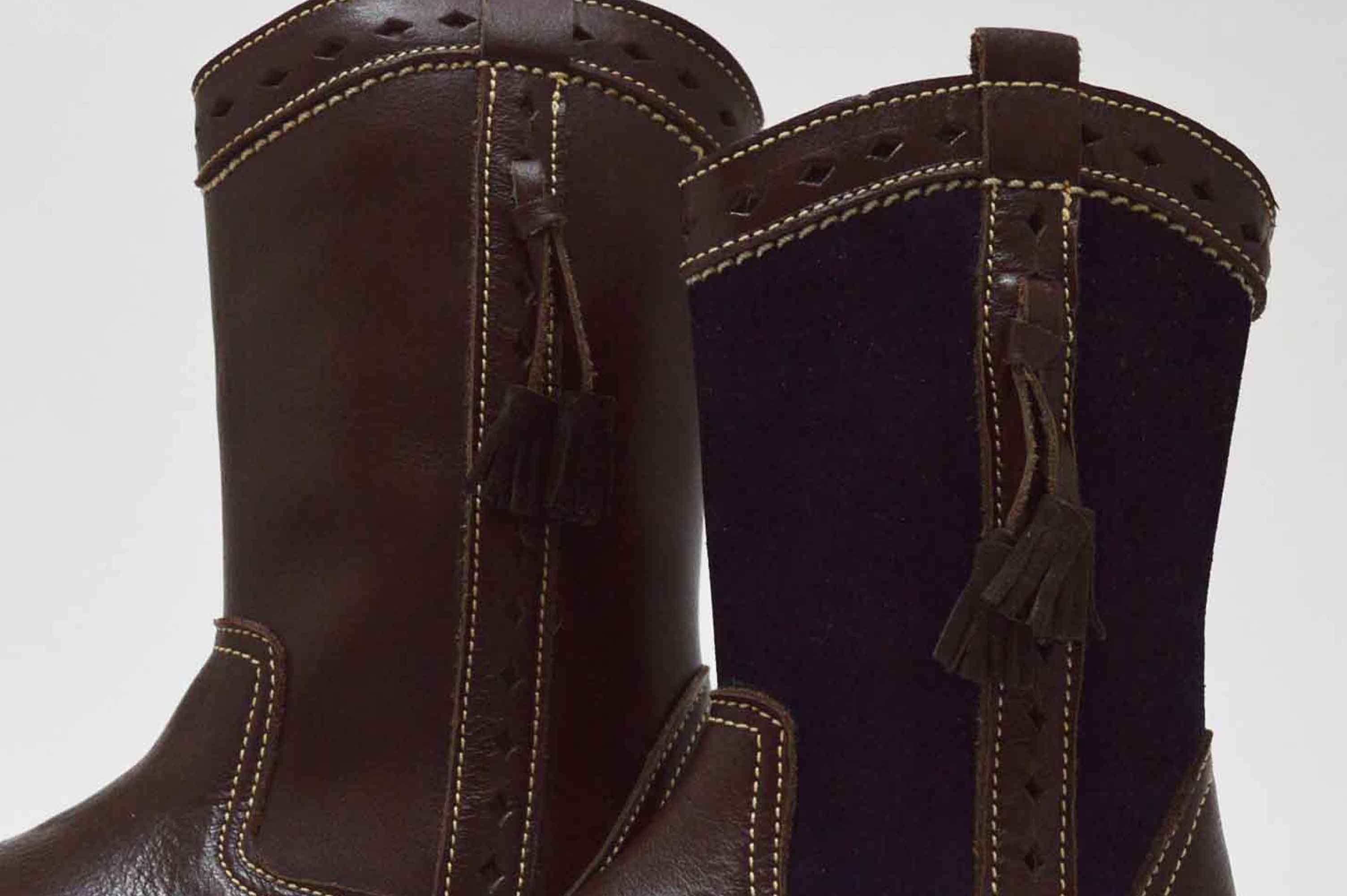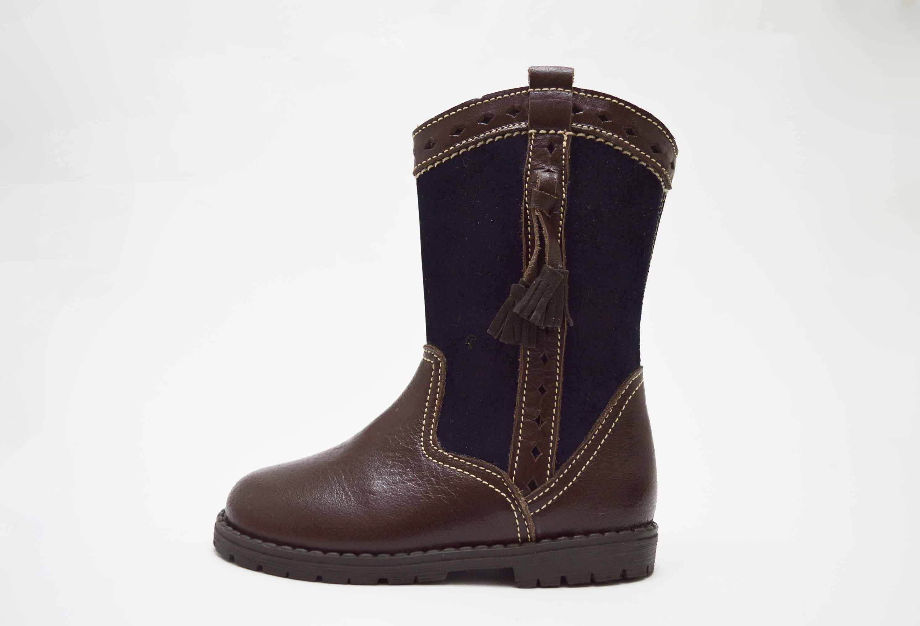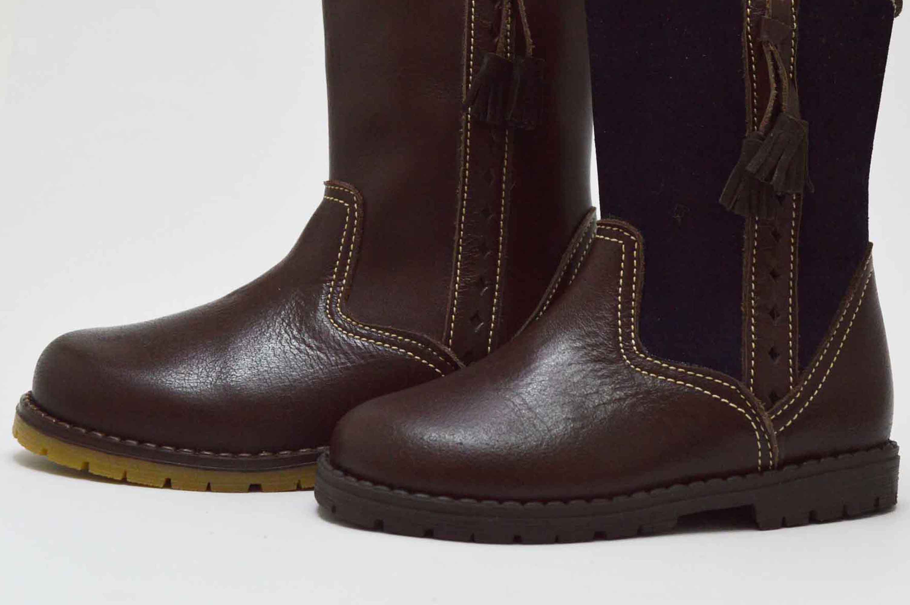 Botas altas camperas, con borlas y cierre de cremallera lateral. Disponible en dos versiones: una de las botas enteras en color marrón chocolate y la otra marrón con combinado en azul marino serraje.
