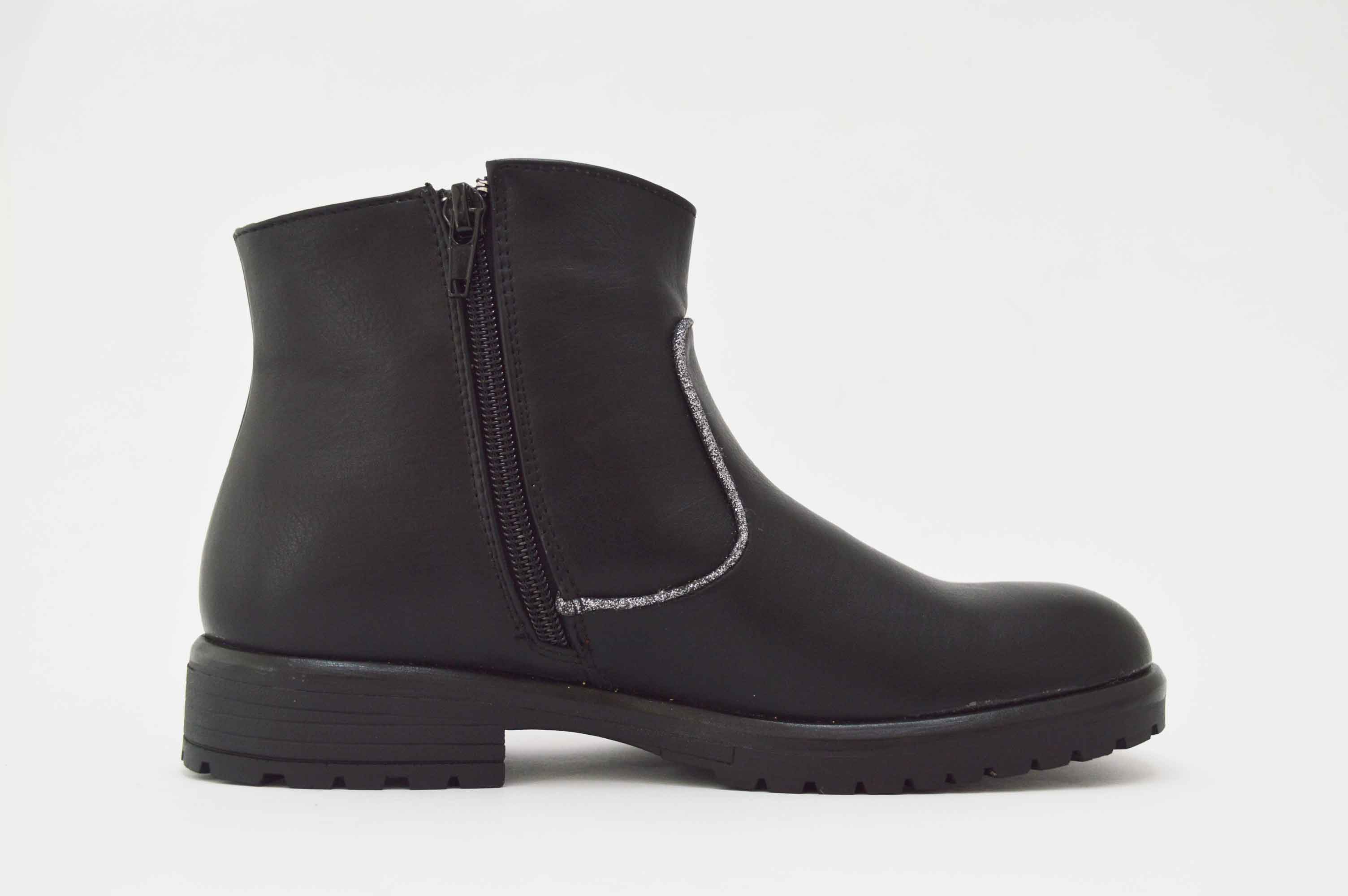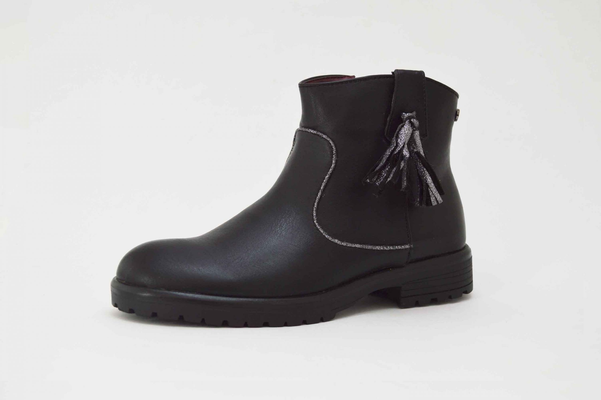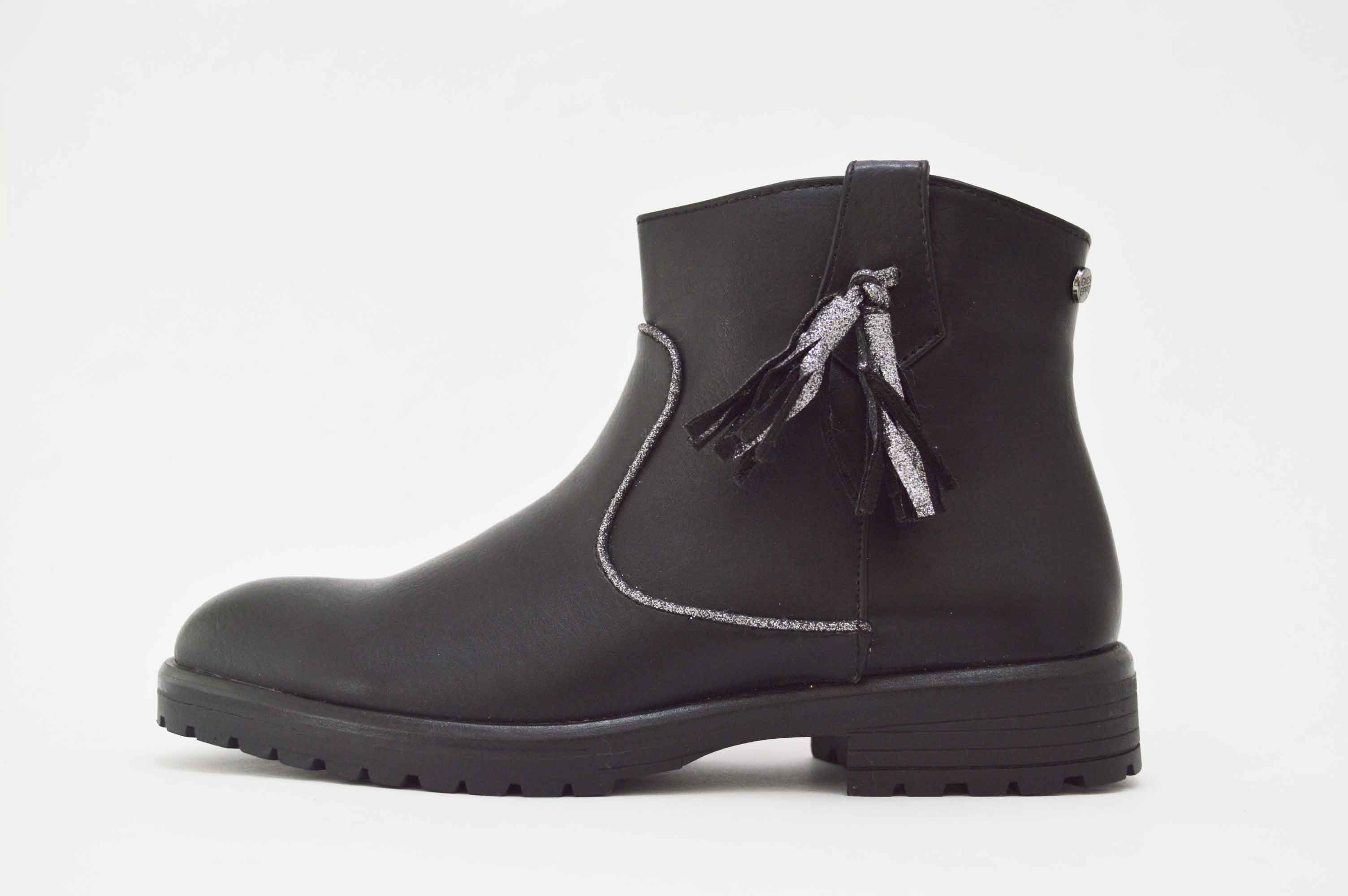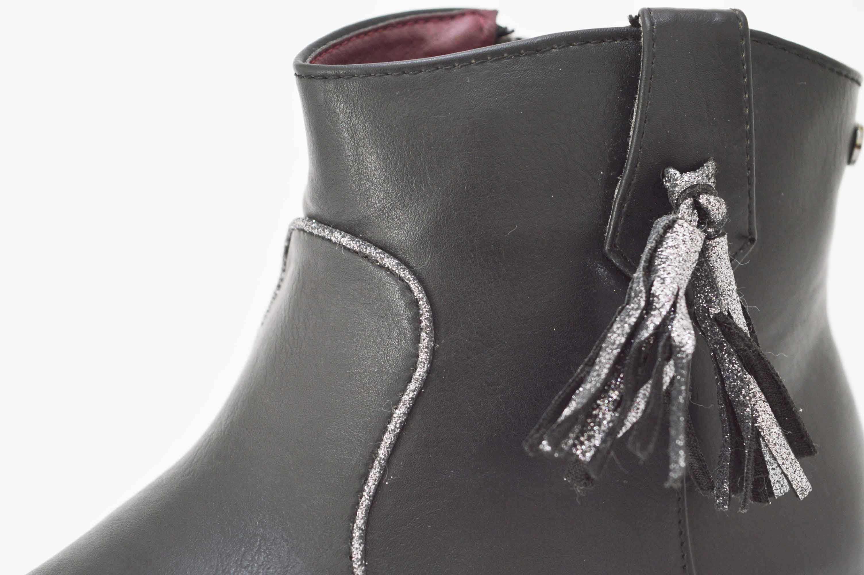 Botín corto en color negro. Tiene unas borlas en un lateral en tonos plata glitter. Con un cómodo cierre de cremallera en el lateral.