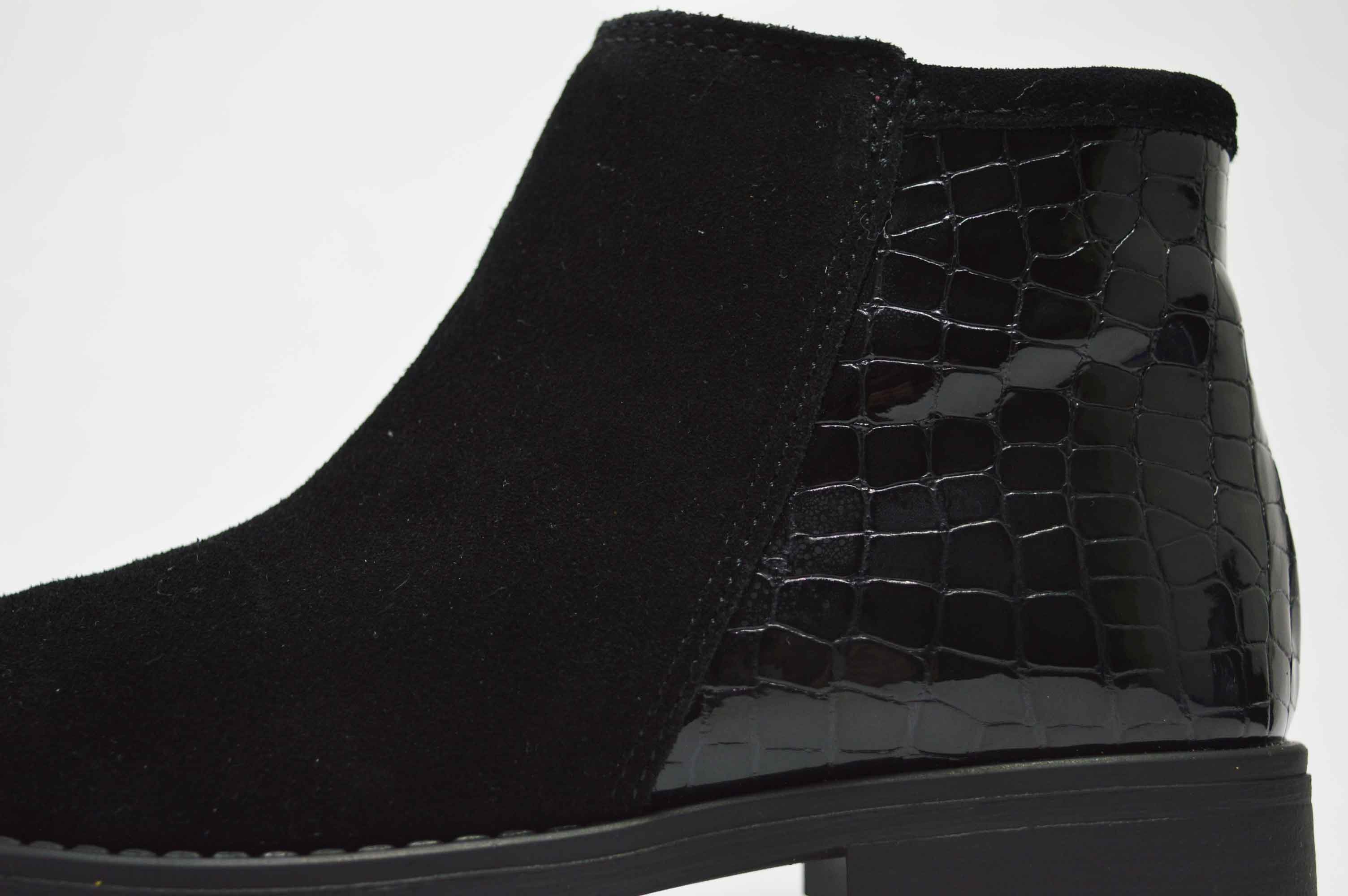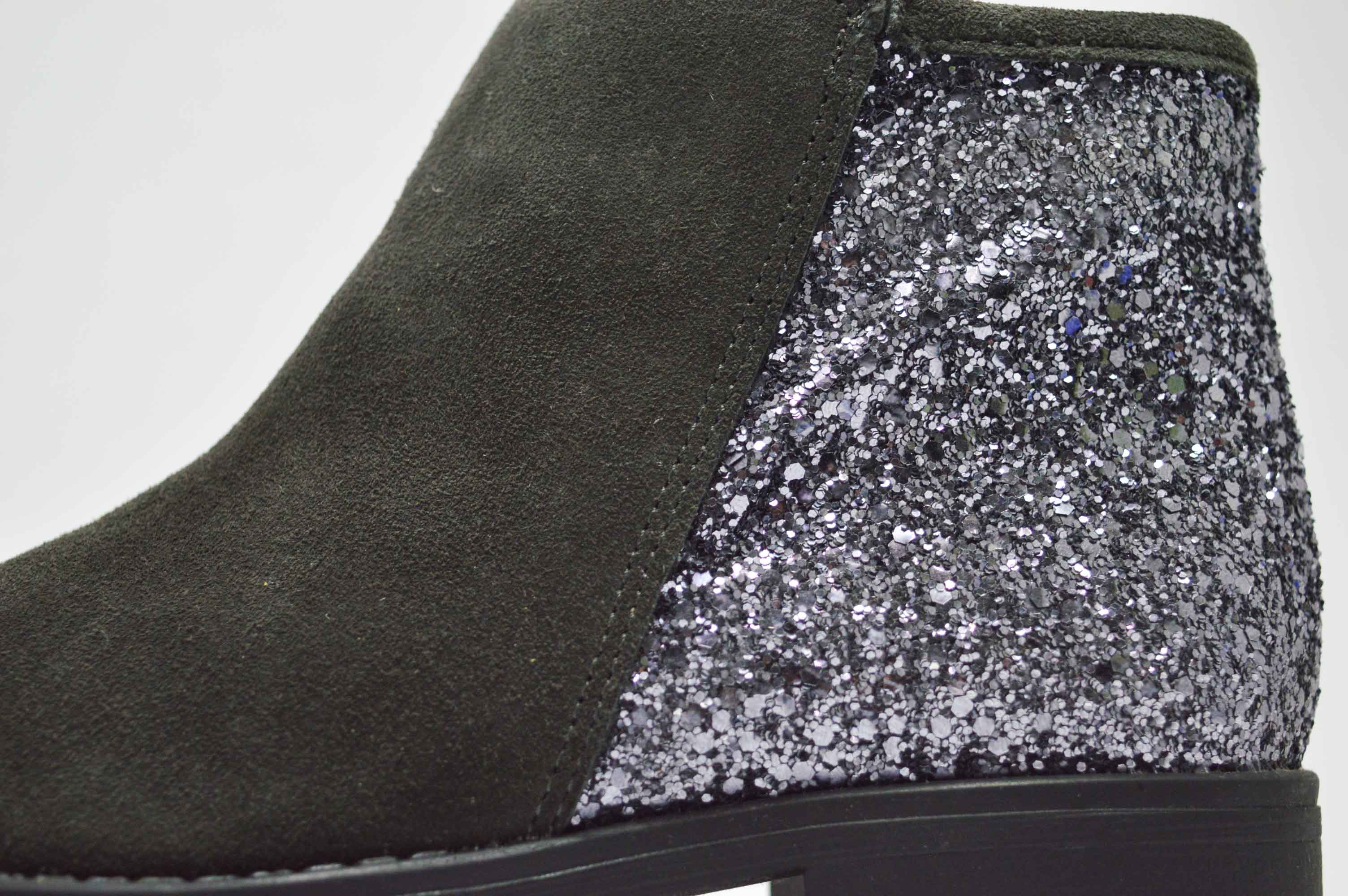 Botín en serraje gris con la talonera en glitter, y en serraje negro con la talonera en charol piel serpiente.