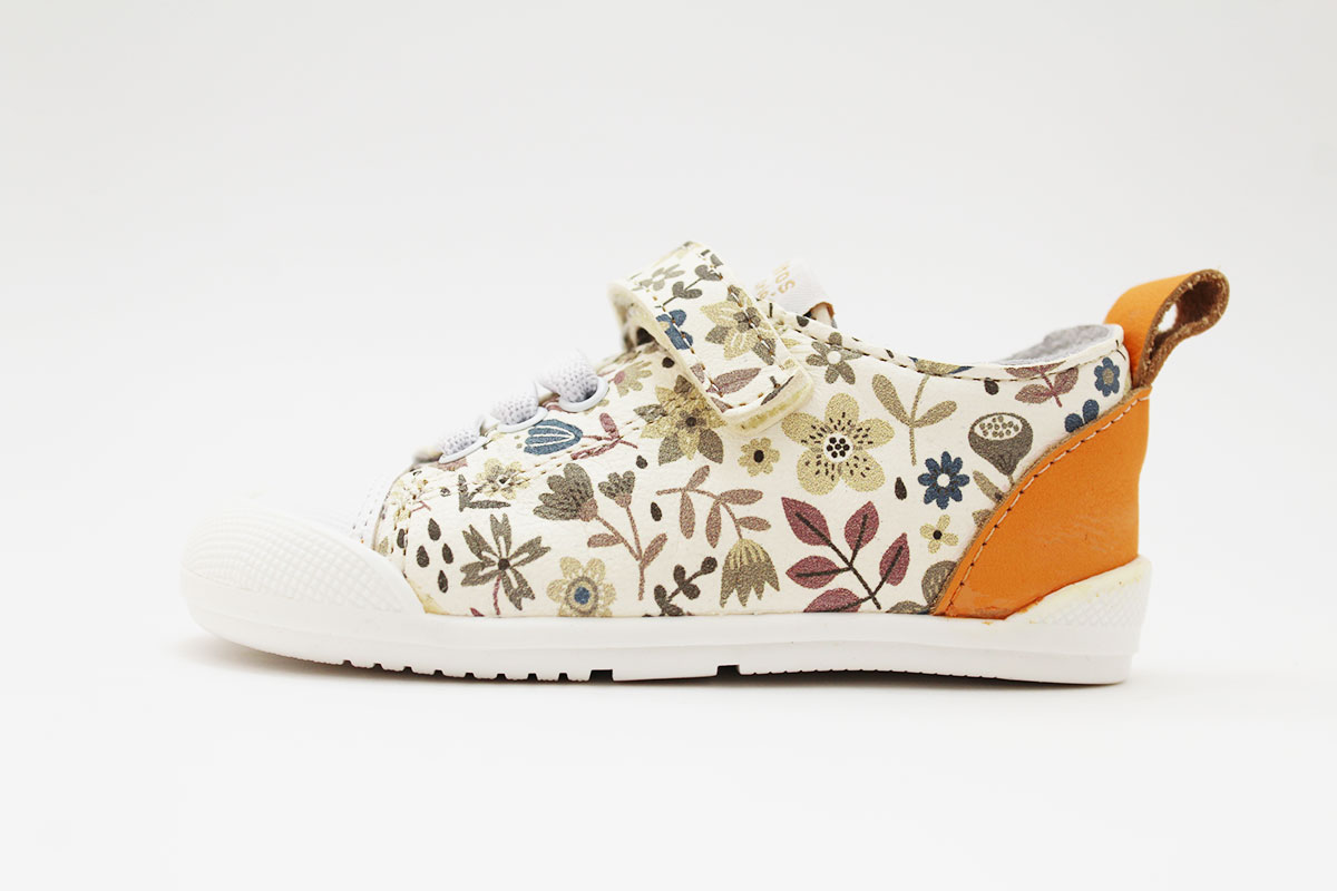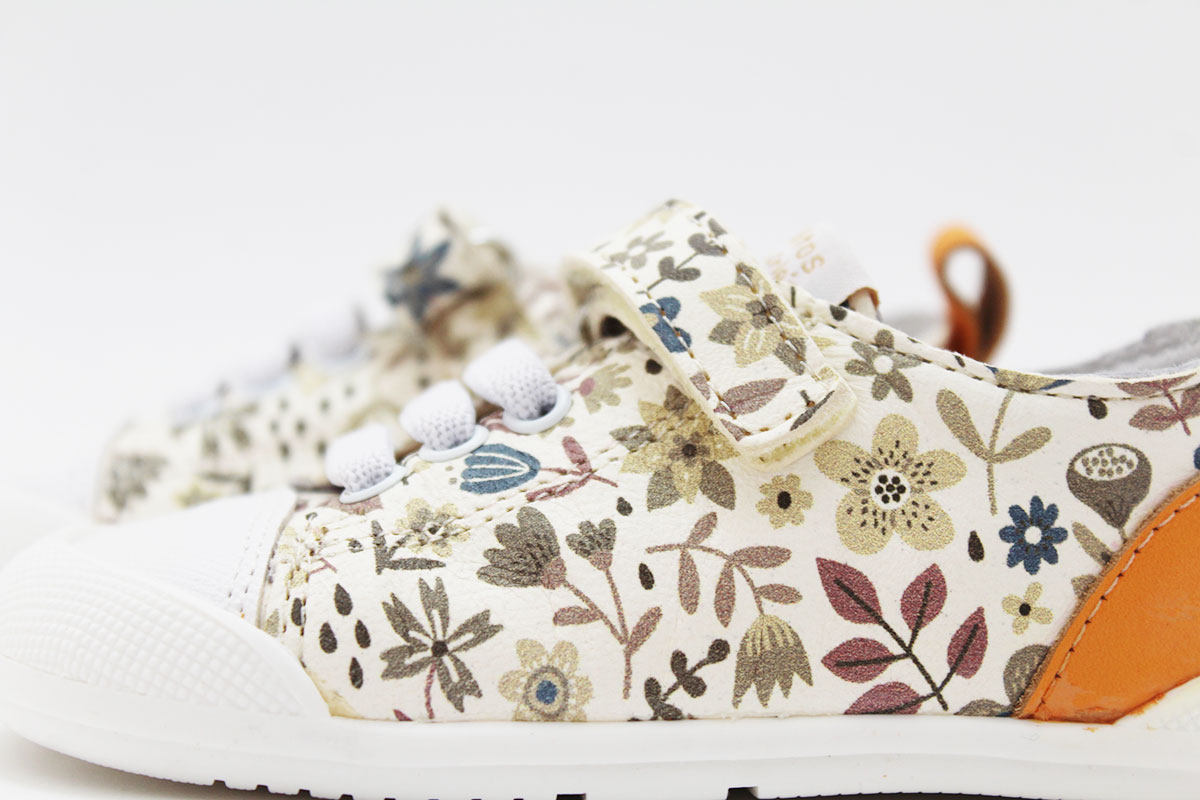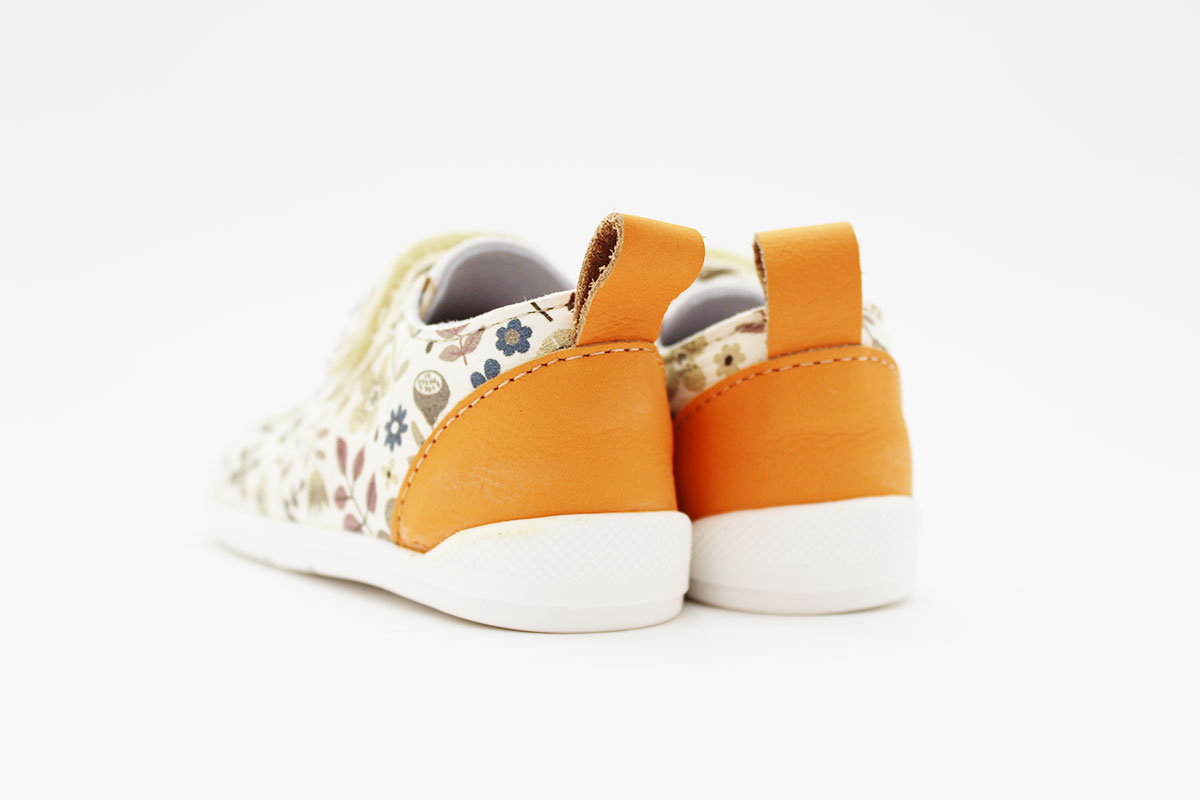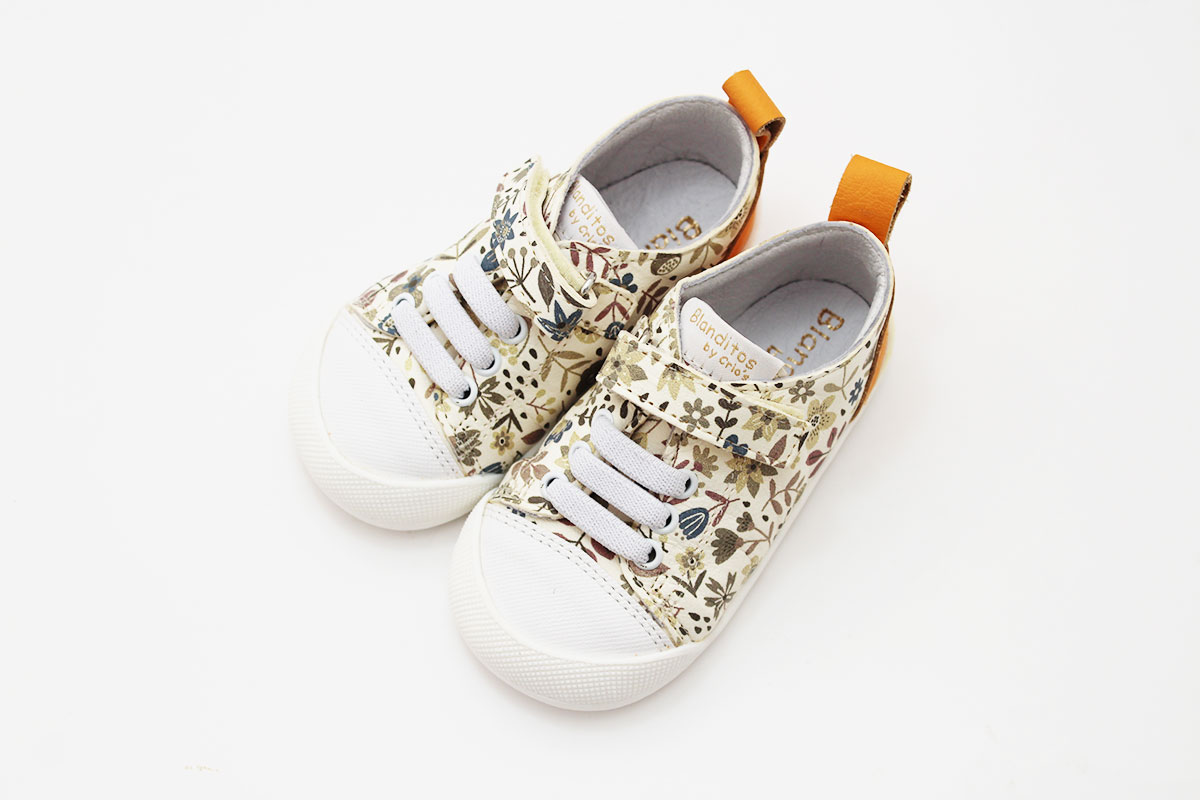 Deportivos respetuosos, modelo ARIEL, en color blanco con un bonito estampado en tonos beige, de la marca Blanditos by Crios. La pieza trasera es de color naranja combinando con el resto de colores de las flores.