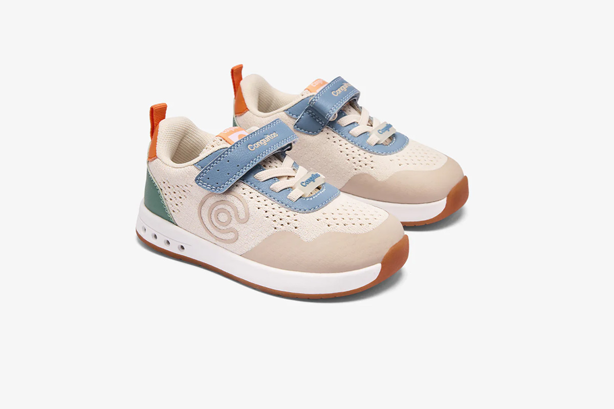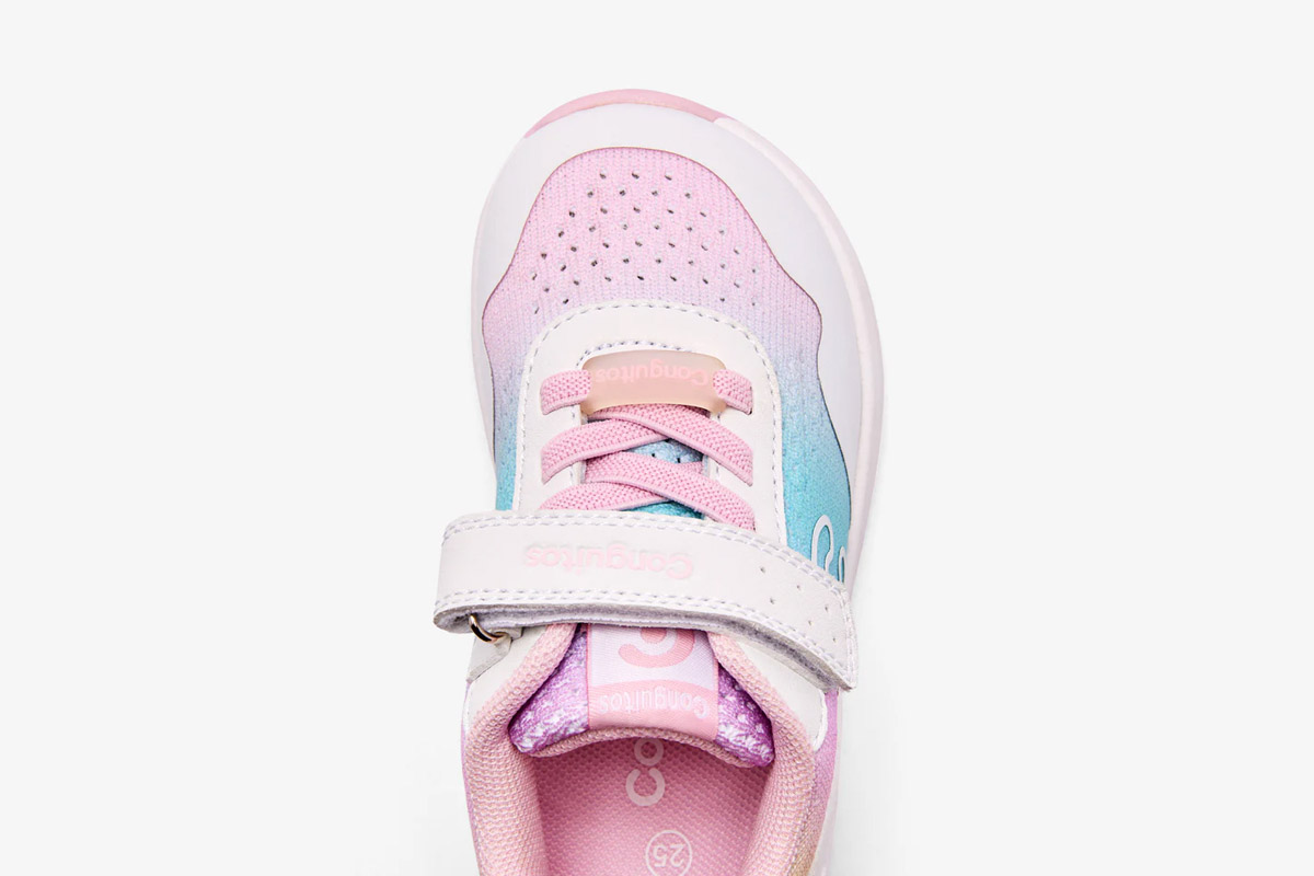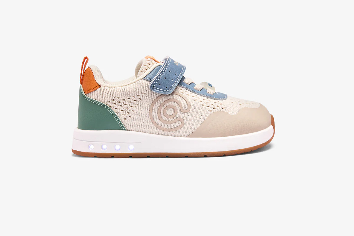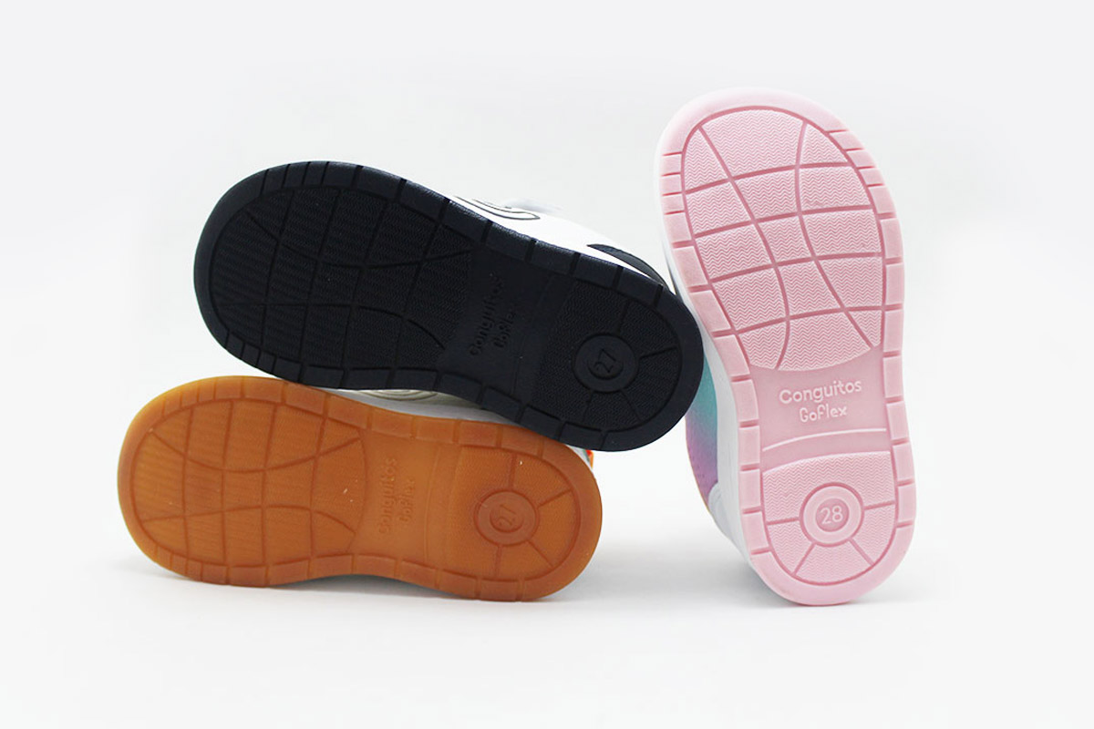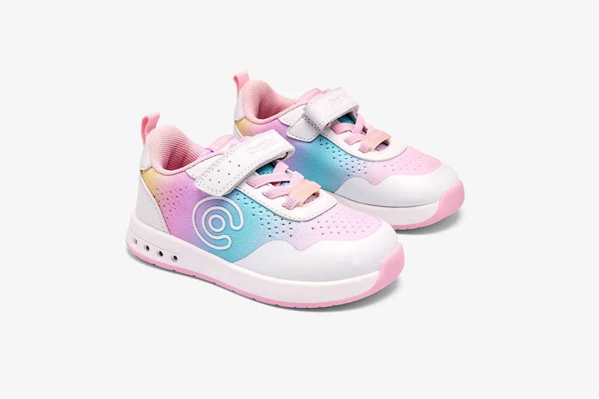Estas zapatillas barefoot con luces de la línea Goflex, de la marca Conguitos, están disponibles en tres combinaciones: beige combinando con azules y verdes, blanco combinado con azul marino y rojo, y rosa combinando con azules y verdes. Están pensadas para acompañar el día a día con comodidad, flexibilidad y respeto por el desarrollo natural del pie infantil.