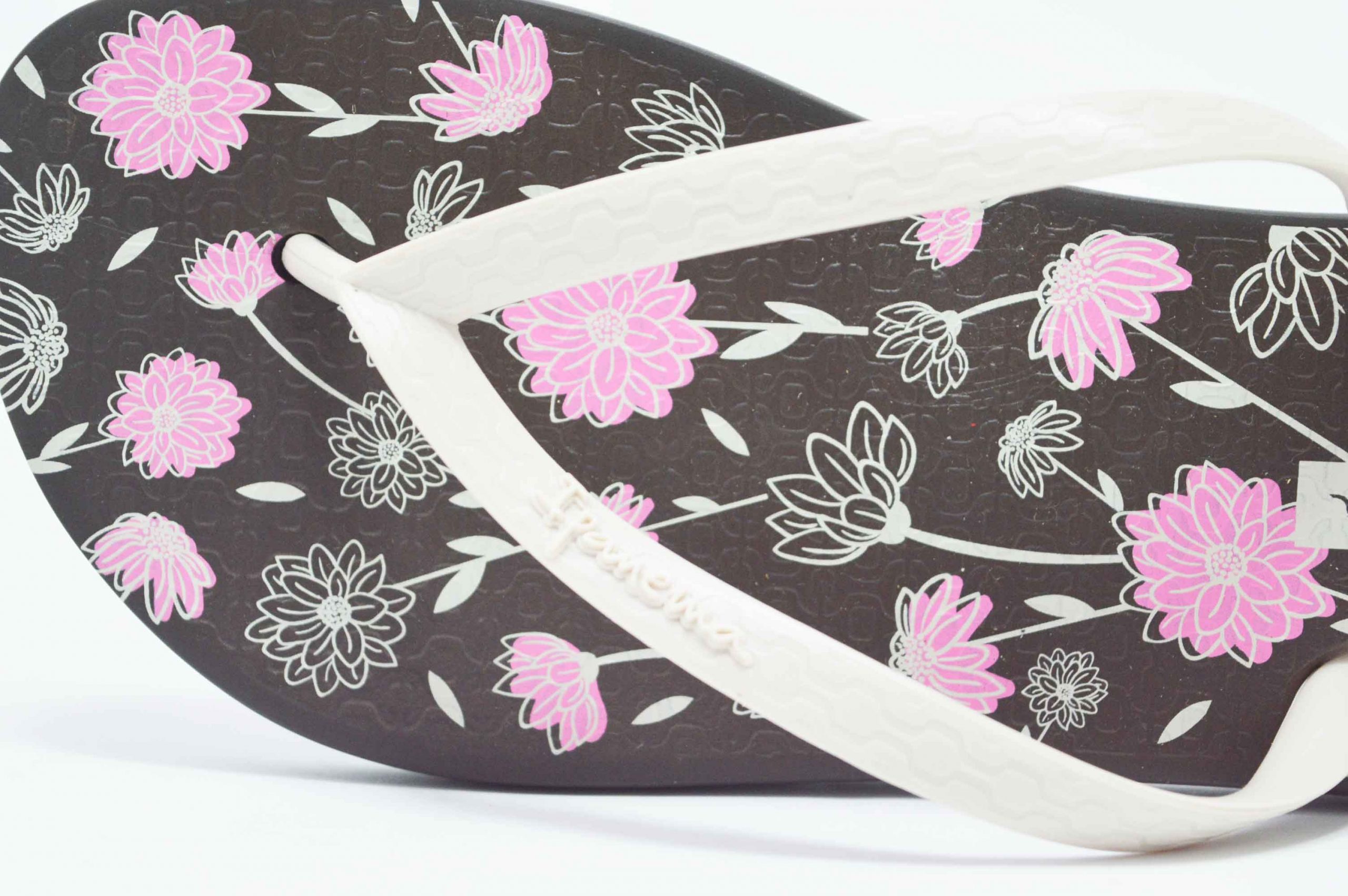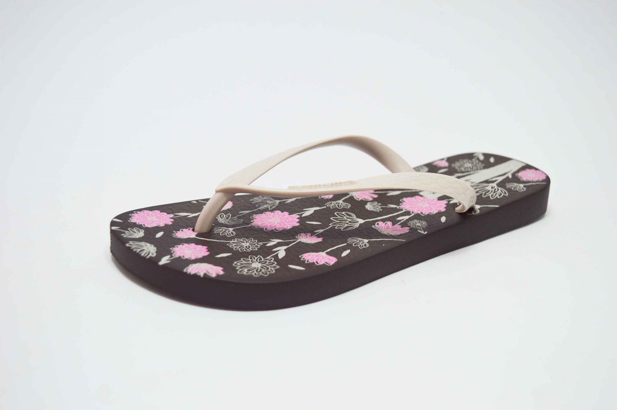 Playeras de dedo de la marca Ipanema, con la planta en marrón con flores combinadas en rosa y blanco. La clásica sandalia de playa hawaiana.