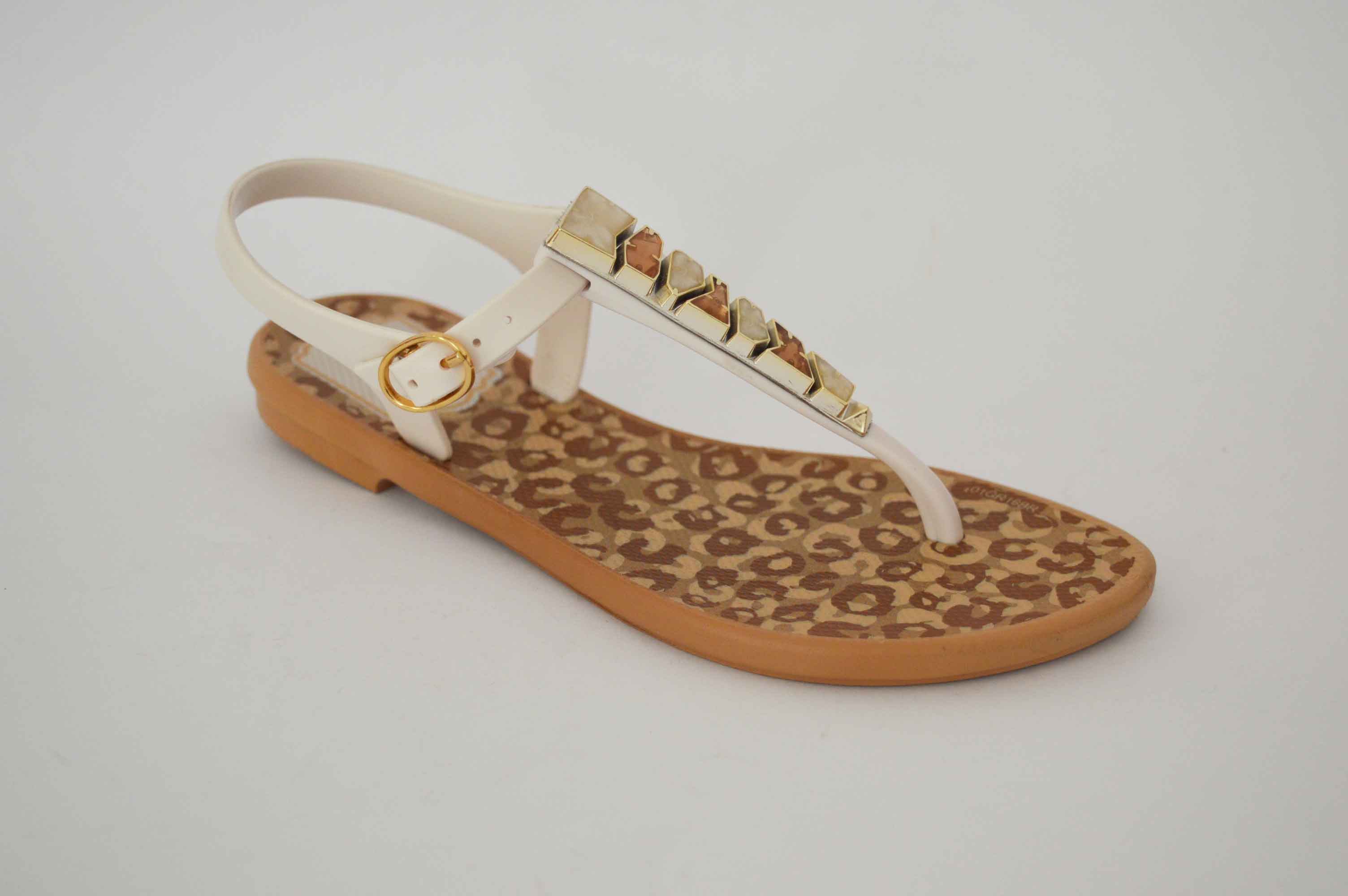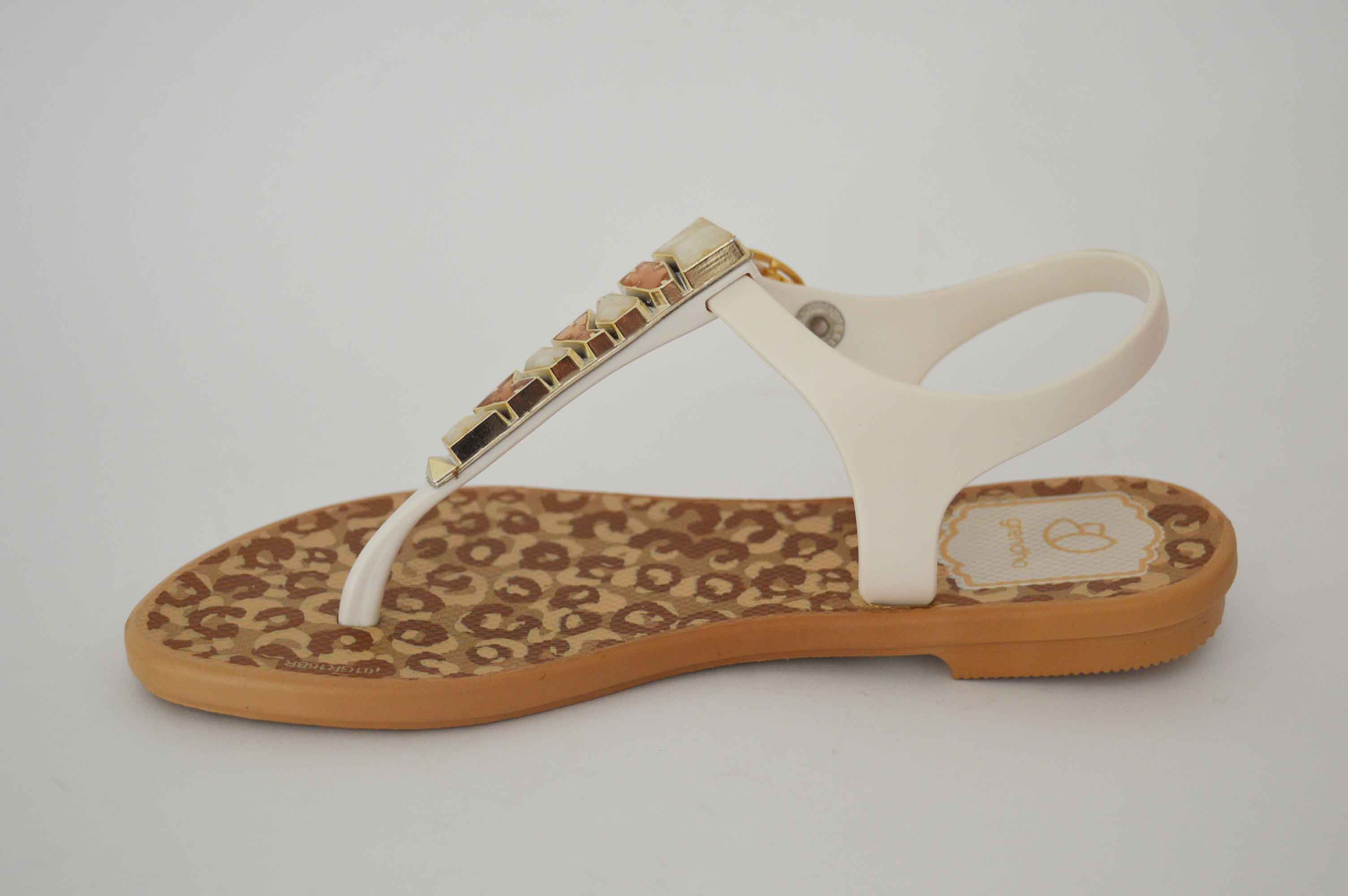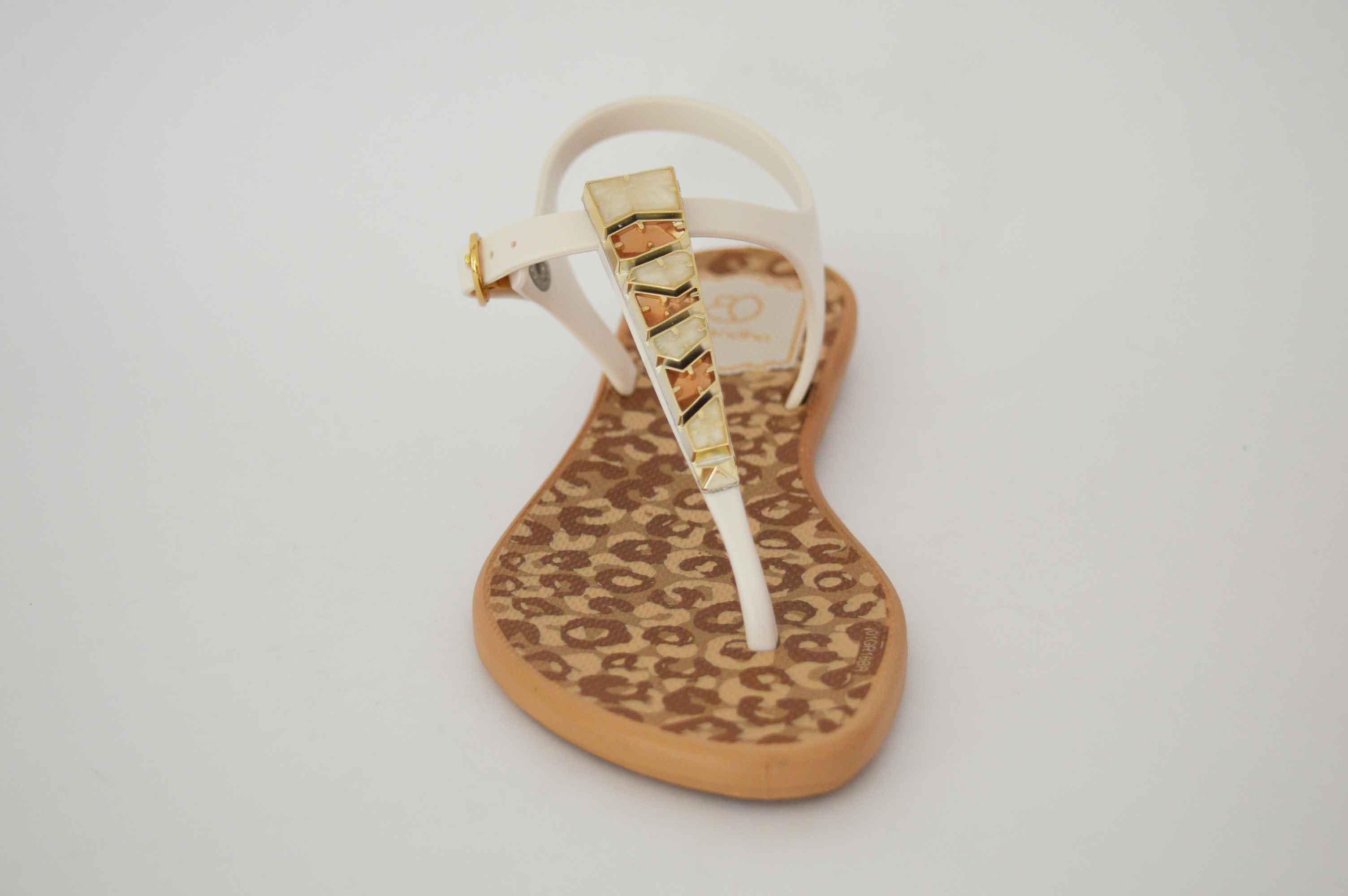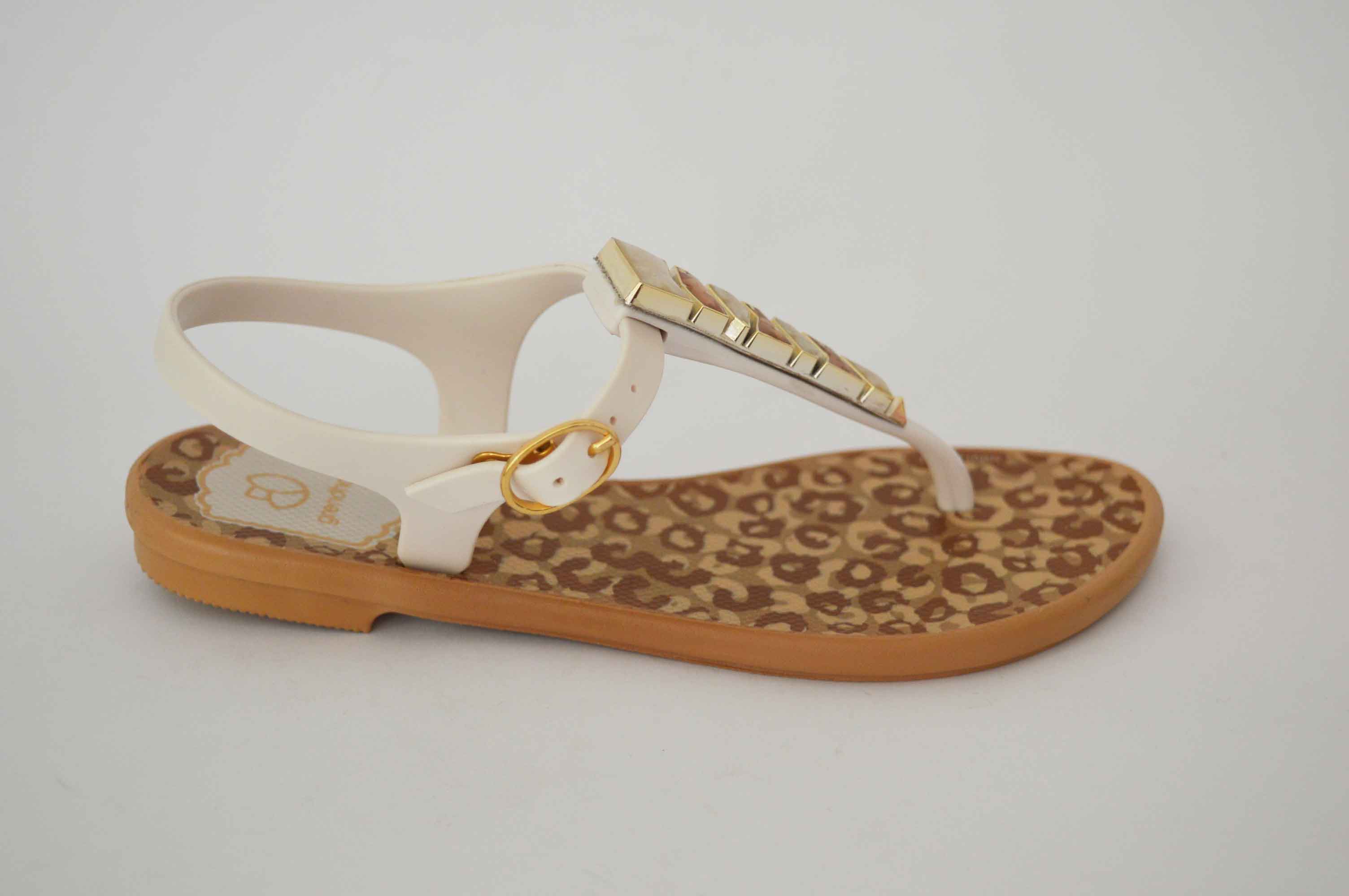 Sandalia de playa de dedo, agarrada al tobillo con hebilla y unas bonitas perlas. Disponible en dos colores, beige con tonos dorados y marrones y en rosa fuxia con tonos marrones y morados. De la marca Grendha.