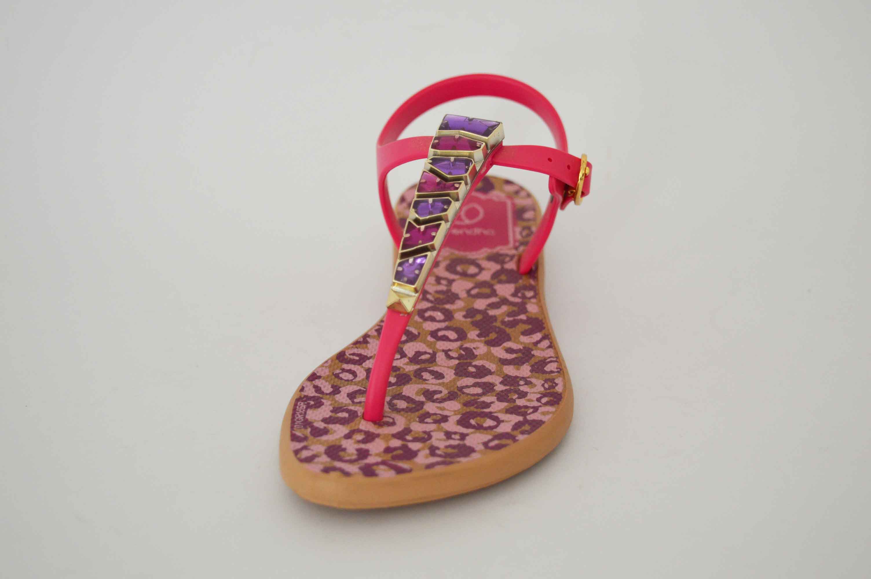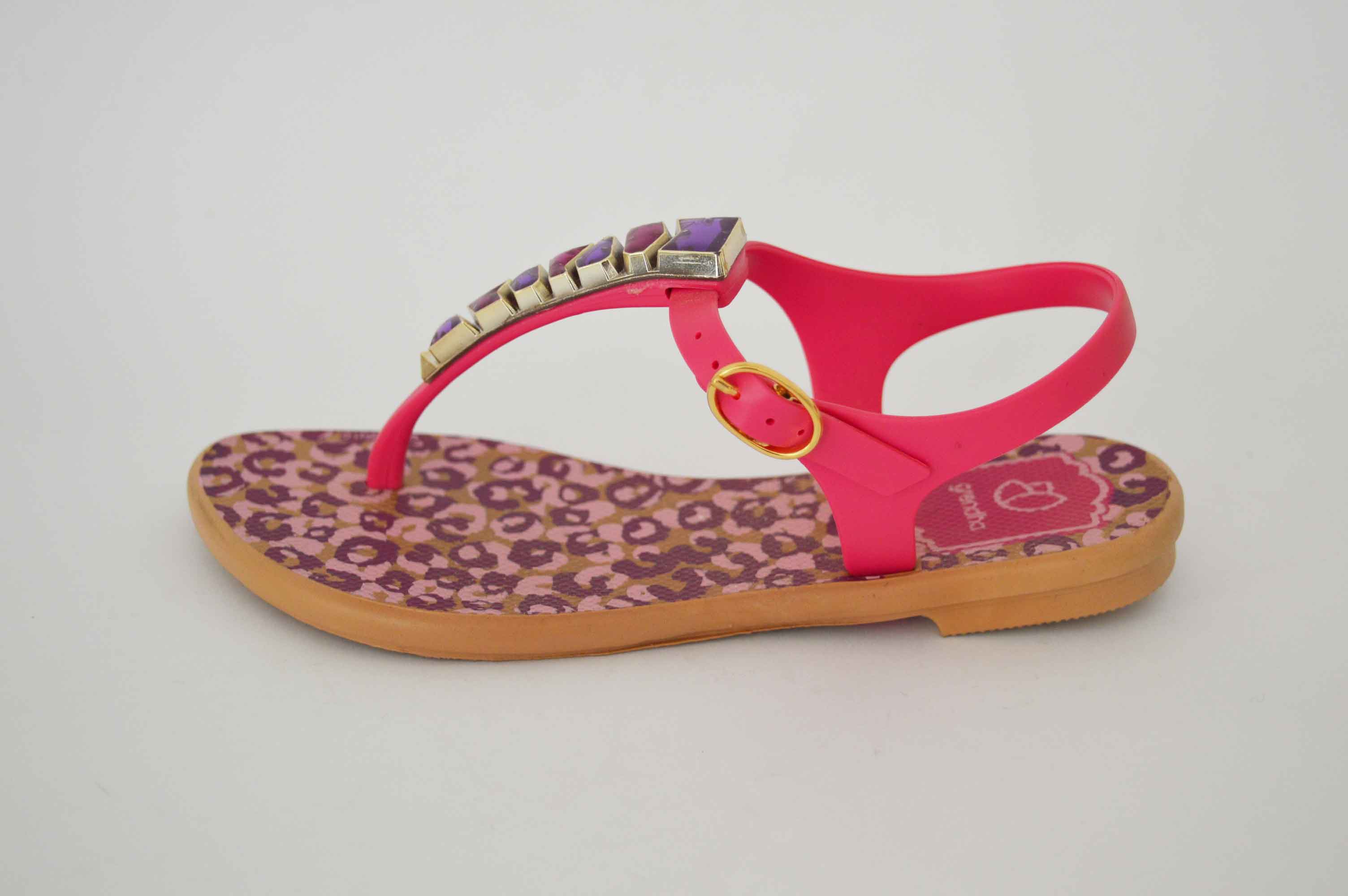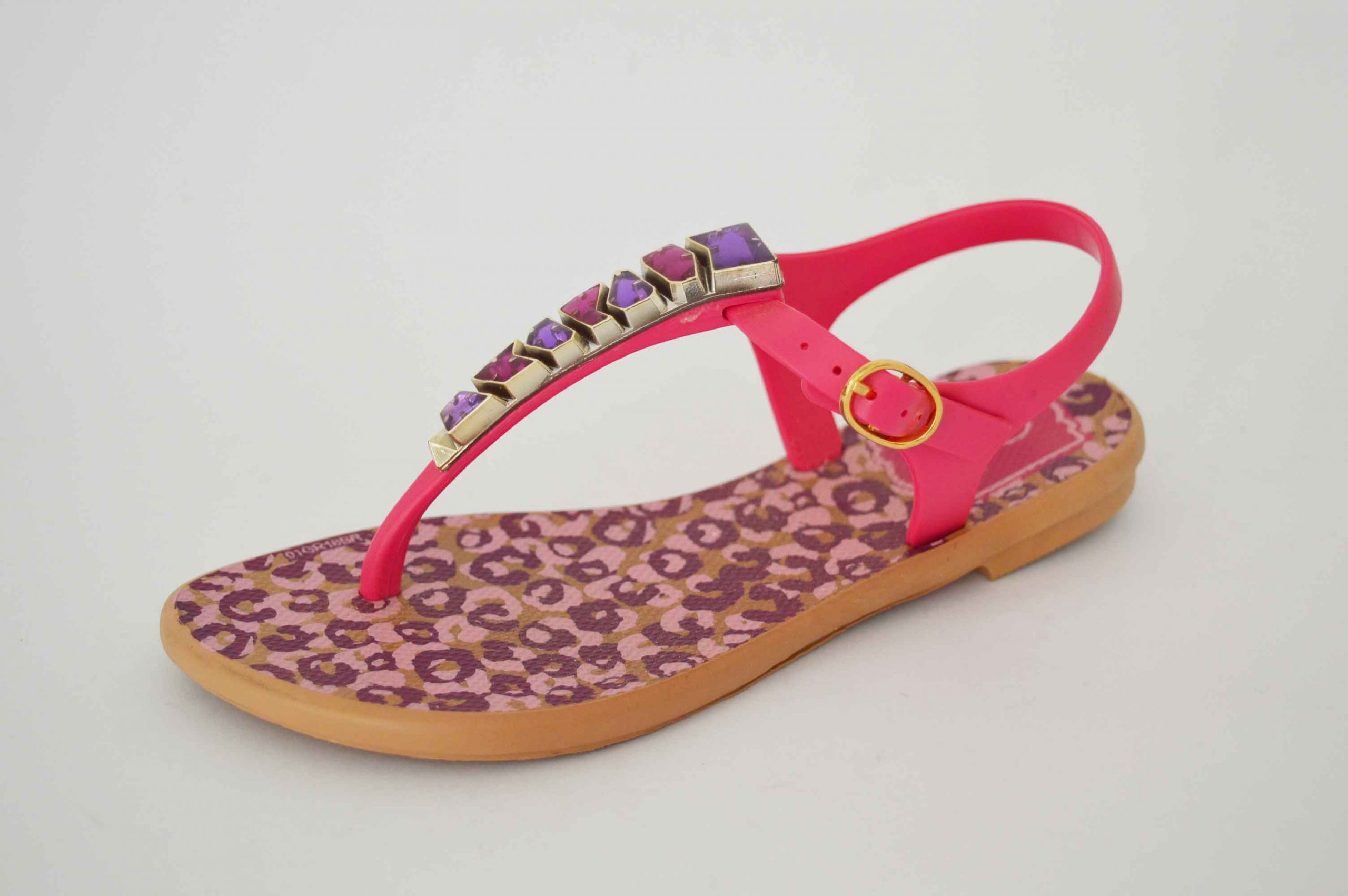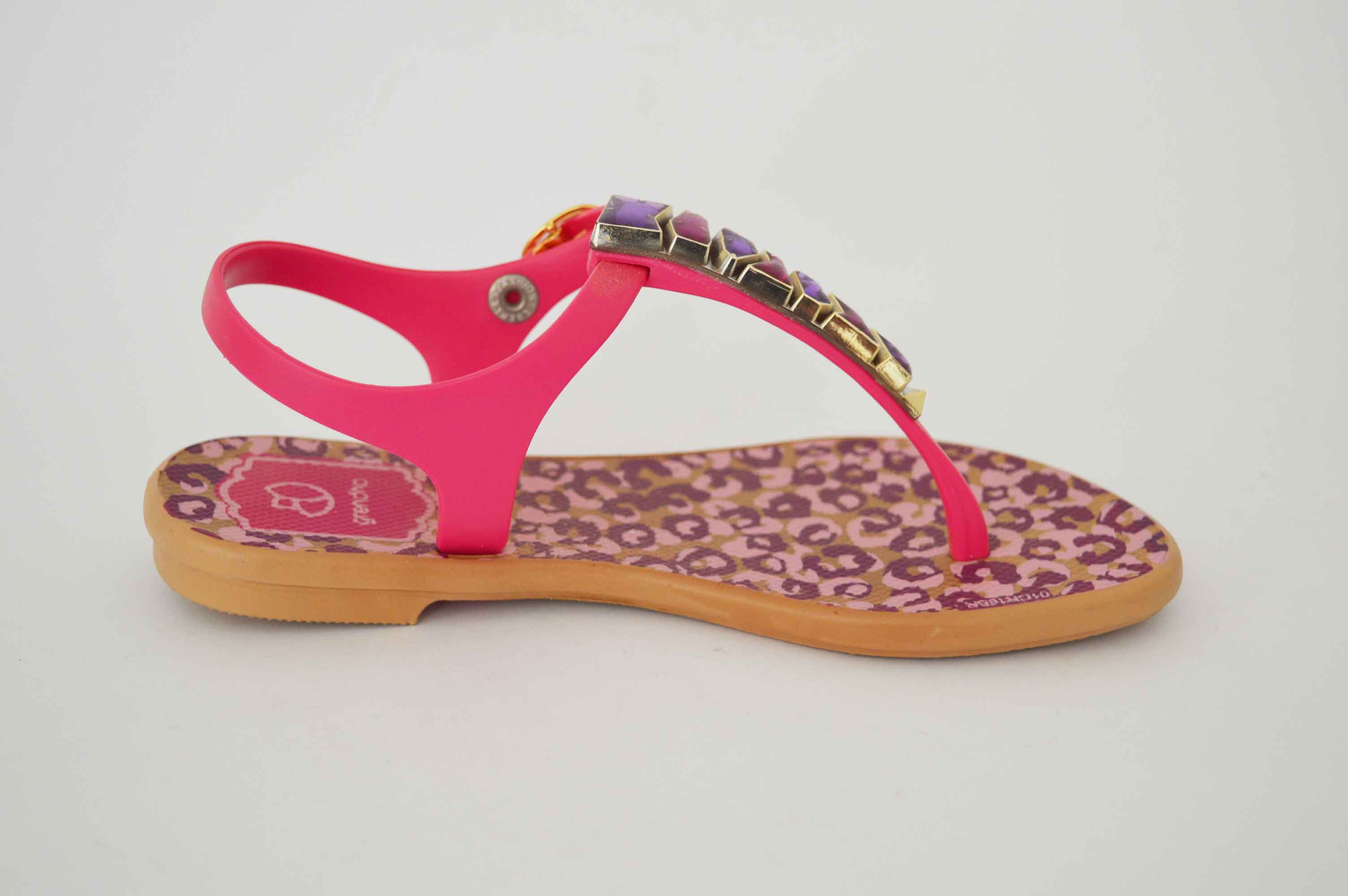 Sandalia de playa de dedo, agarrada al tobillo con hebilla y unas bonitas perlas. Disponible en dos colores, beige con tonos dorados y marrones y en rosa fuxia con tonos marrones y morados. De la marca Grendha.