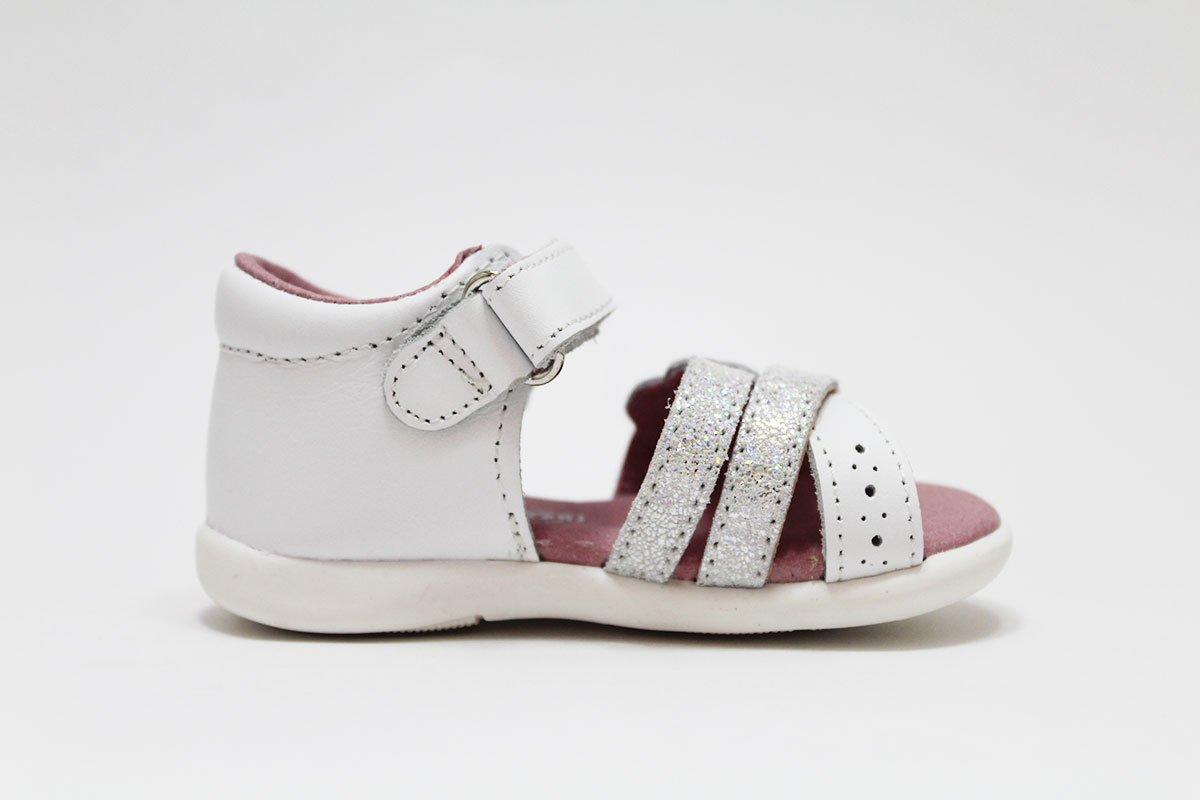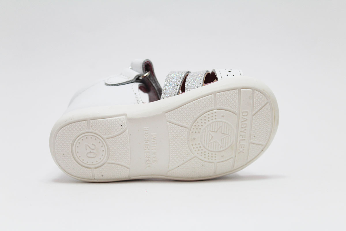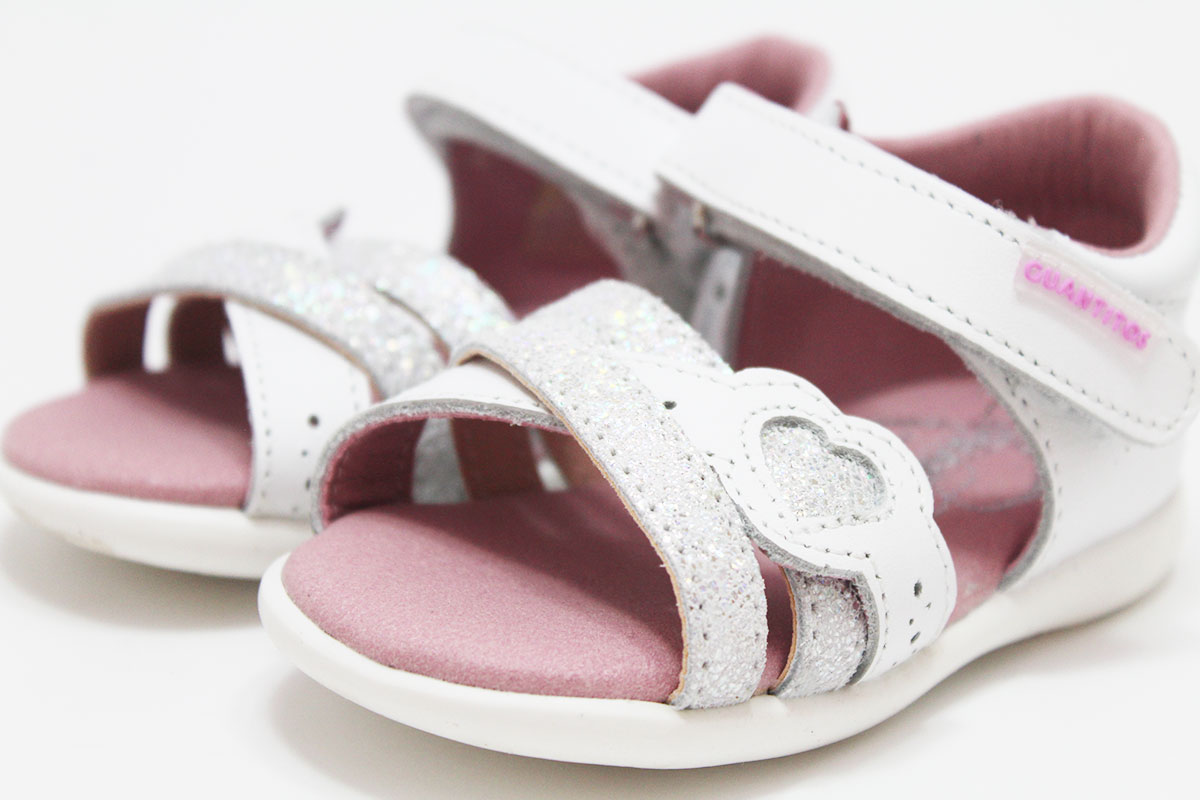 Preciosa sandalia con cierre adherente para la sujeción del pie. Tiene un diseño de 3 tiras combinadas y cruzadas en color blanco y plata purpurina. Con un detalle de un corazoncito en una de las tiras. Gracias a su suela flexible, ligera y antideslizante, es ideal para los primeros pasos. Su interior es muy blandito, transpirable y anti-bacteriano, para evitar el mal olor. Además, es antialérgica, hipoalergénica y resistente al roce.