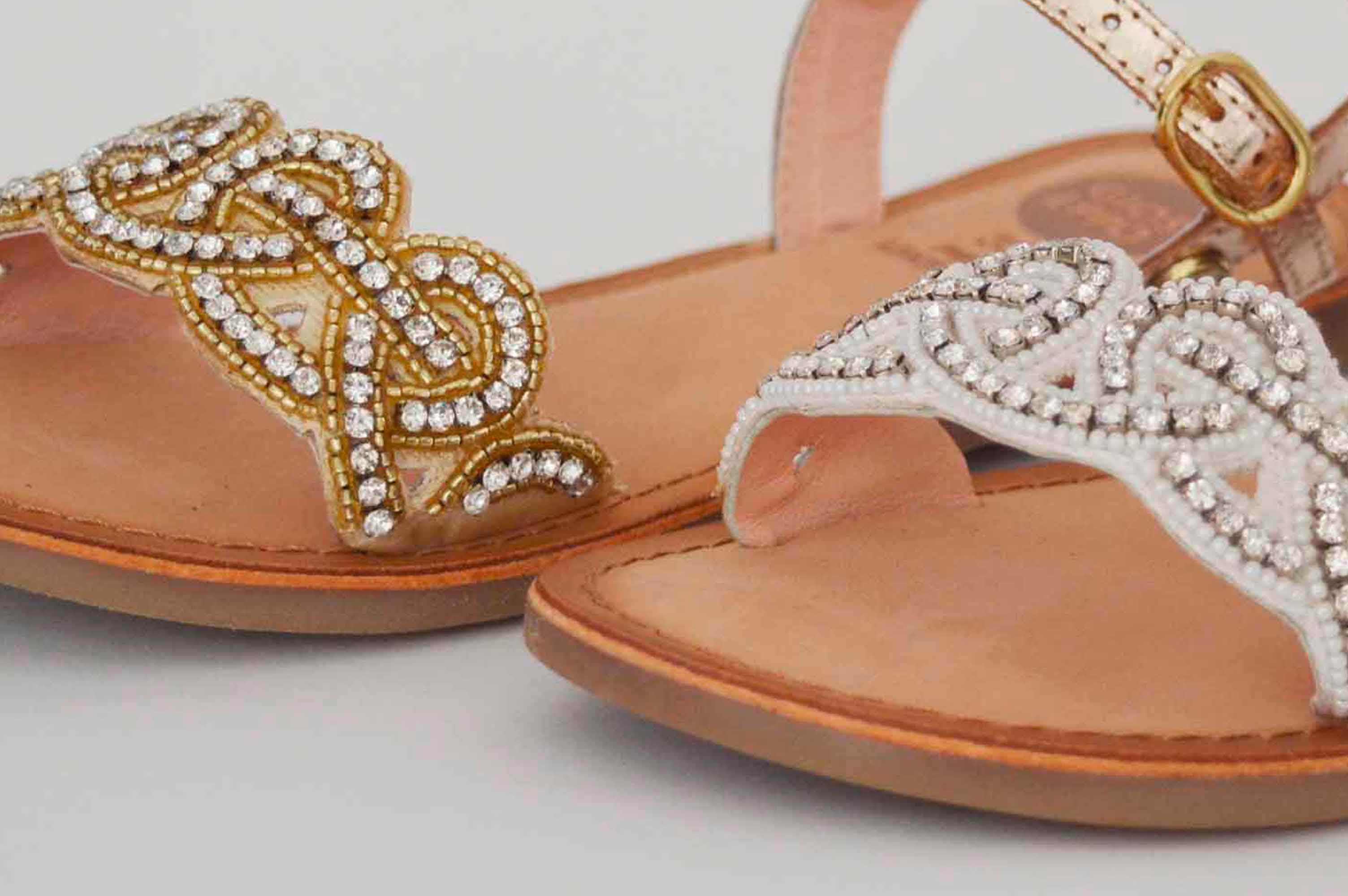 Sandalia de niña, en color dorado y en blancas combinadas con perlitas plateadas. Son sandalias sencillas, pero quedan muy bonitas puestas. Fácil de combinar con todo, desde lo más informal para el día a día hasta para alguna ocasión más especial.