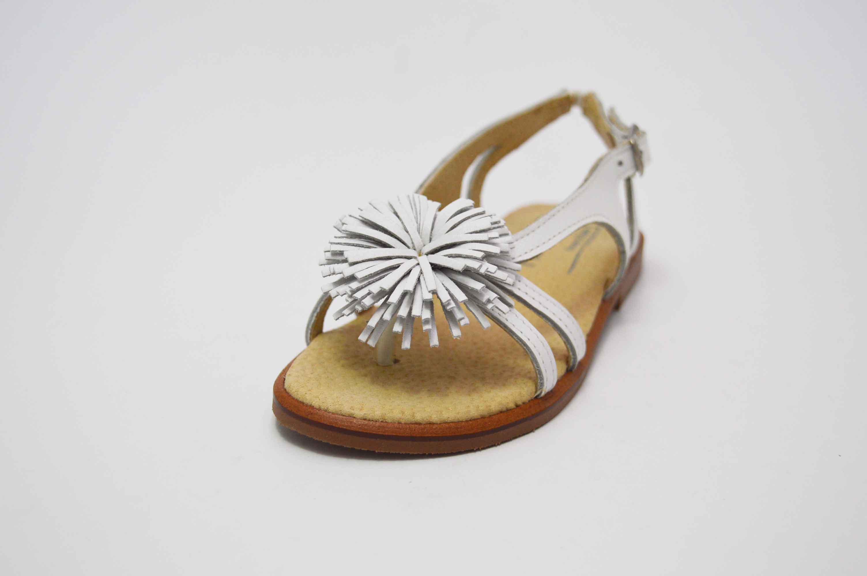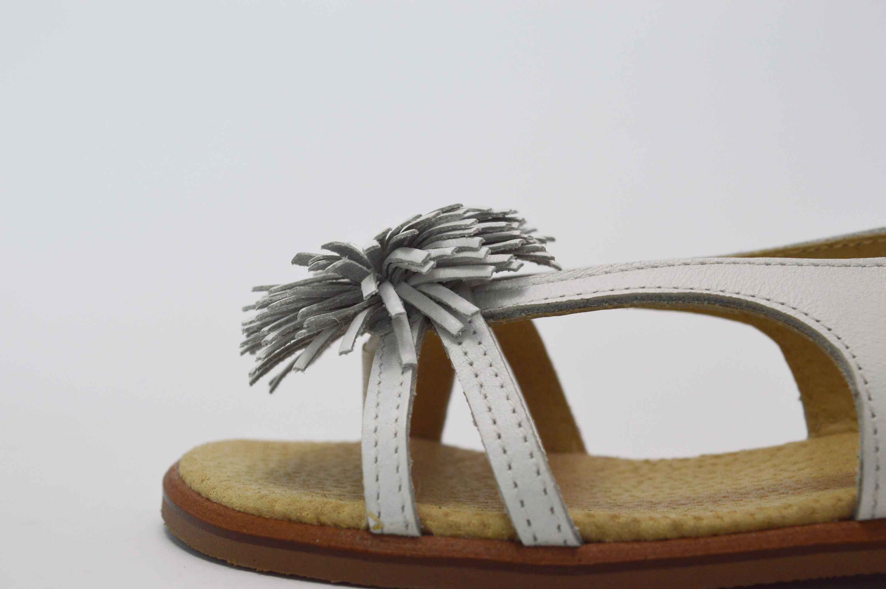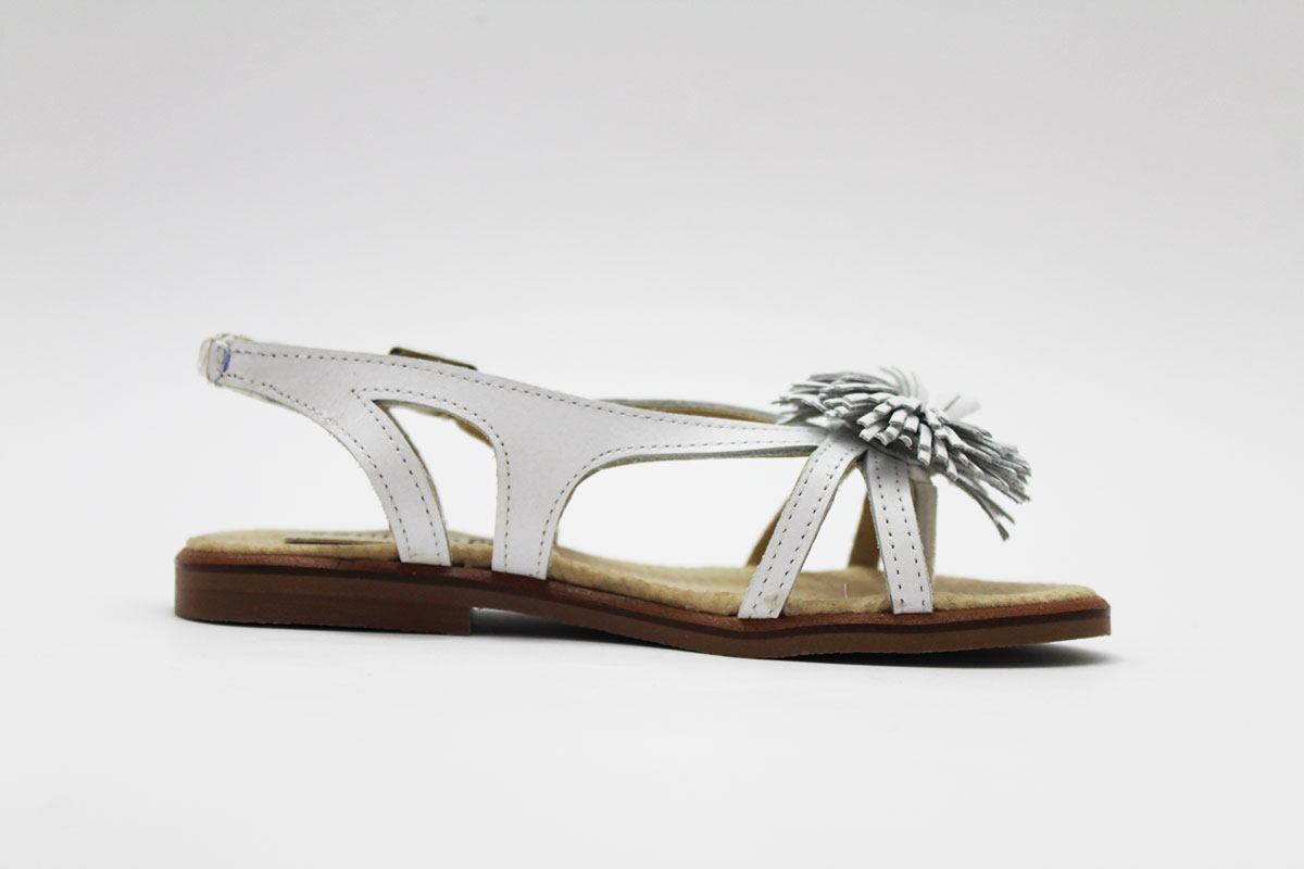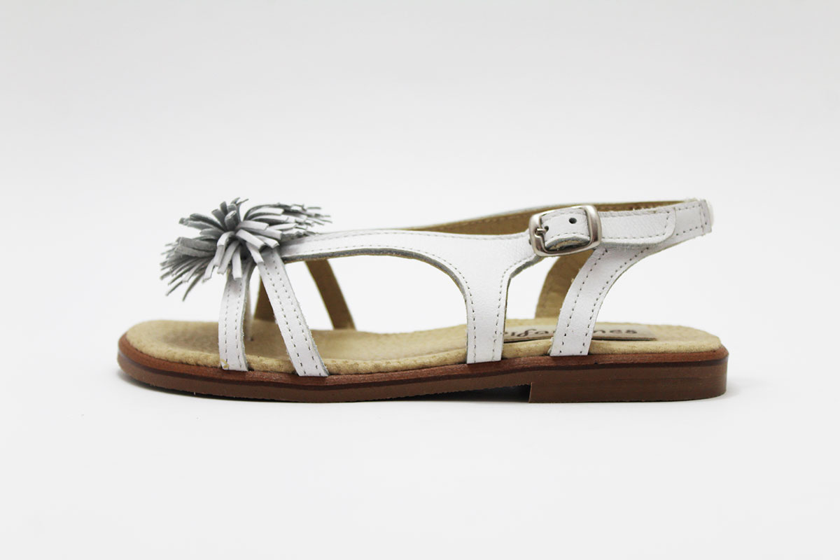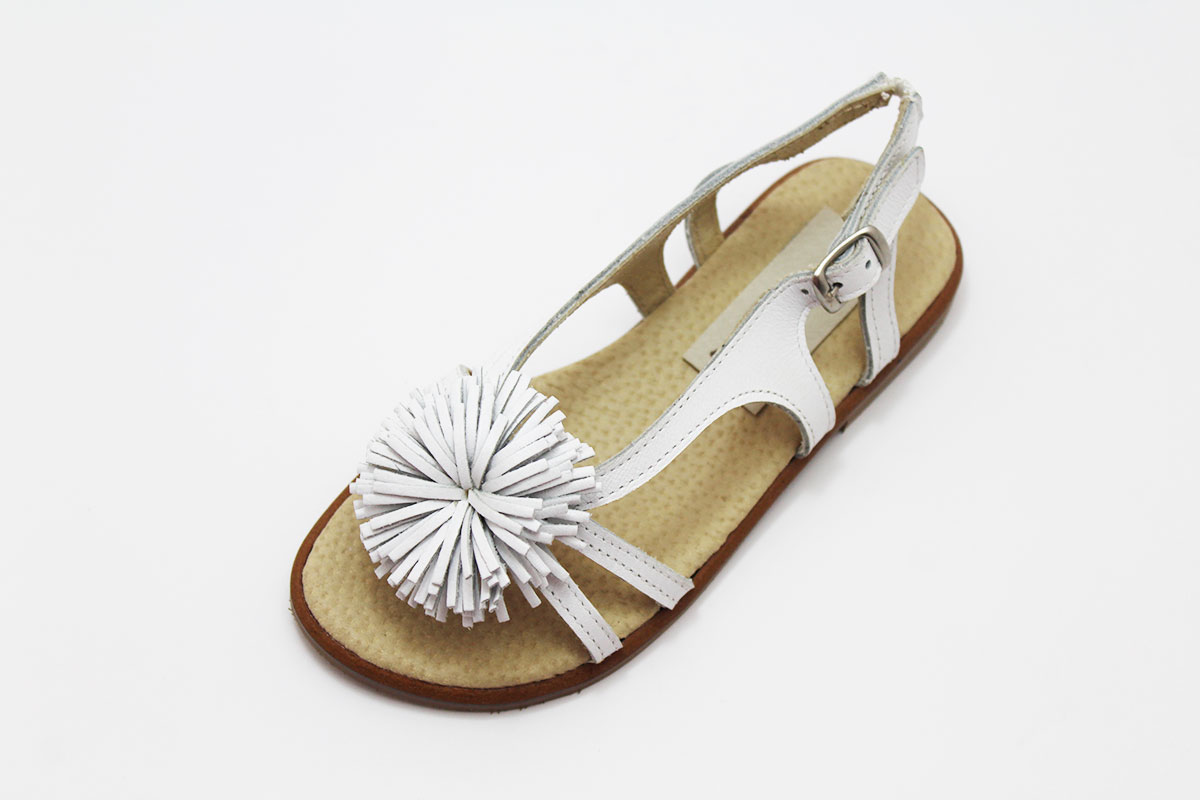 Sandalia de diseño actual, muy versátil, para usar en muchas situaciones: eventos y celebraciones, ceremonias o simplemente para el día a día.  La sandalia esclava blanca esta fabricado en piel natural 100 %, lleva unas tiras y en el centro un pompón. La suela es de goma, imitando la suela de cuero. La planta esta en piel acolchada. Disponible desde la talla 24 hasta 35. Es un producto 100 % español.