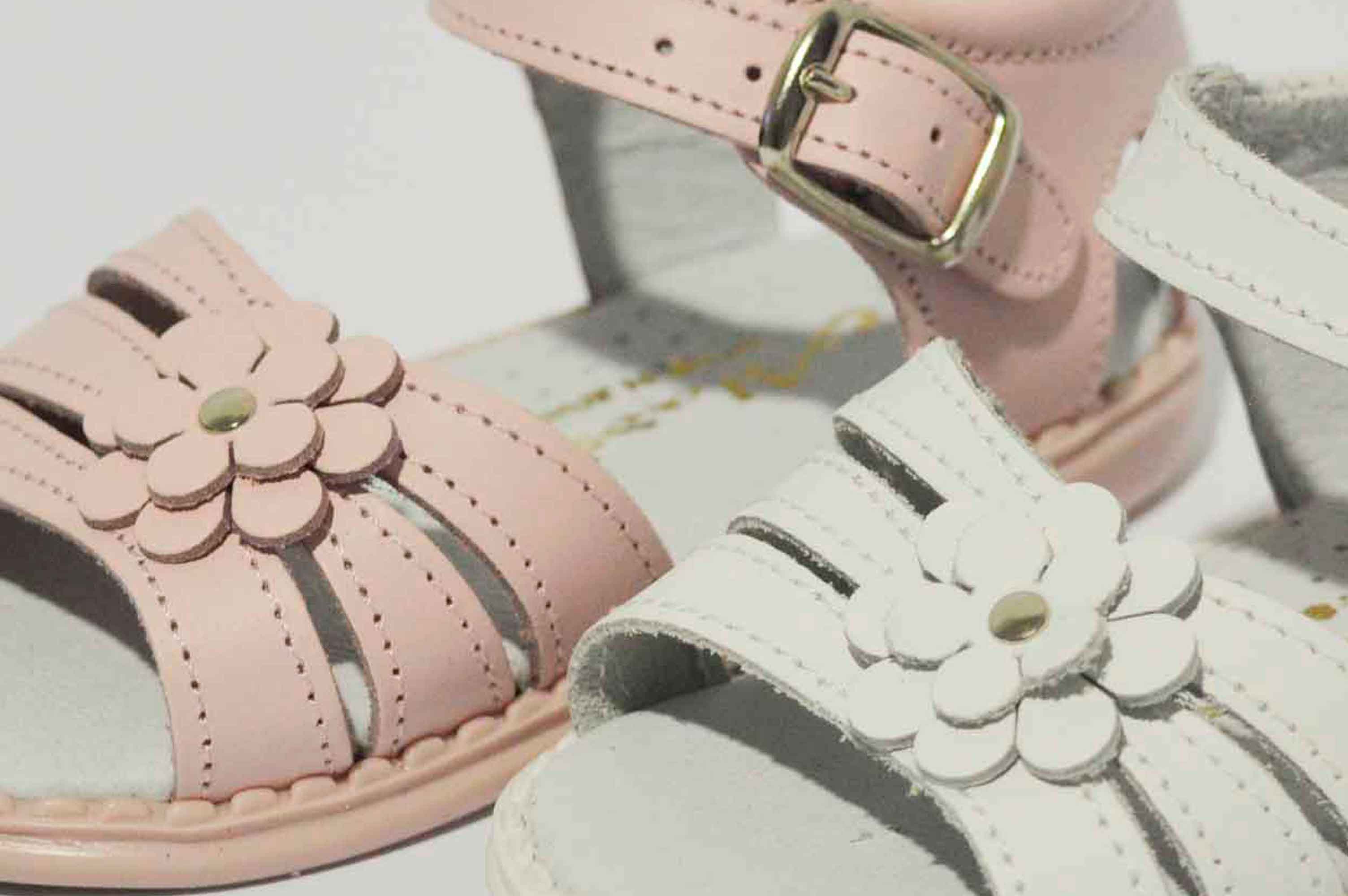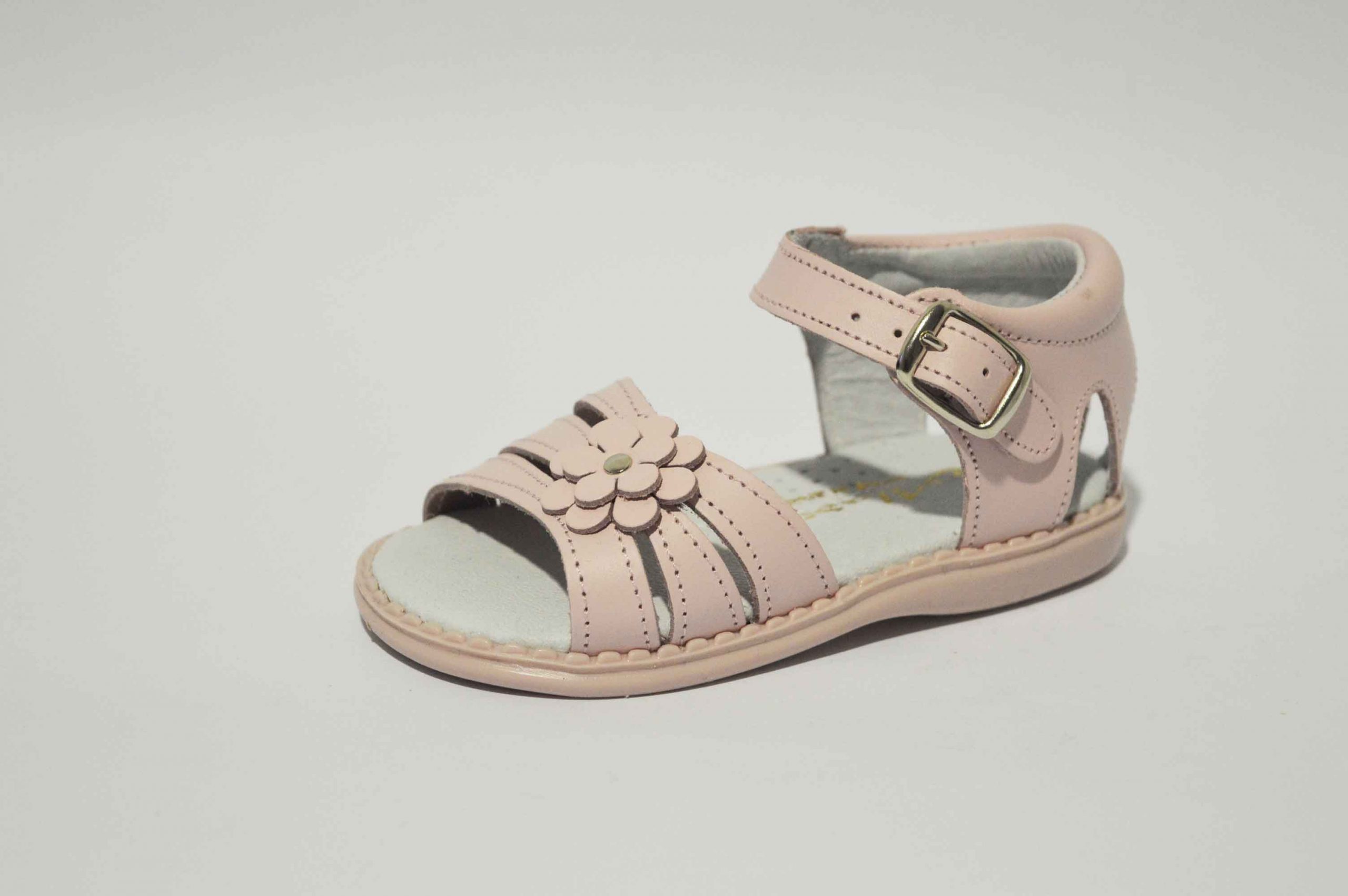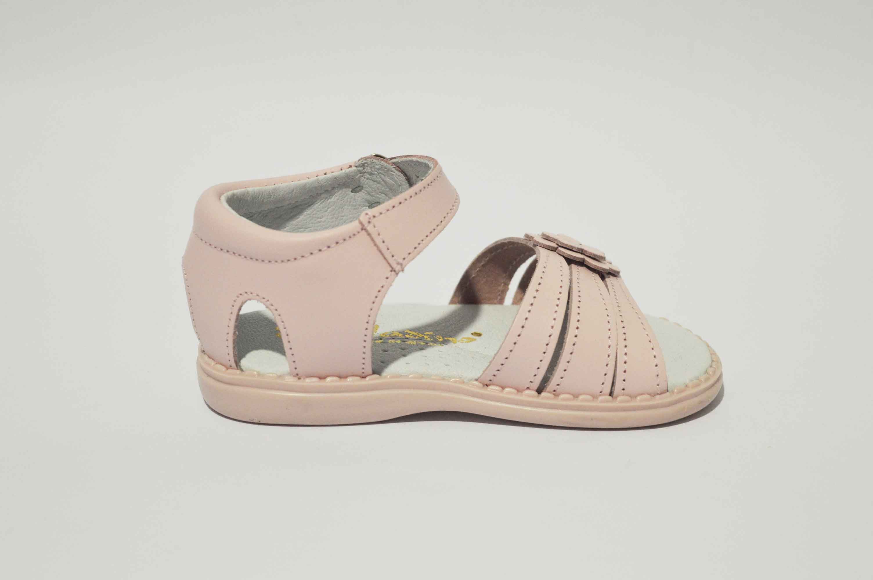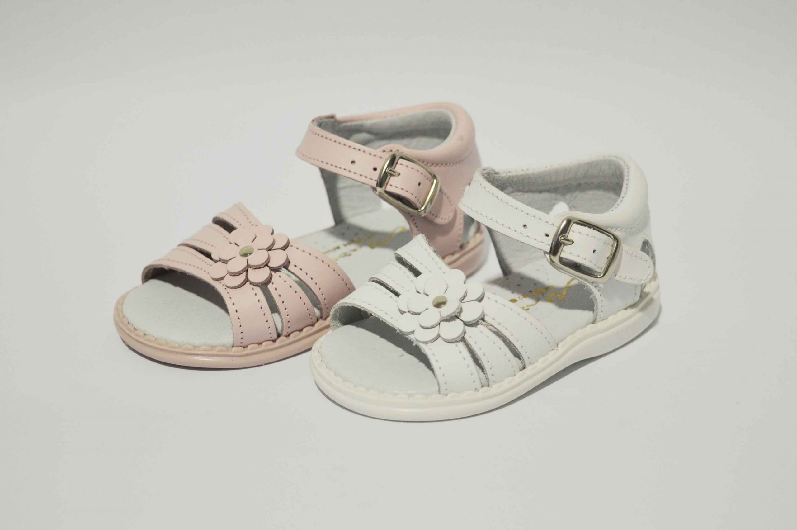 Sandalias con talón cerrado, muy cómodas y adaptadas para las niñas. Sandalia con tres tiras y decorada con una bonita flor. Disponible en rosa y en blanco, y como siempre, hecho en piel.