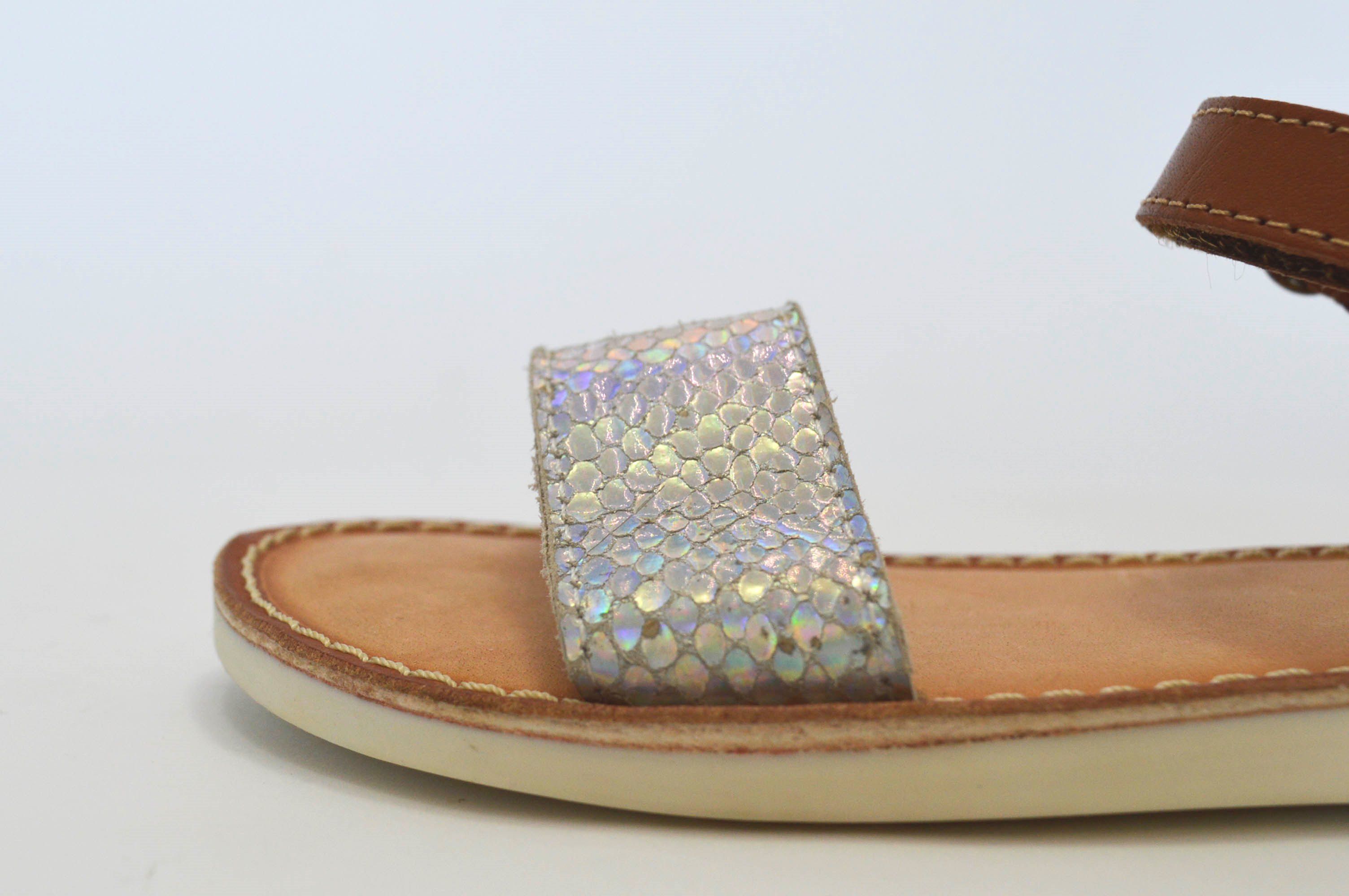 Zapato sandalia para niñas, fabricadas en piel natural. Esta bonita sandalia tiene la pala con brillo lo cual les va a gustar mucho a todas las niñas… El talón lleva correa con cierre adherente para mayor comodidad. La suela es de goma antideslizante y la planta es de cuero, muy agradable en los meses más calurosos porque absorbe muy bien el sudor de la piel.