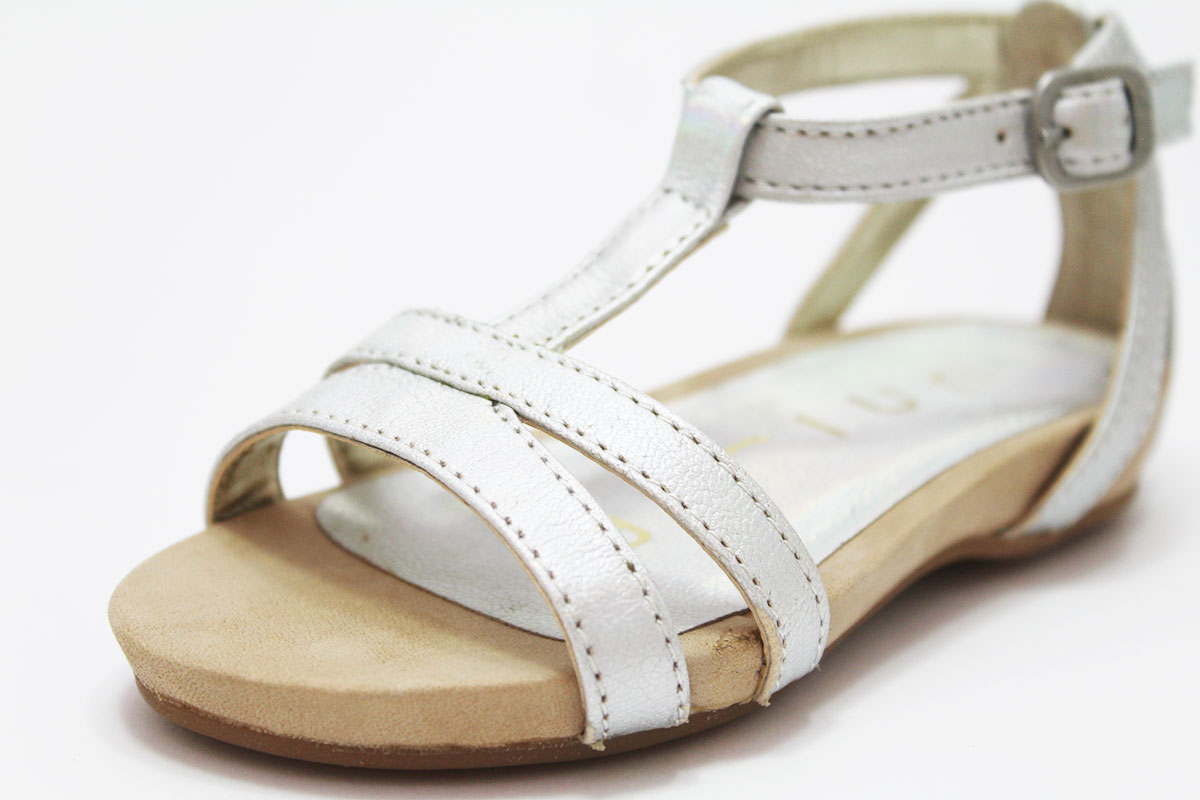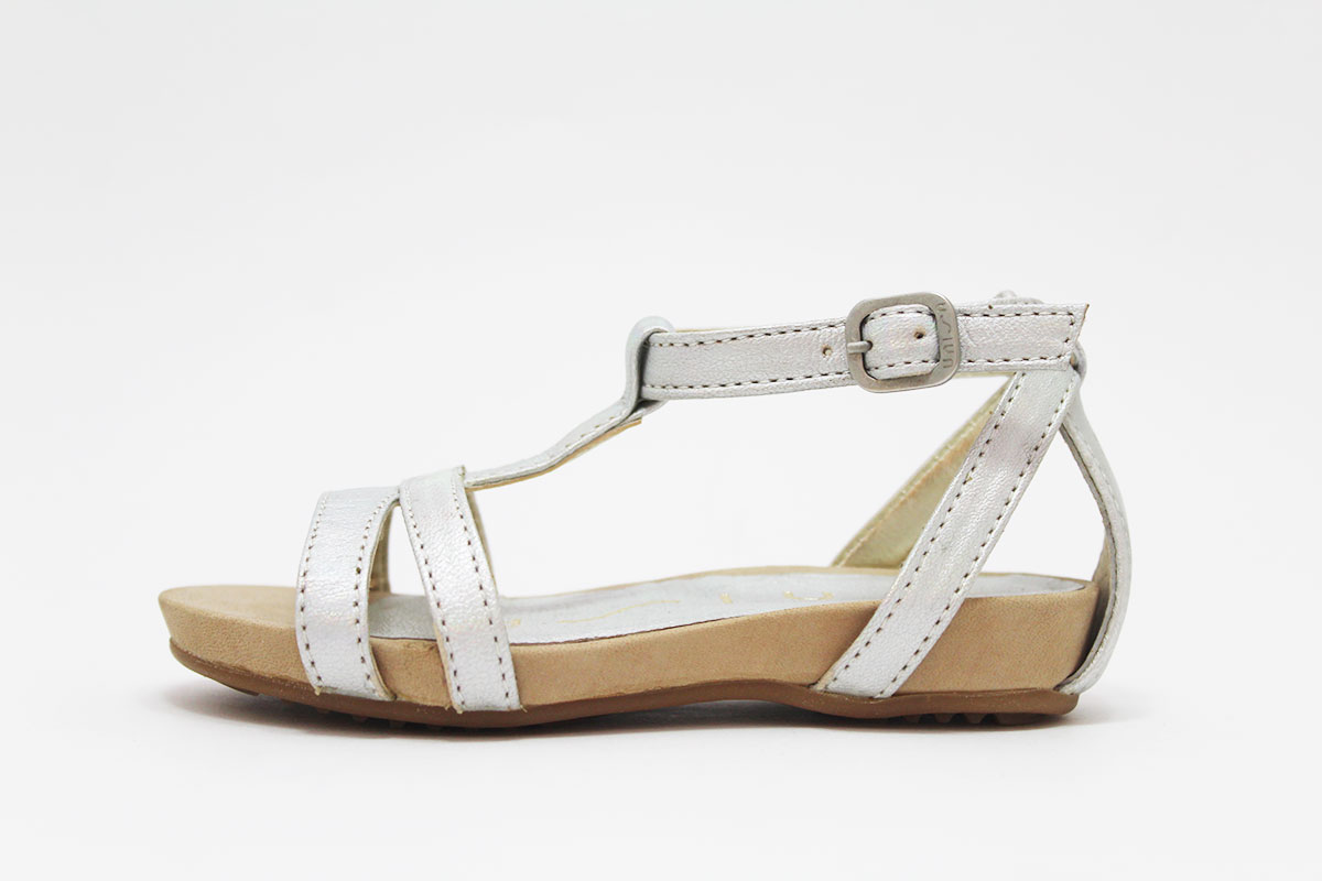 Preciosa y elegante sandalia en piel natural. Disponible en color plata, un color que combina con todo. Con tiras en la pala y cierre de hebilla, modelo de la conocida marca española Unisa.