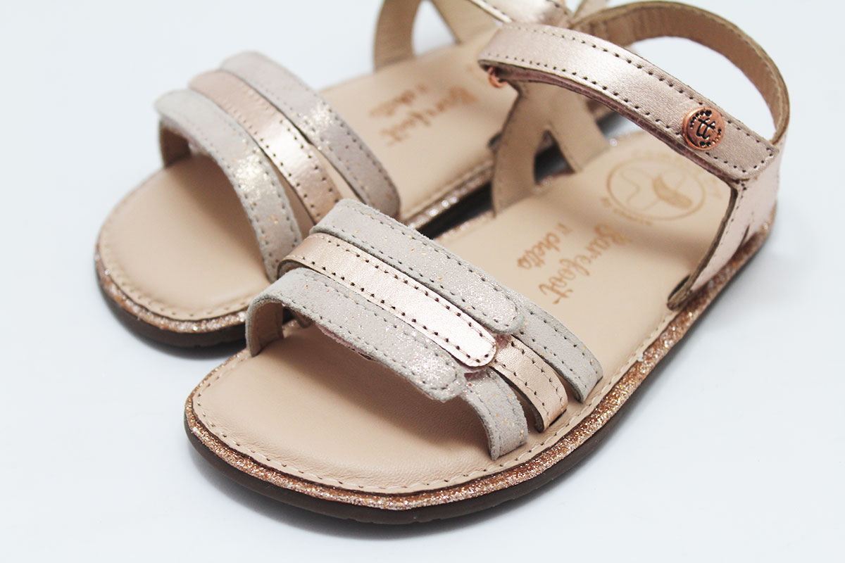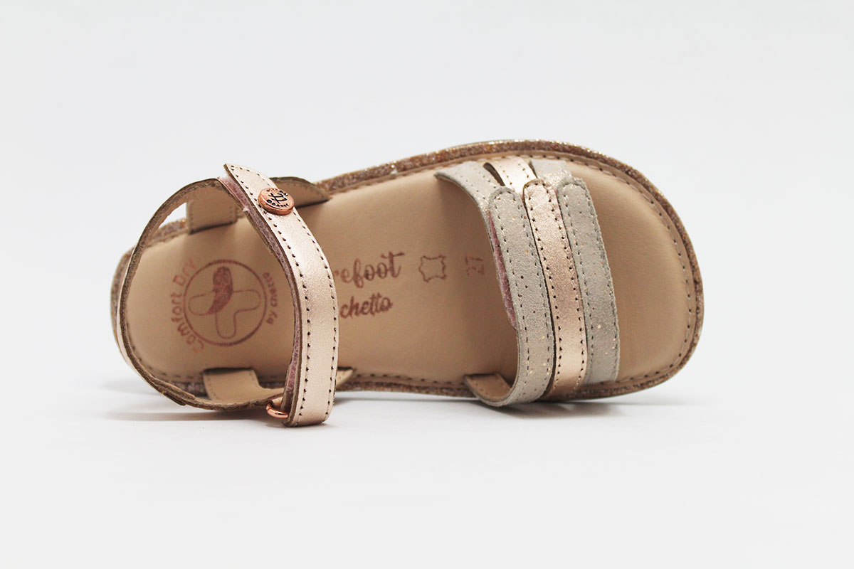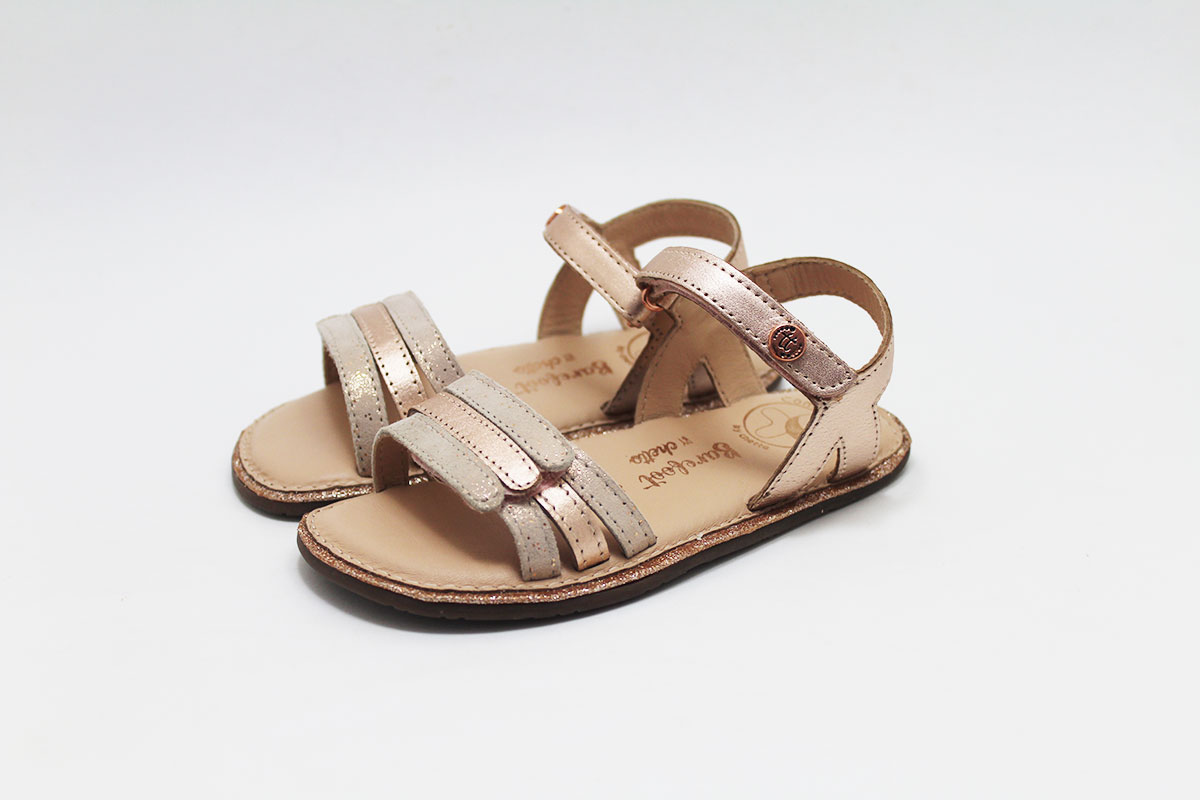 Sandalia de tiras para niña, de la marca Barefoot by Chetto. Disponible en dos combinaciones: tiras blancas combinadas con plata y tiras doradas combinadas con rosa. Este modelo de sandalias respetuosos están pensadas para cuidar los pies durante su desarrollo y mantenerlos sanos durante su crecimiento. Una perfecta opción para usarlas todo el verano. Gracias a su doble cierre se ajusta perfectamente a todos los tipos de empeines. Cuenta con un cierre en el empeine y en el tobillo.