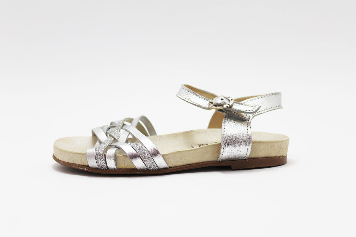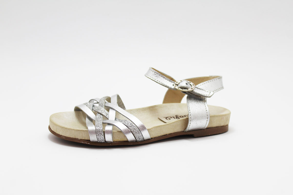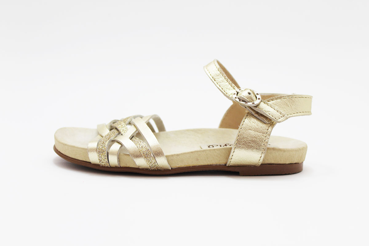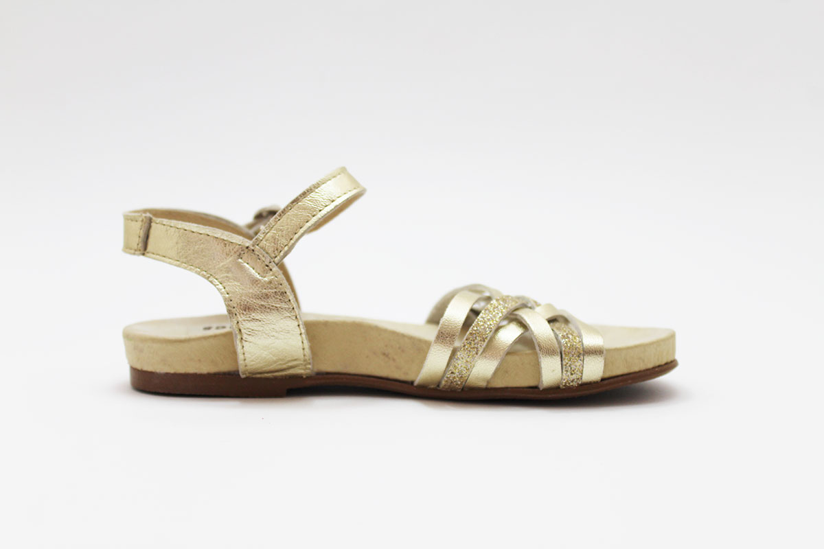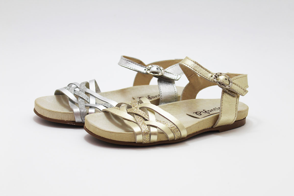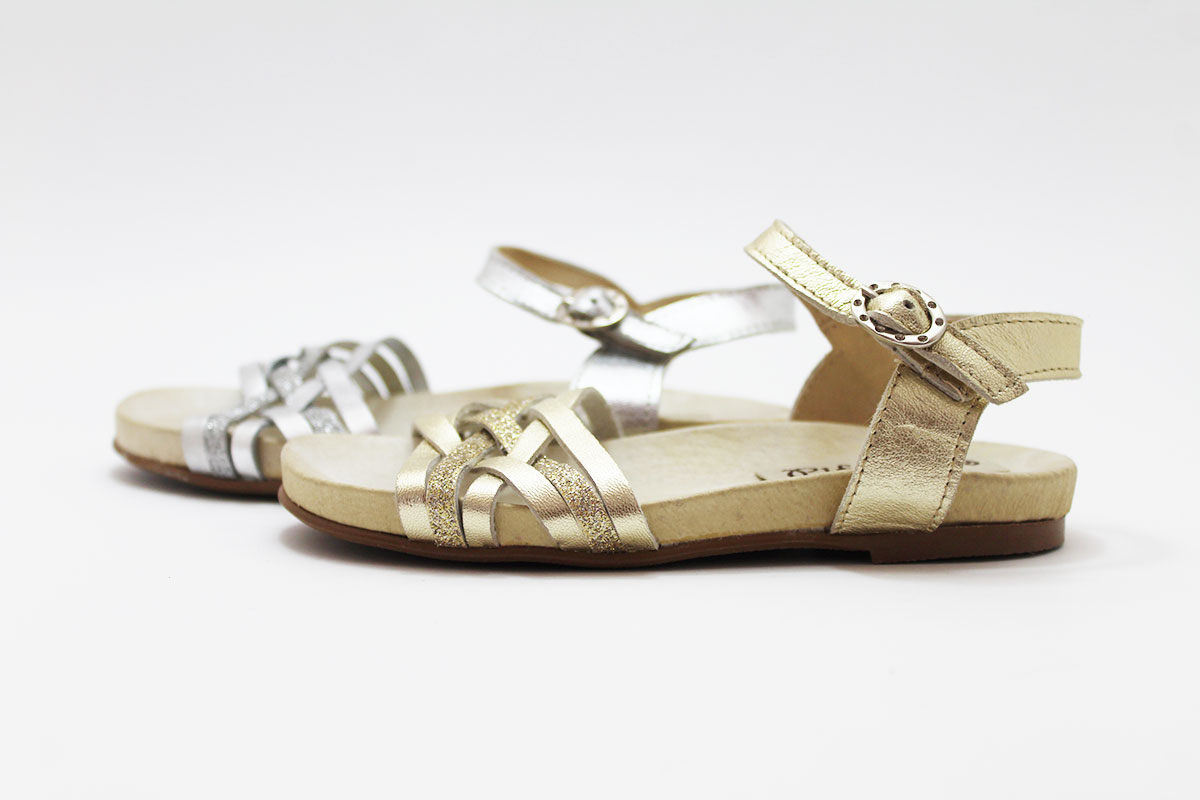 Sandalias de piel con tiras combinadas en glitter y en piel, dorada y plateada. Estos detalles de brillos son los que más le gusta a todas las niñas! Genial con cualquier modelito para que las princesas de la casa vayan a la última sin tener que renunciar a la comodidad gracias al piso bio.
