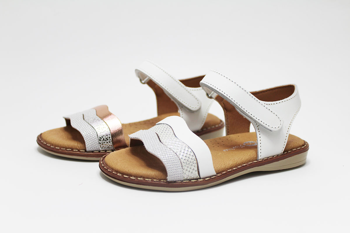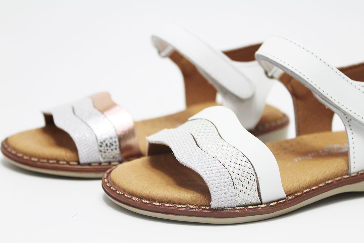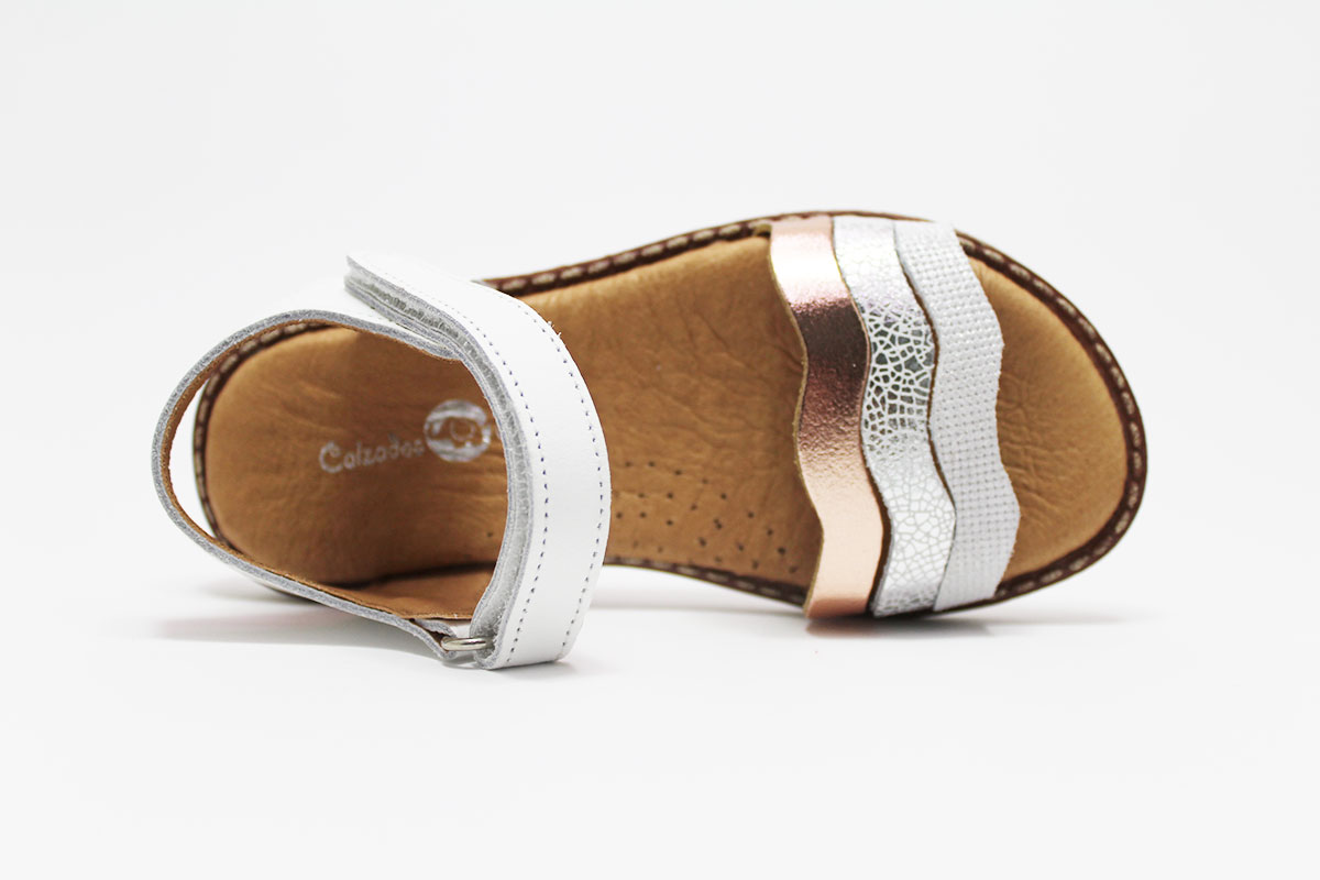 Sandalias para niña con tres preciosas tiras onduladas. Tiene un cómodo cierre adherente para que puedan ponérselo y quitárselo ellas solas con una mayor autonomía.