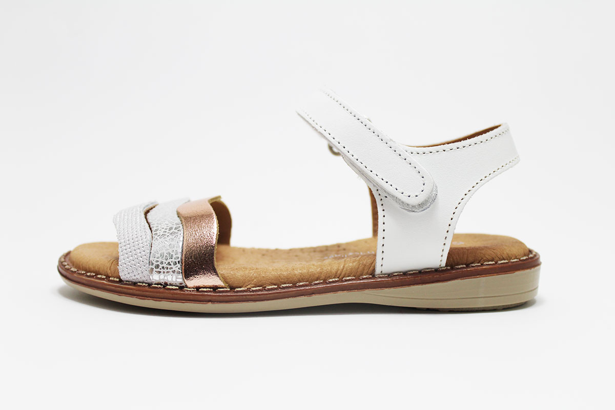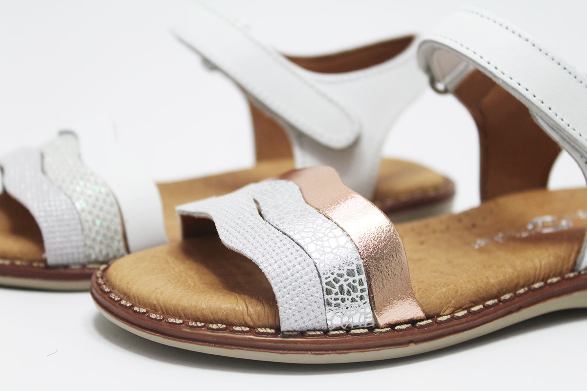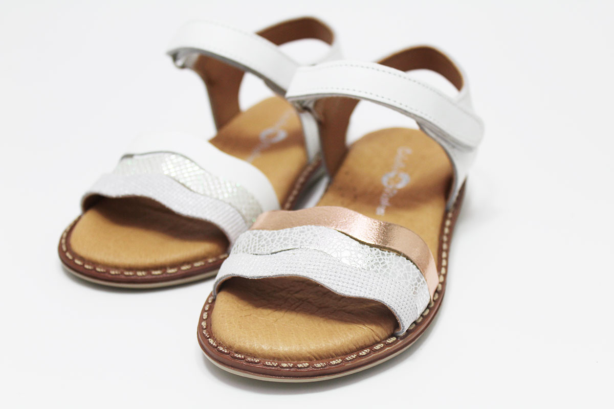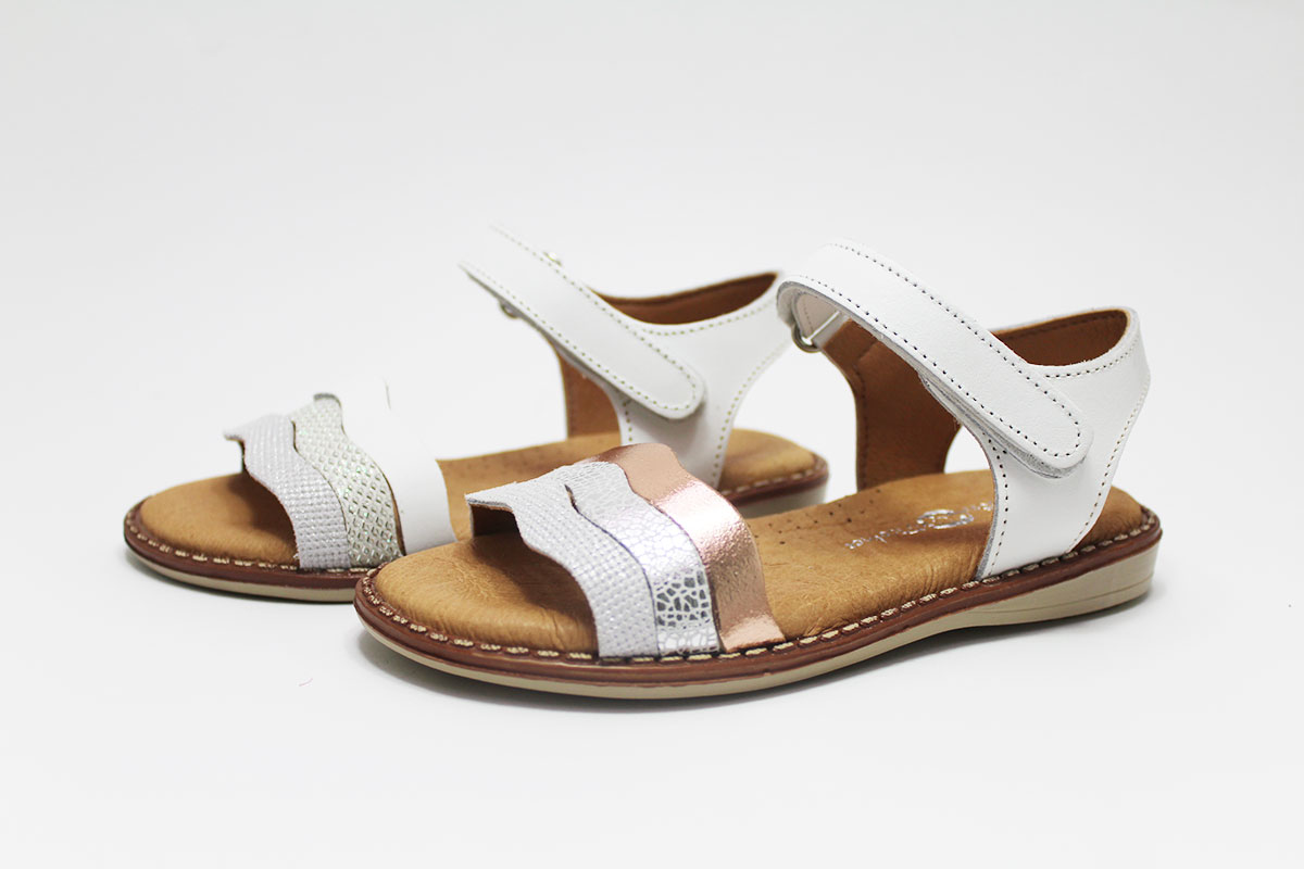 Sandalias para niña con tres preciosas tiras onduladas. Tiene un cómodo cierre adherente para que puedan ponérselo y quitárselo ellas solas con una mayor autonomía.