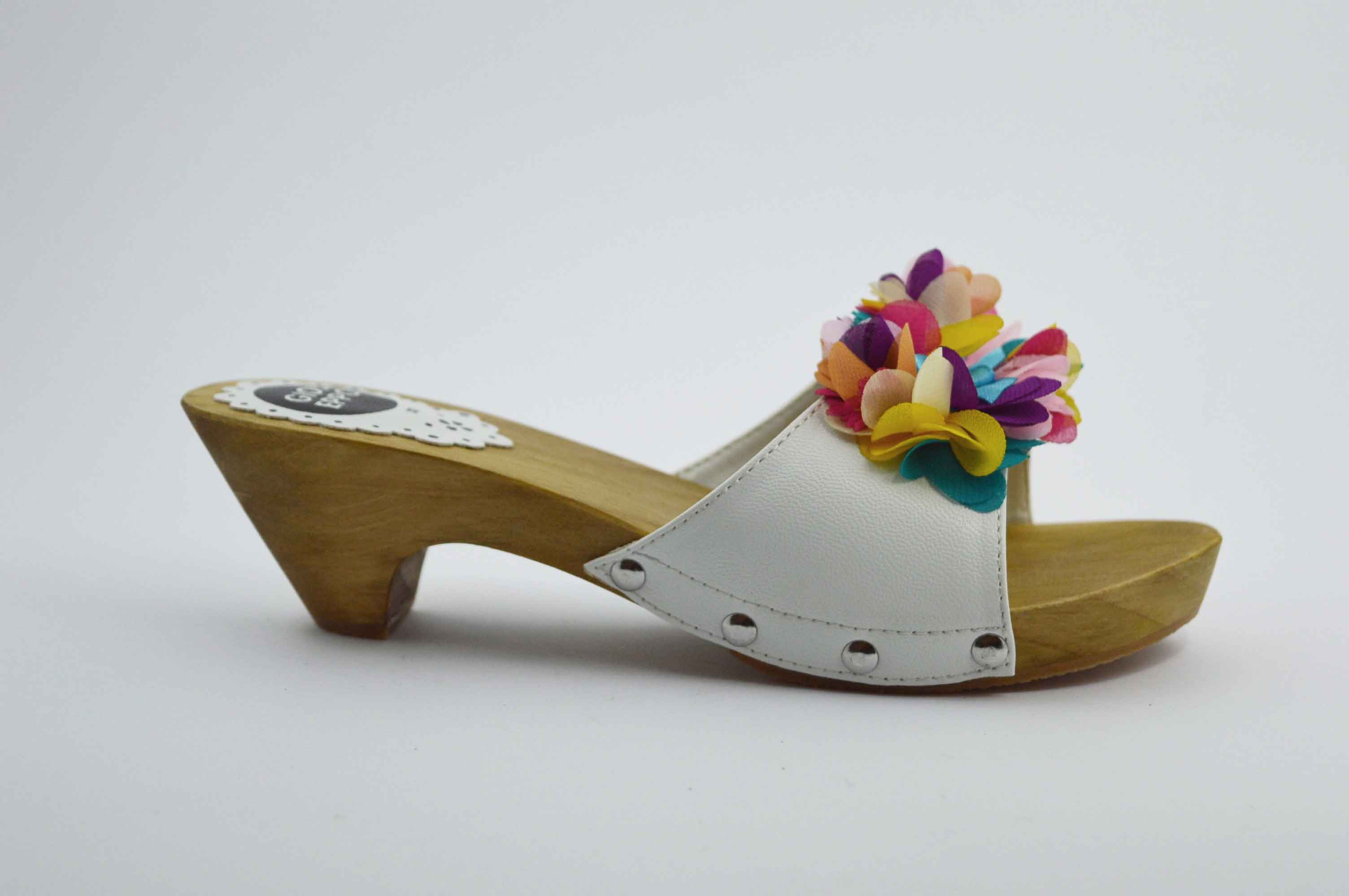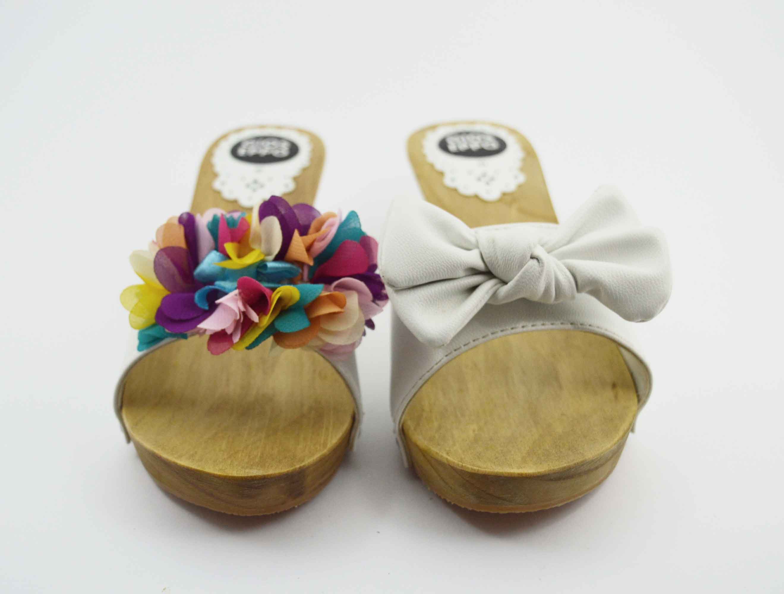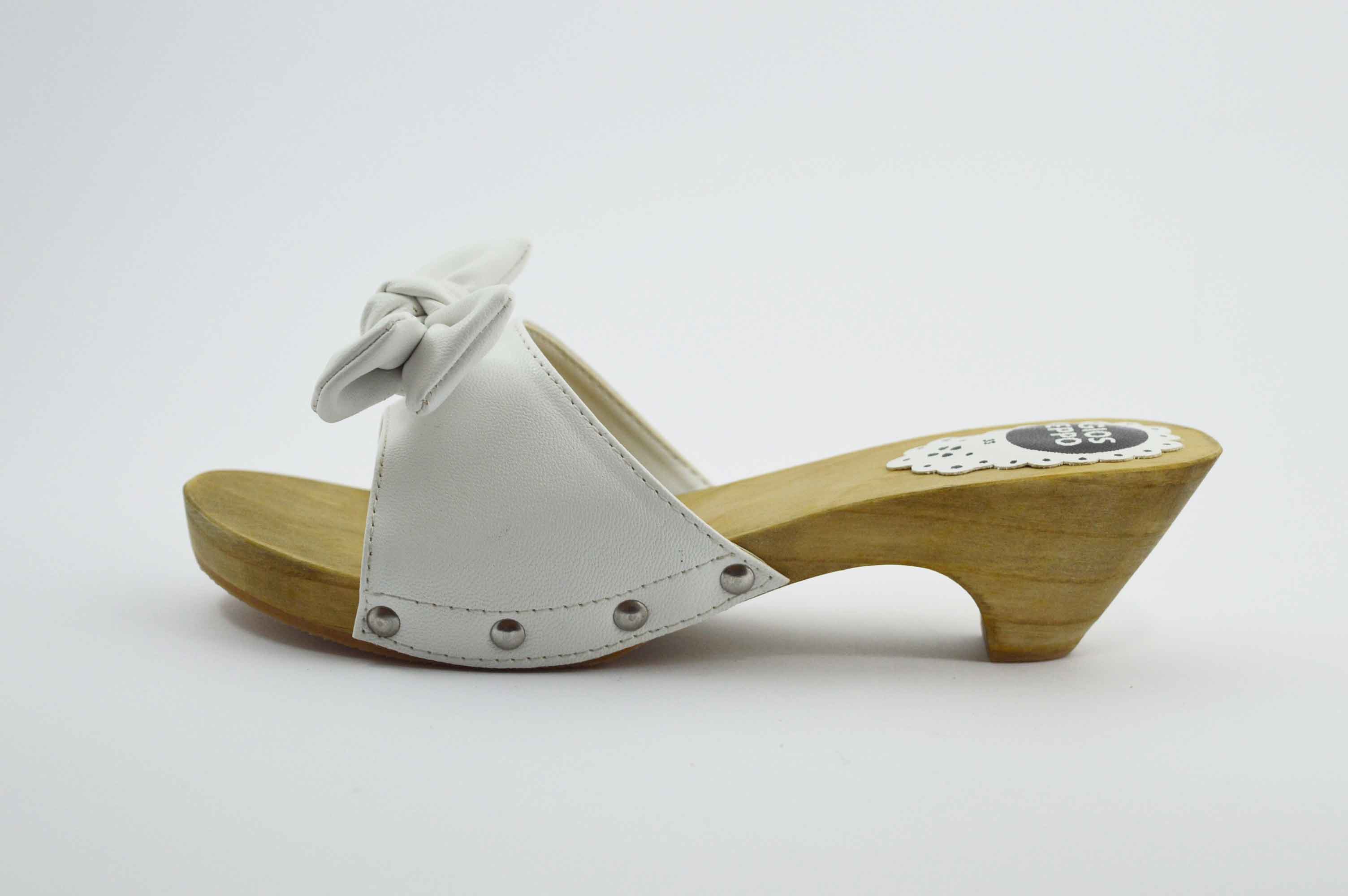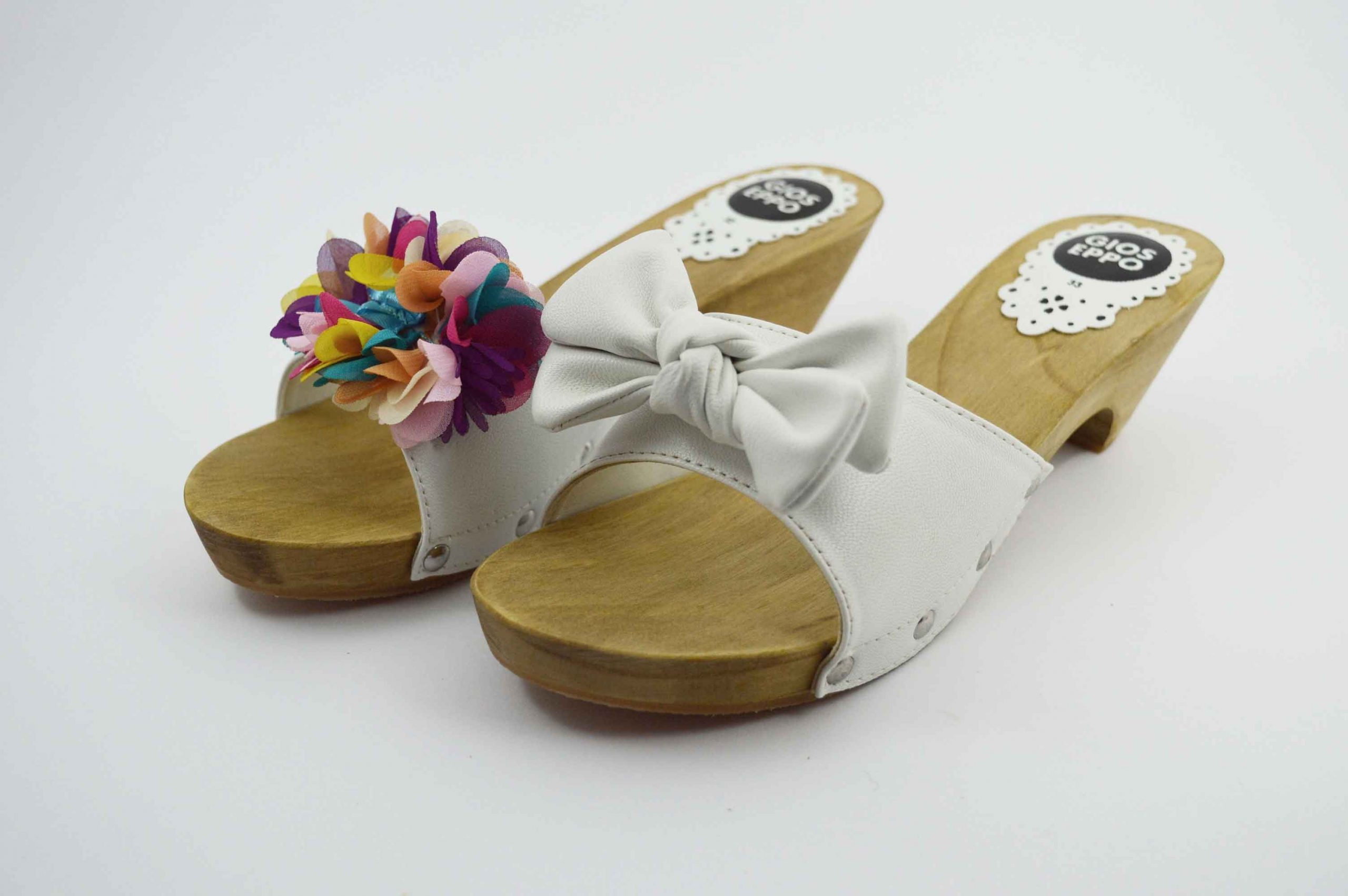 Preciosos zuecos de piel de niña con madera y decoradas con un lazo lateral. Corte y forro de piel y planta de madera.