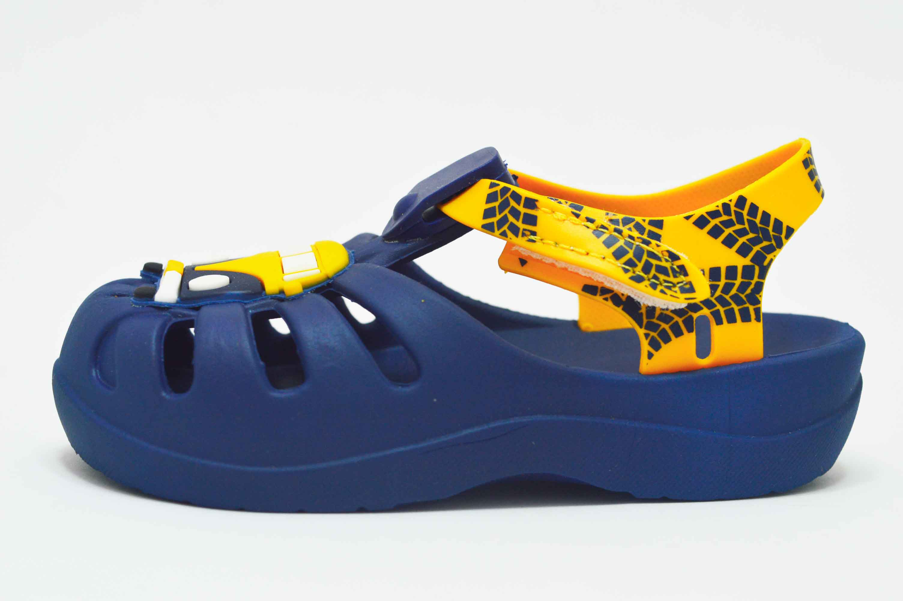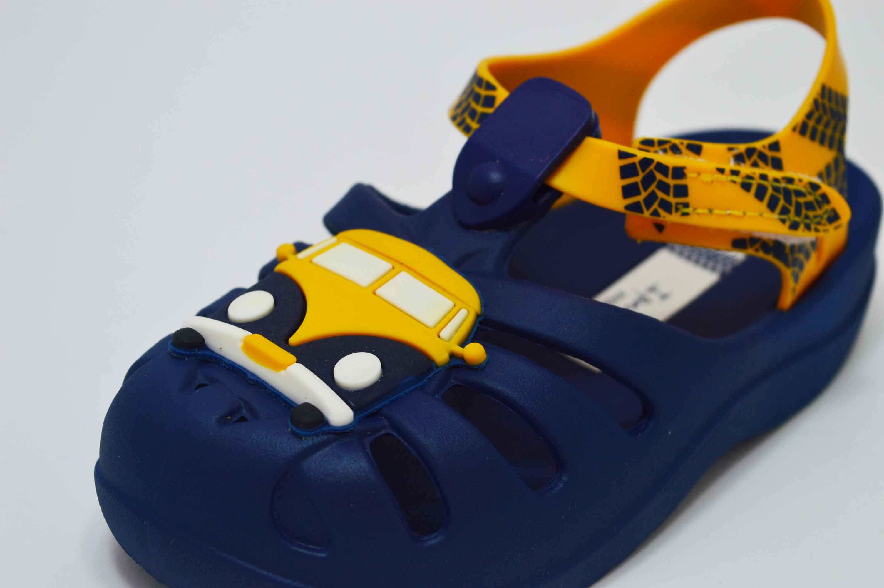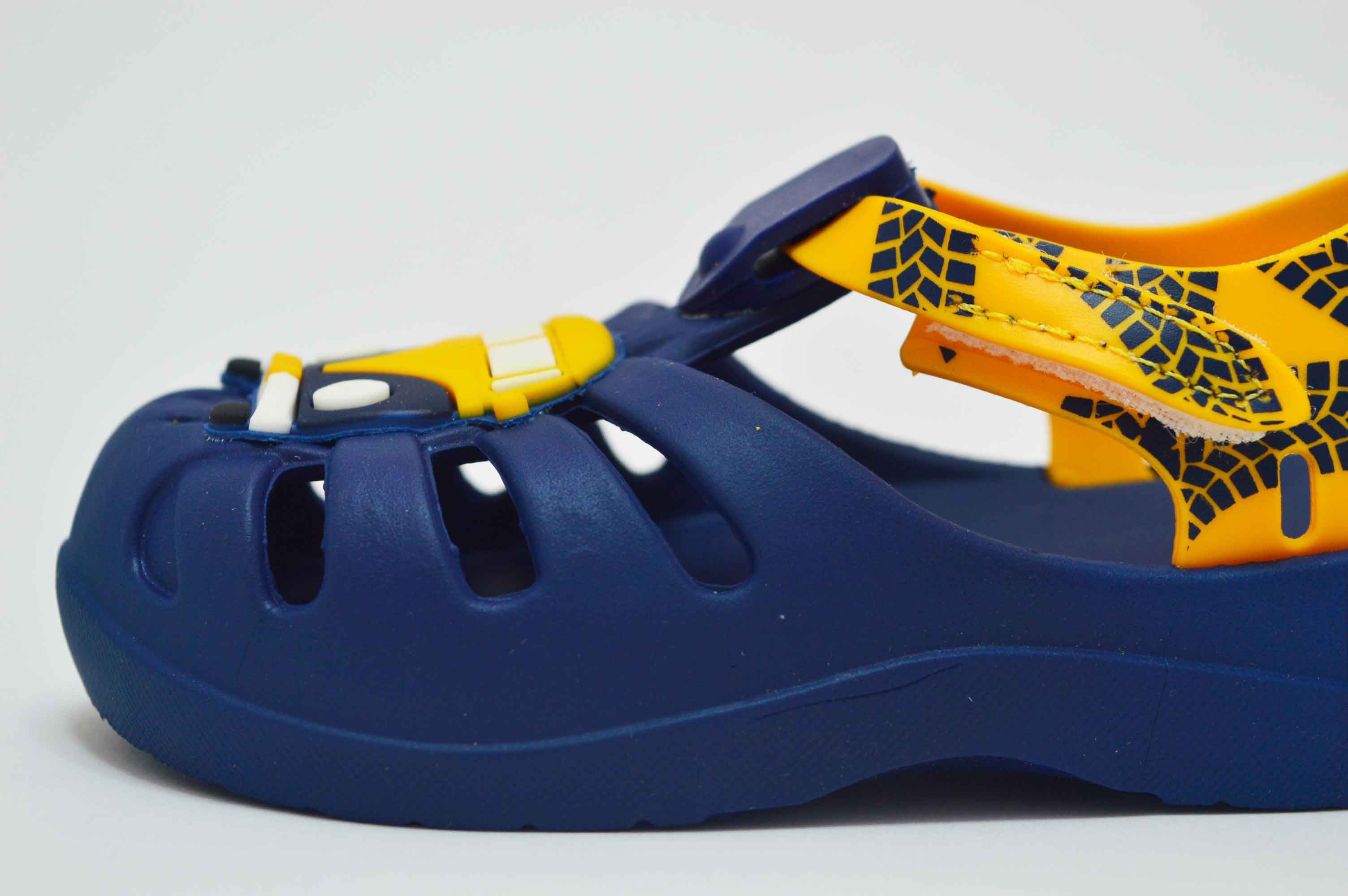 Cangrejeras de la marca Ipanema, de muy buena calidad. Es un imprescindible cada verano, además con diseño nuevo cada año. Este modelo trae un autobus combinando tonos amarillos con el azul marino.