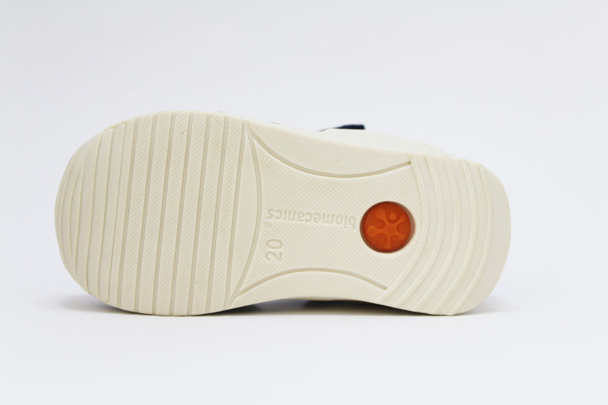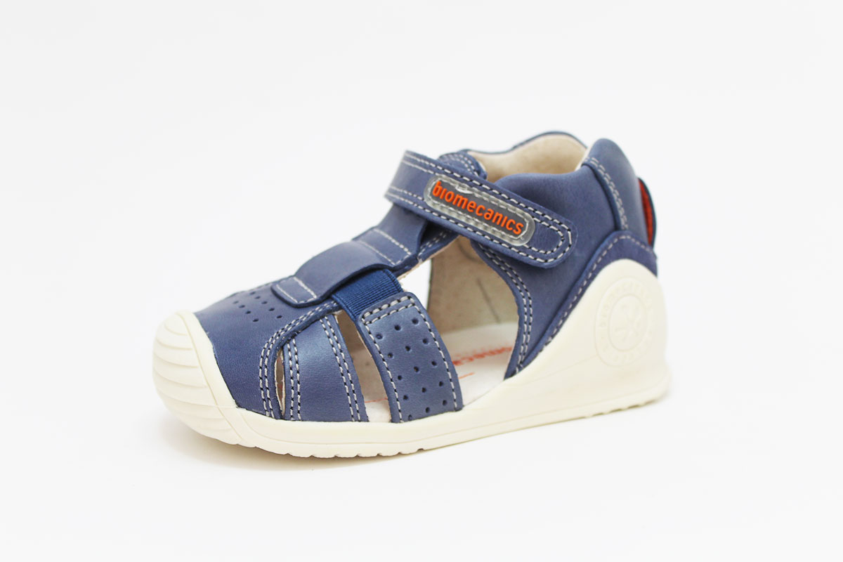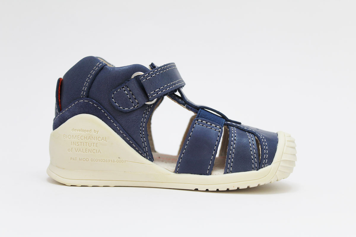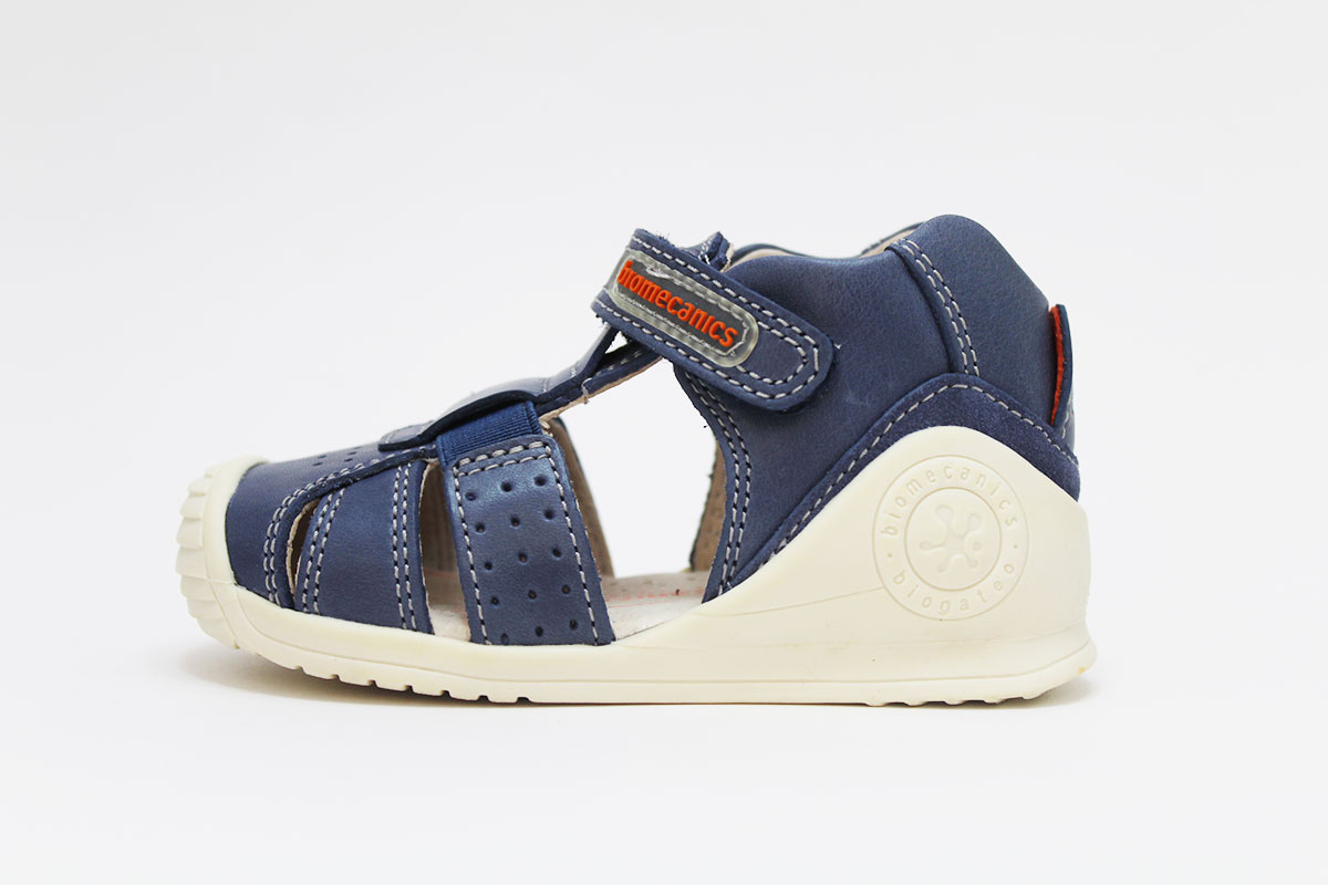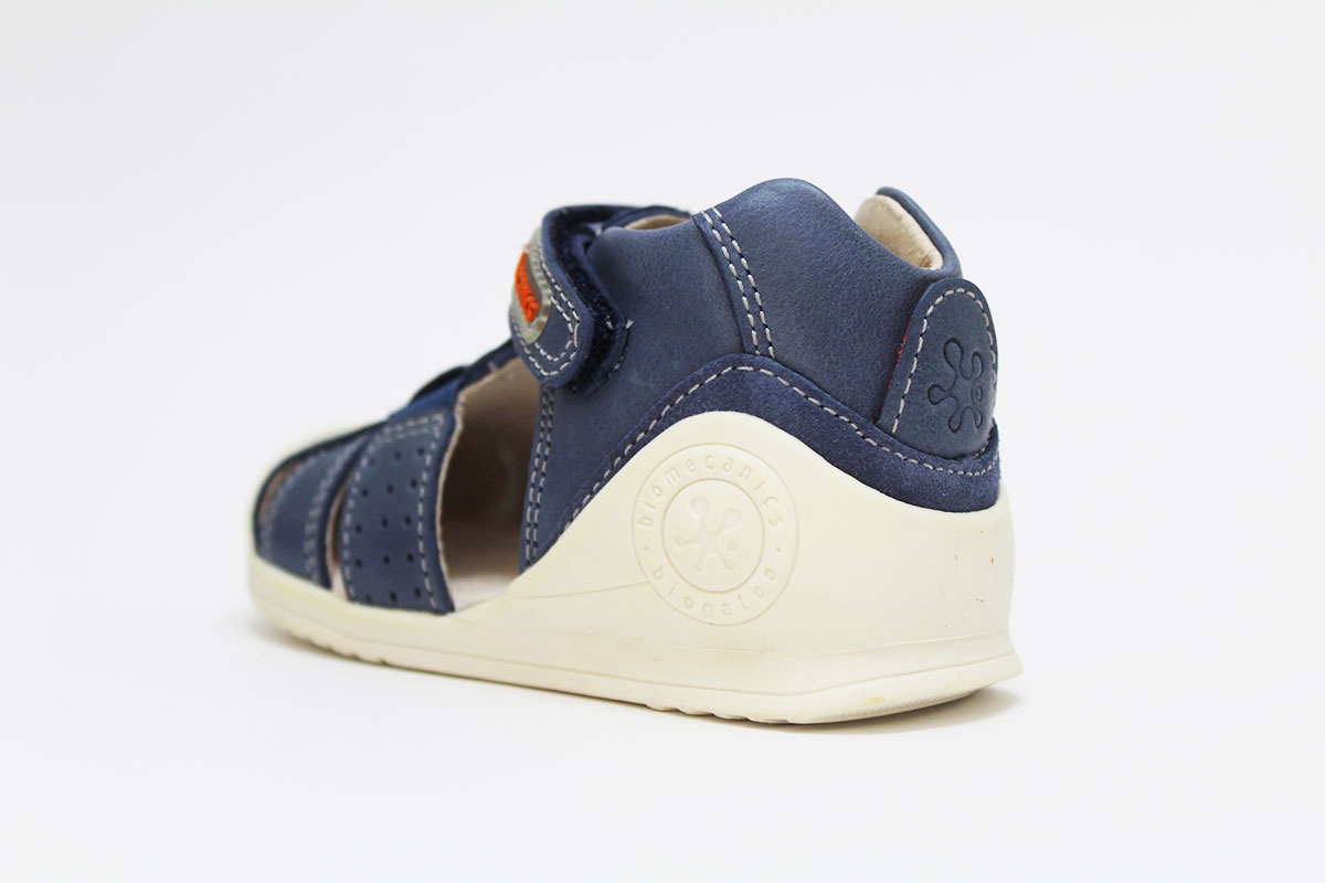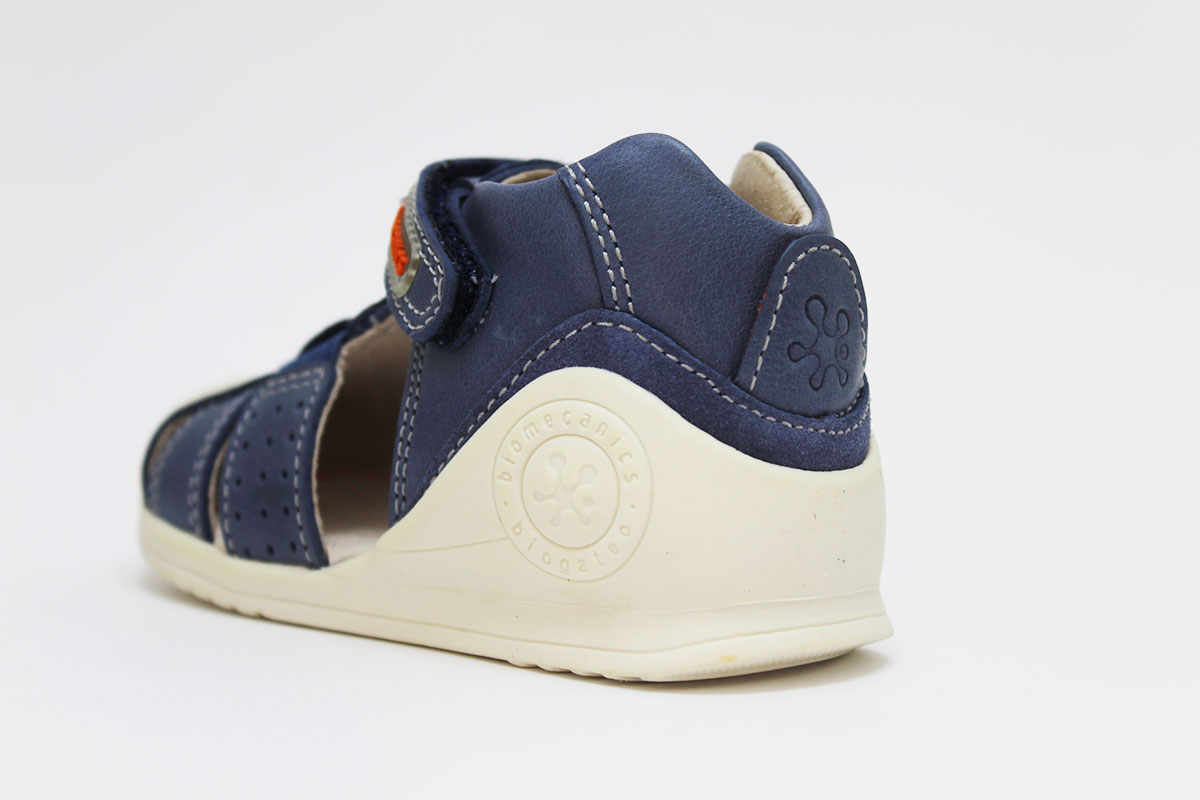 Sandalias en color azul jeans, perfectas para los primeros pasos de los niños. Para mayor comodidad y autonomía, tienen un cierre adherente ajustable. De la marca Biomecanics.