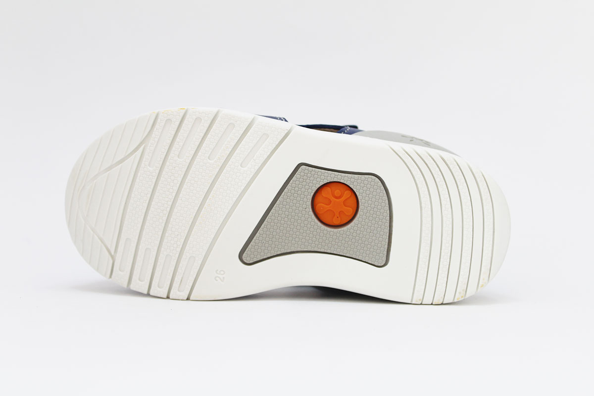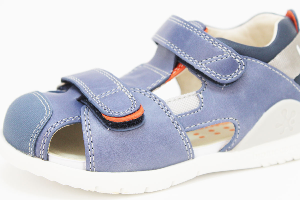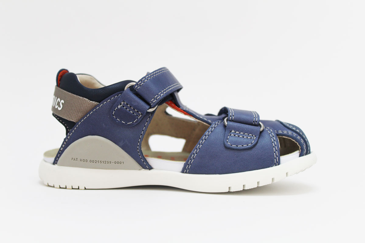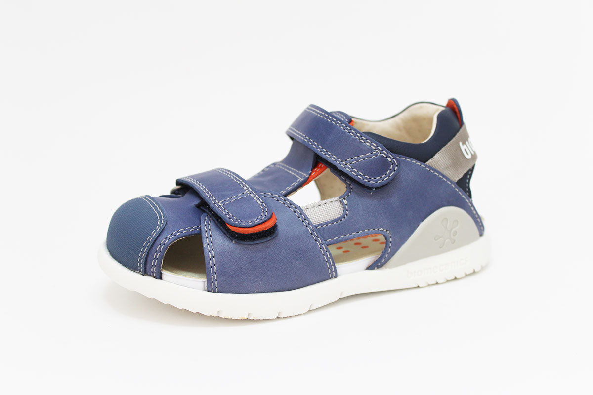 Sandalias en azul jeans, tipo cangrejeras con puntera reforzada. Con los dos cierres adherentes se adaptan perfectamente al pie del niño. Es un producto de la marca Biomecanics, fabricados en piel natural.