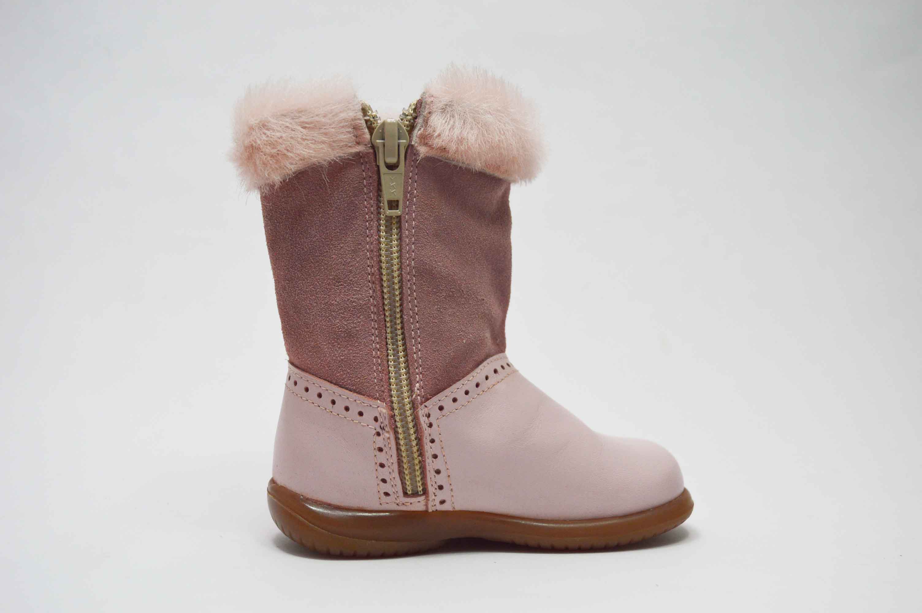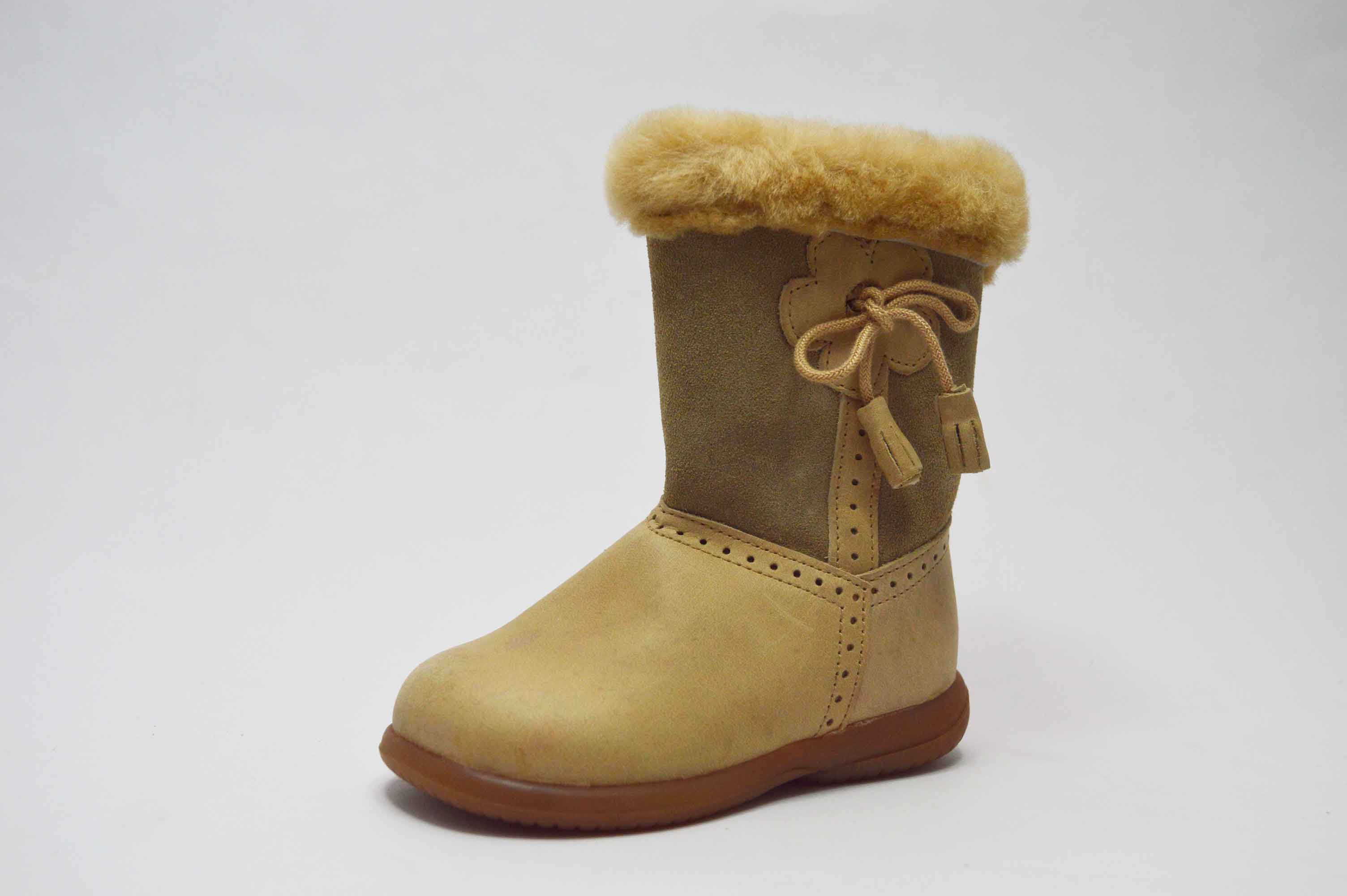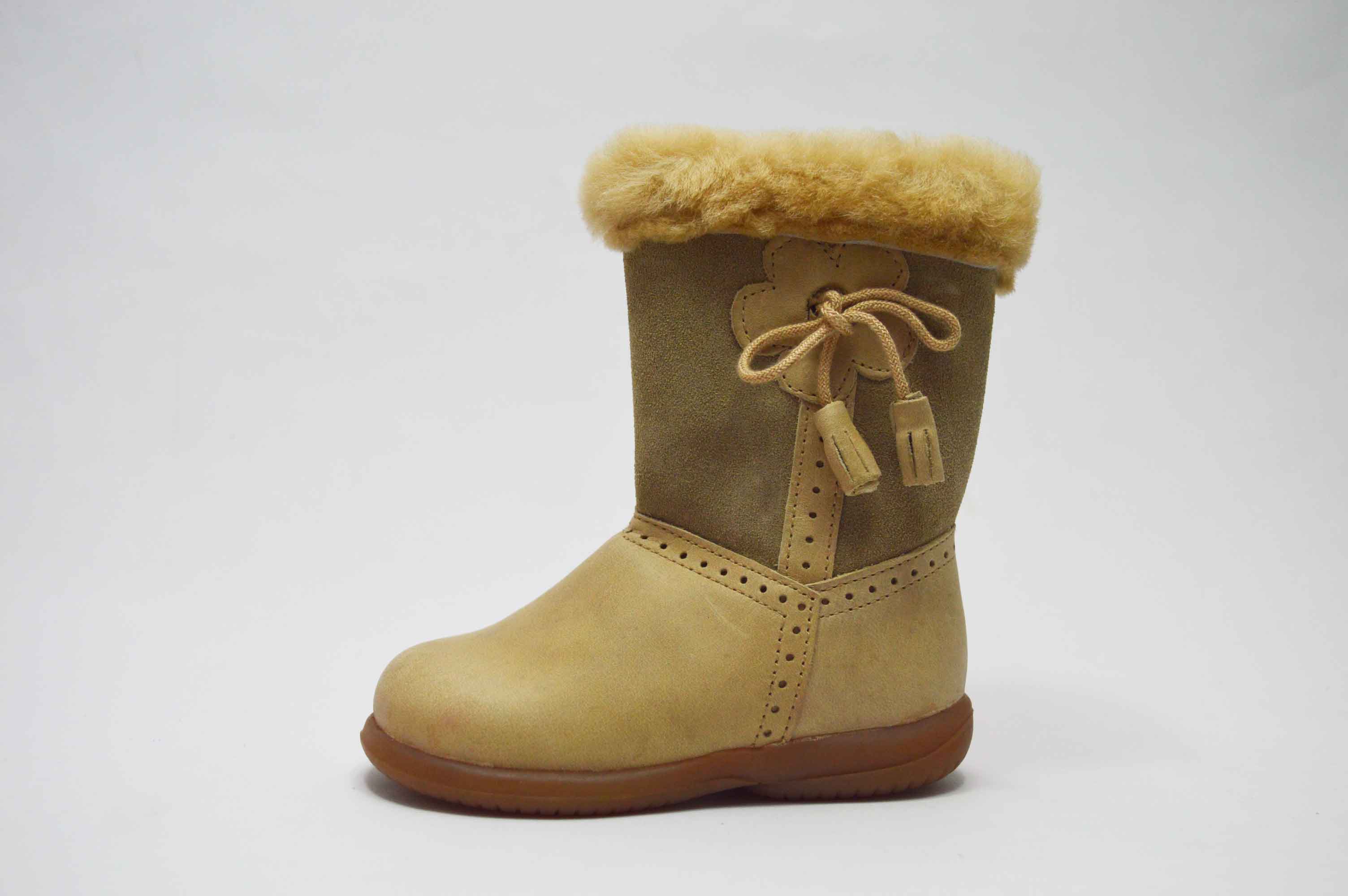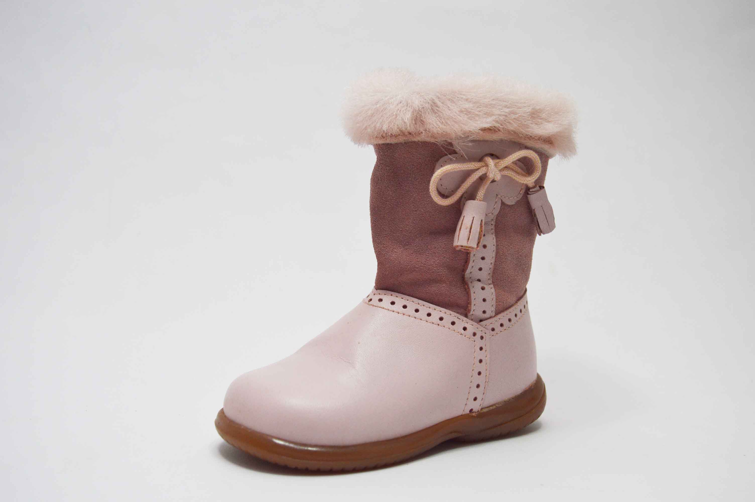 Bota alta de niña, combinada con serraje piel y napa piel. Tiene en la parte superior un poco de pelo y en el lateral una lazito que sale de una flor.