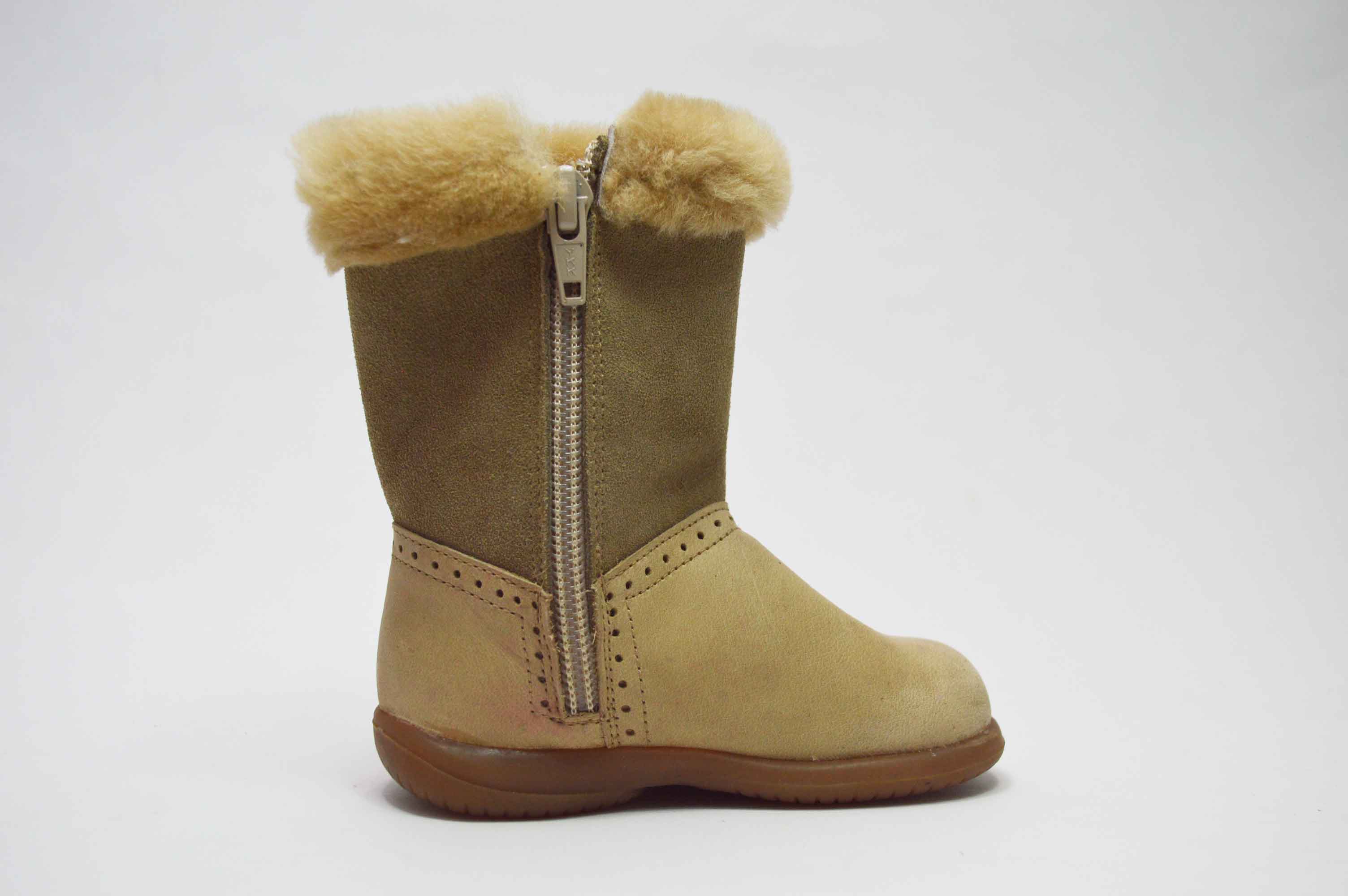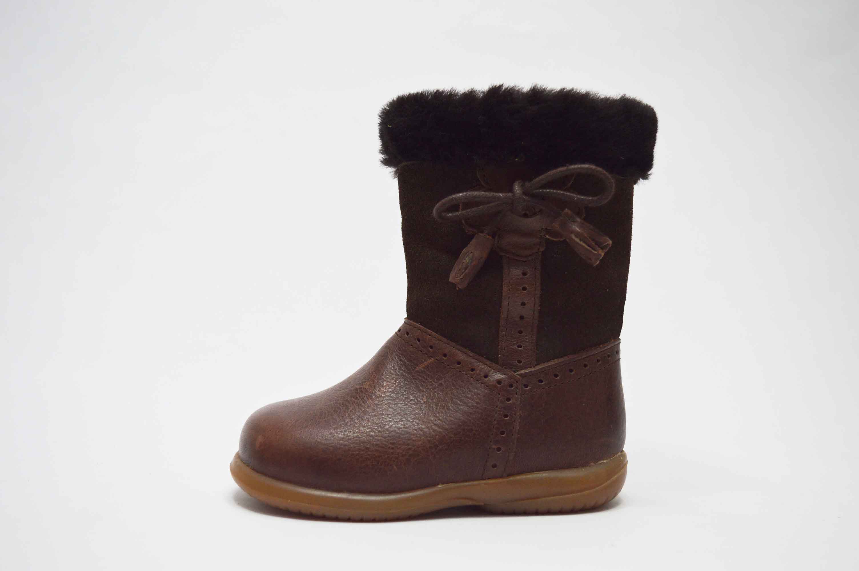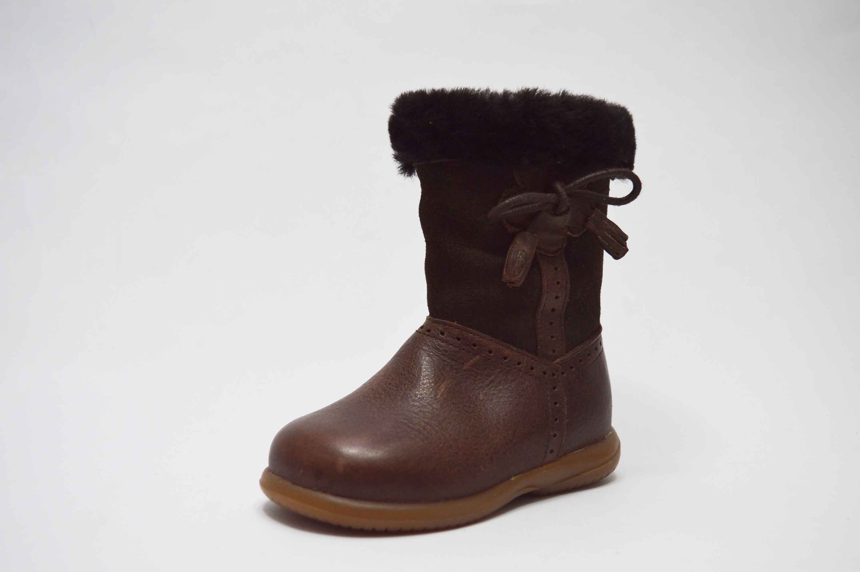 Bota alta de niña, combinada con serraje piel y napa piel. Tiene en la parte superior un poco de pelo y en el lateral una lazito que sale de una flor.