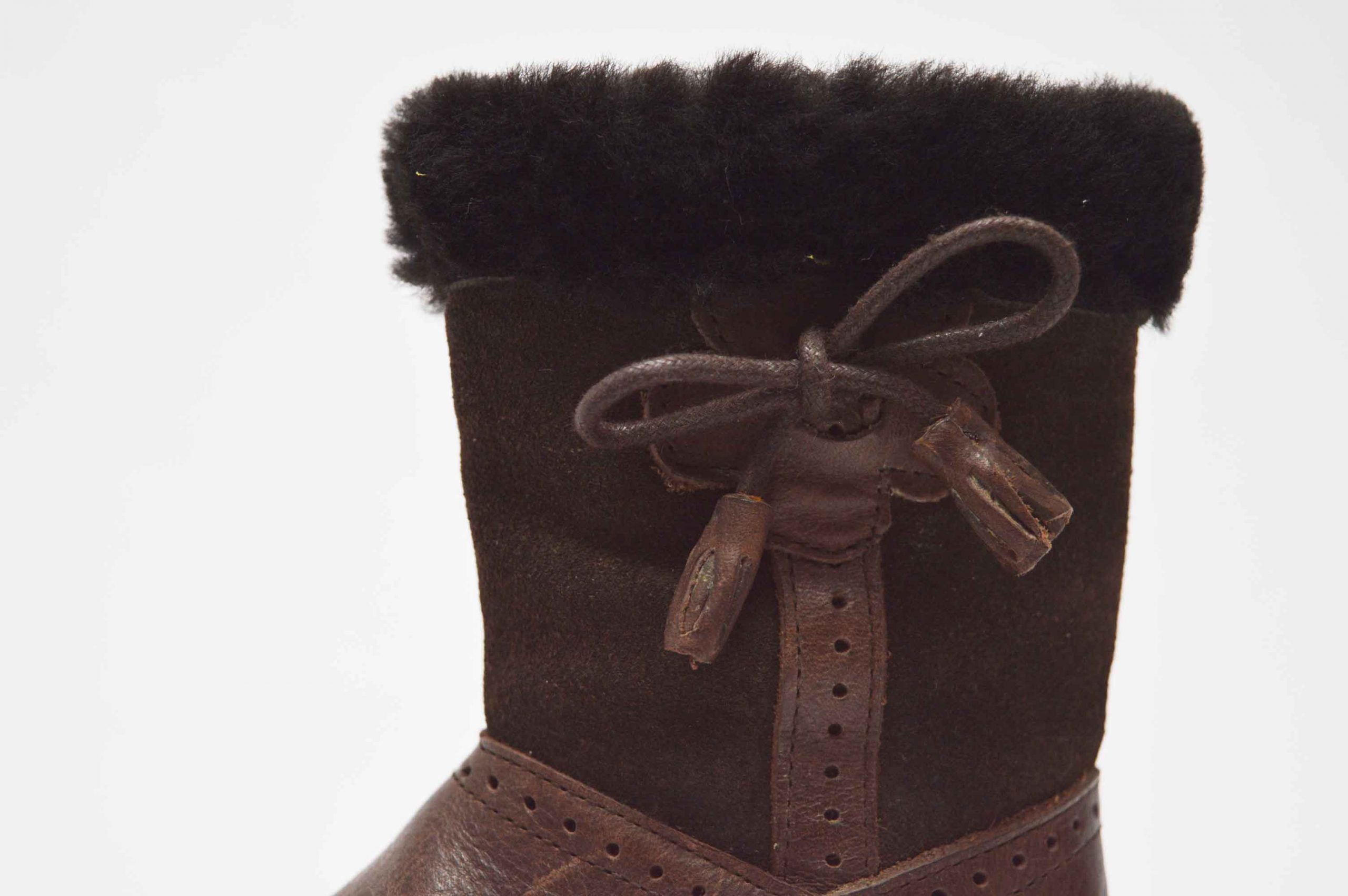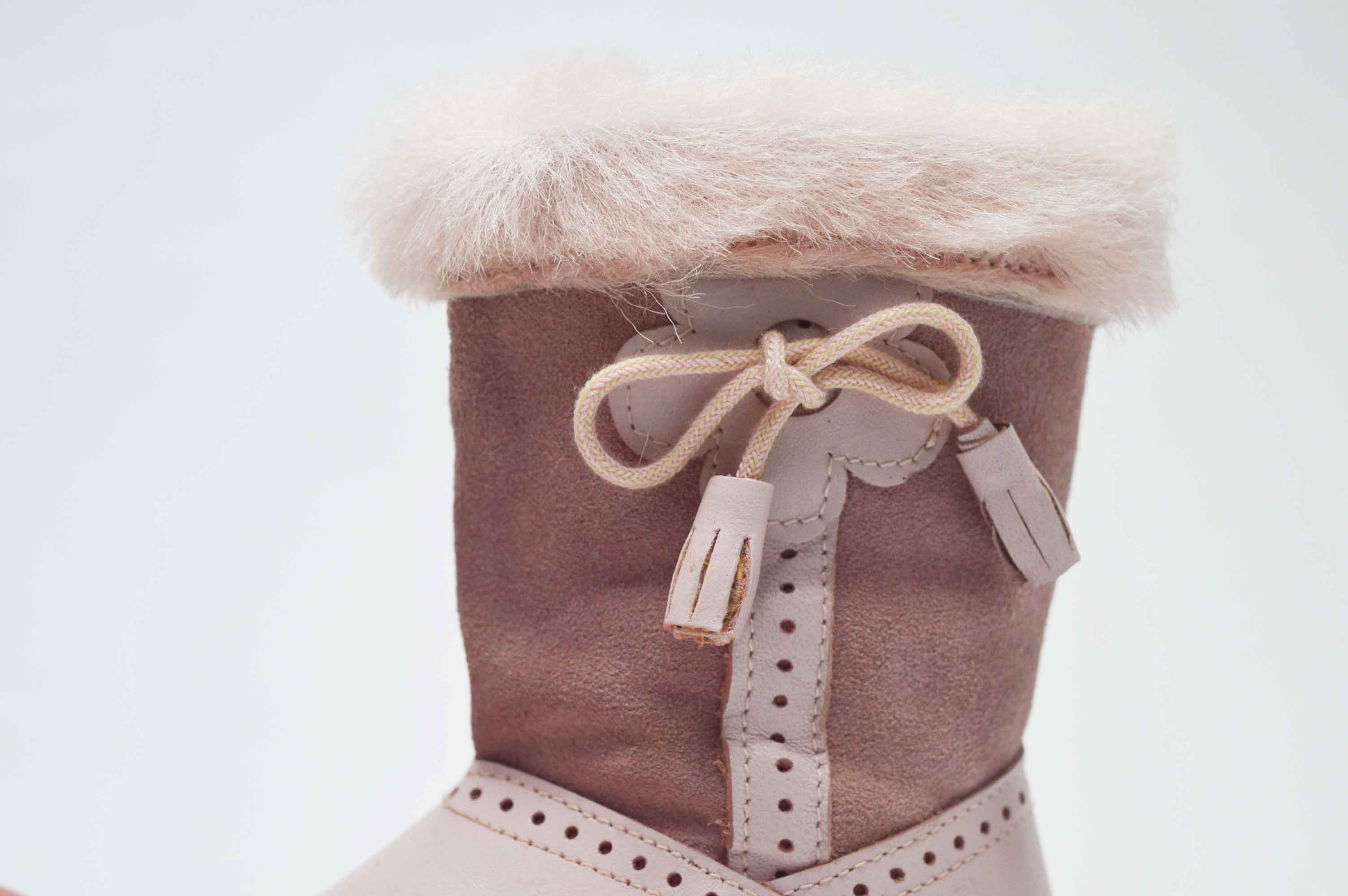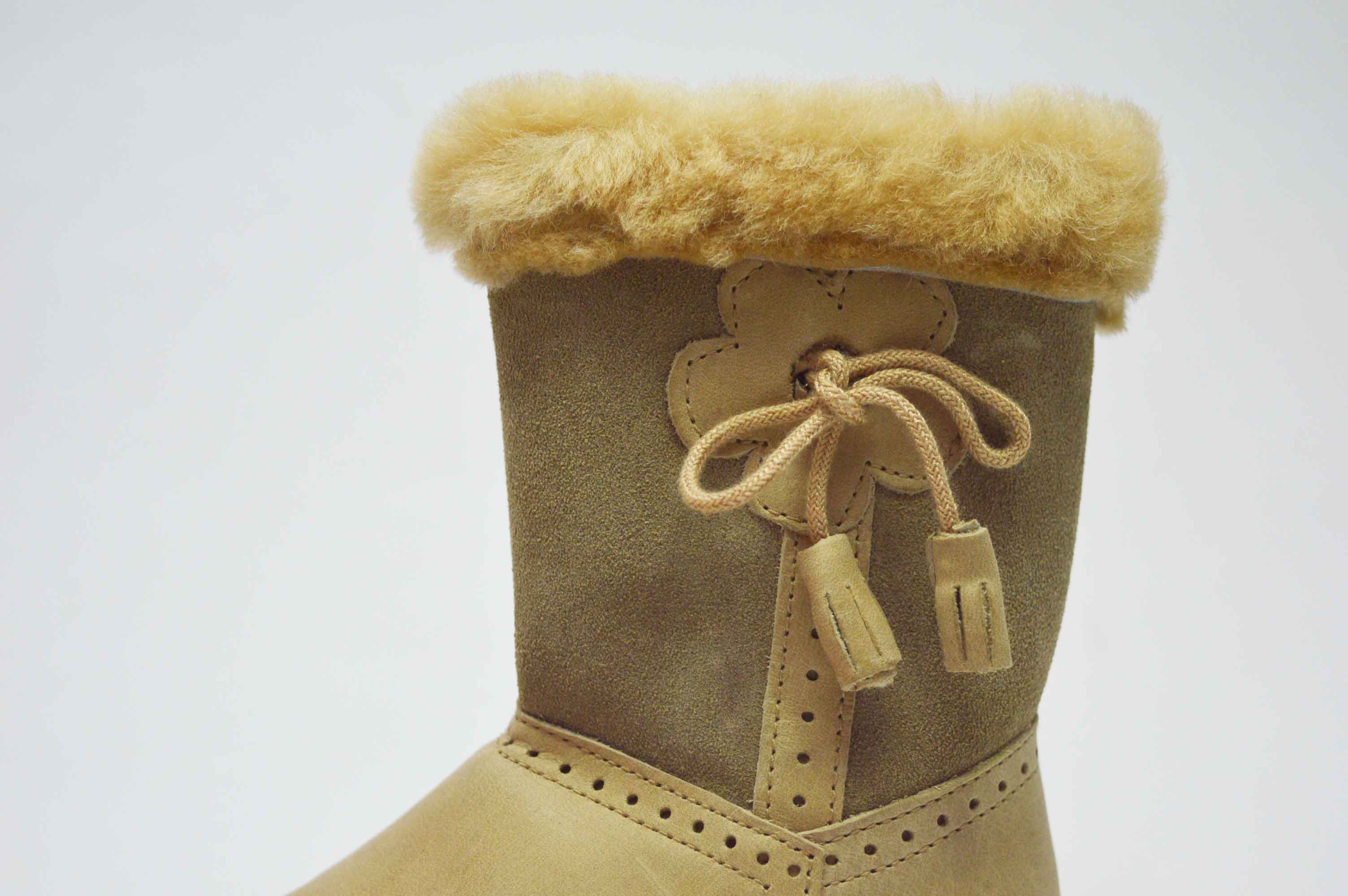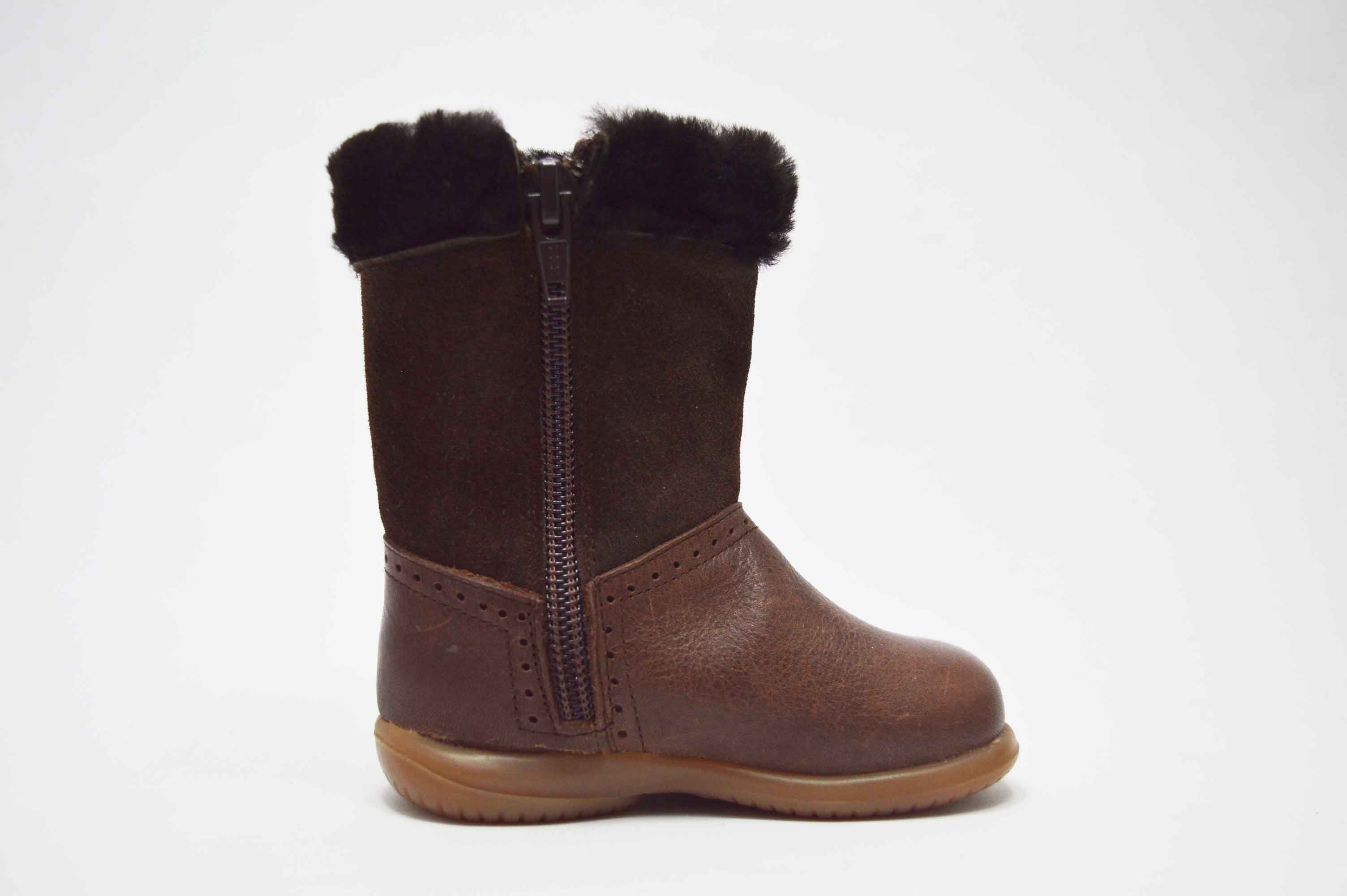 Bota alta de niña, combinada con serraje piel y napa piel. Tiene en la parte superior un poco de pelo y en el lateral una lazito que sale de una flor.