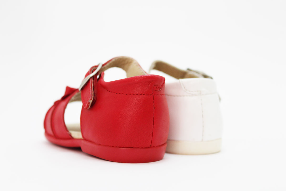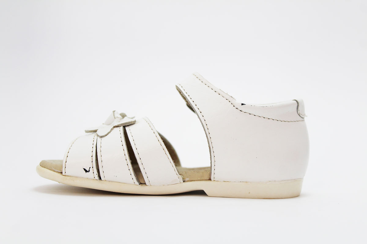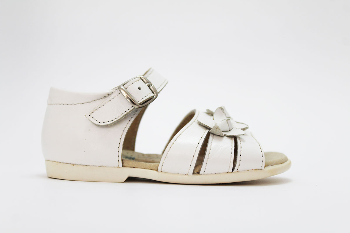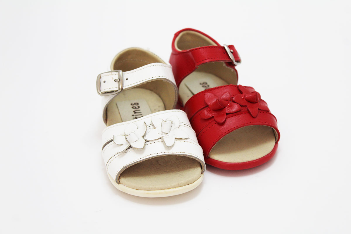 Sandalias blancas con talón cerrado, muy cómodas. Adaptadas para las niñas, para que empiecen a dar sus primeros pasos. Disponible con dos florecitas y en dos colores. Con cierre de hebilla para asegurar una buena sujeción y comodidad para el pie de tus niñas.