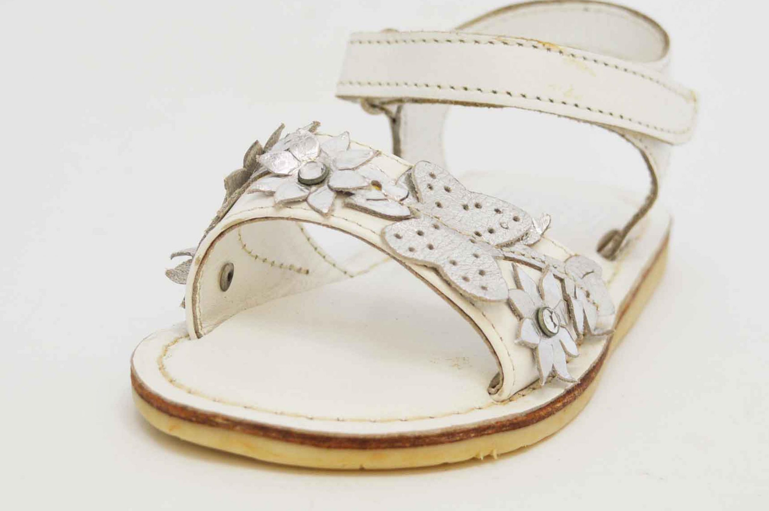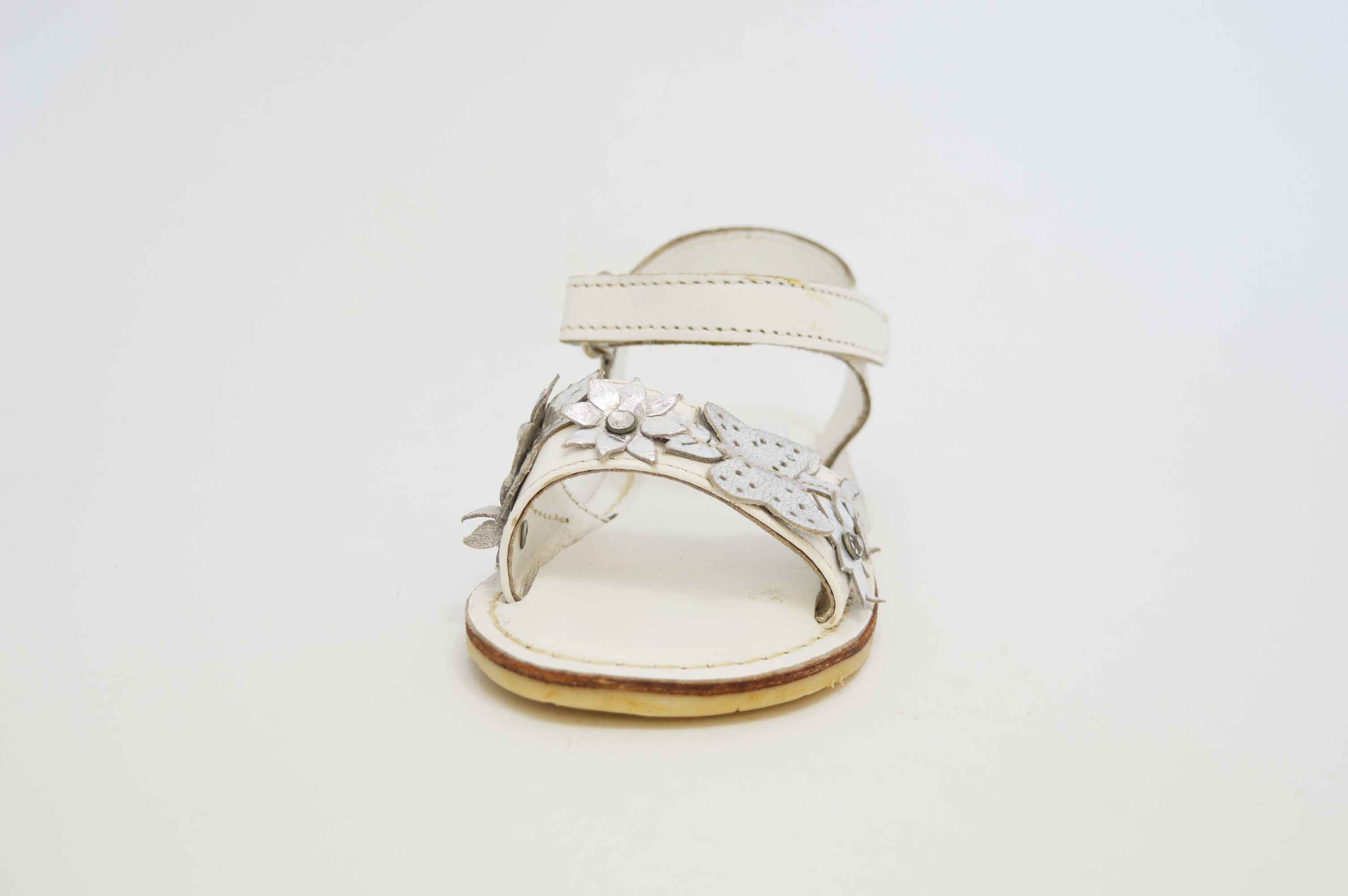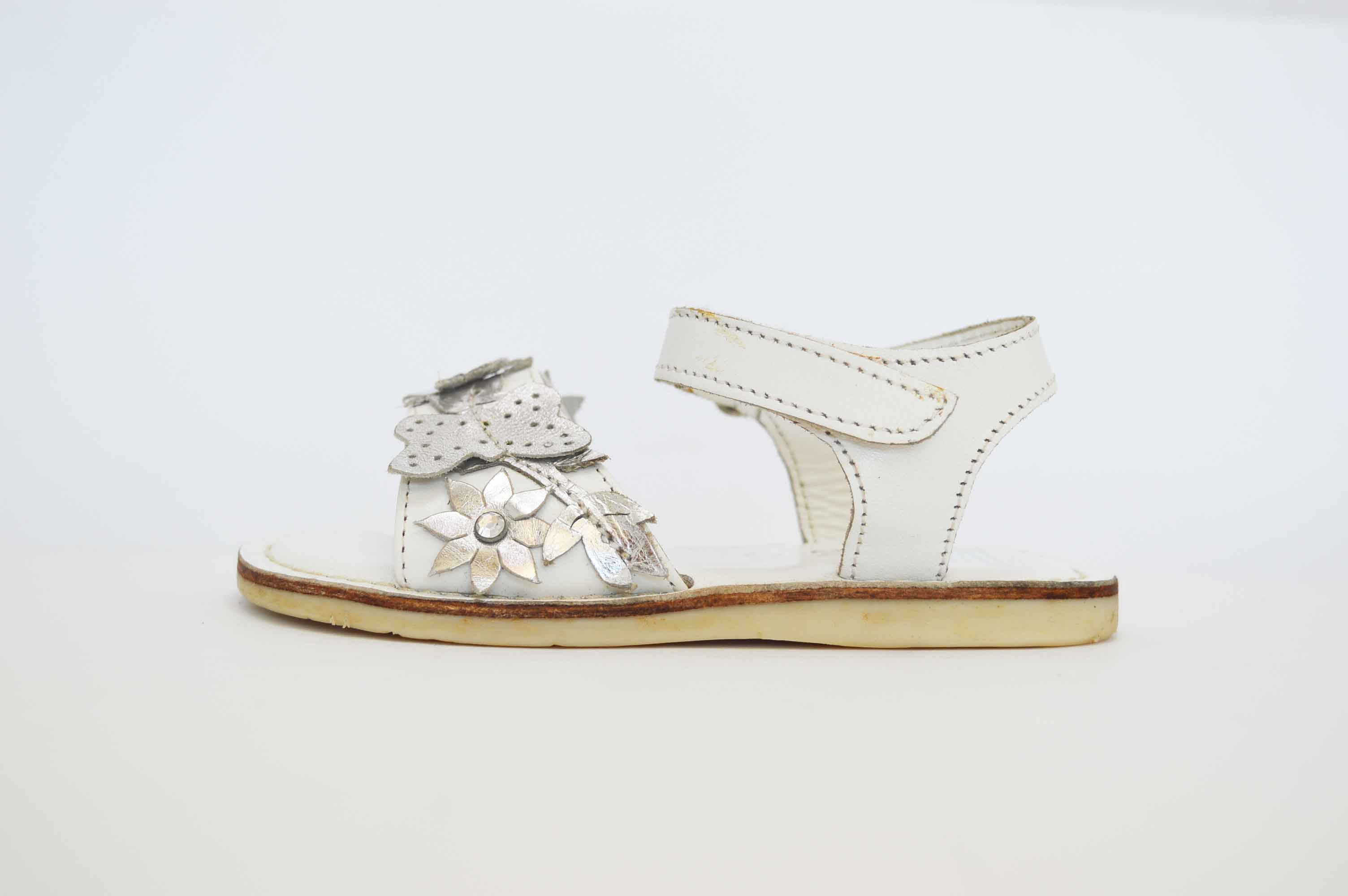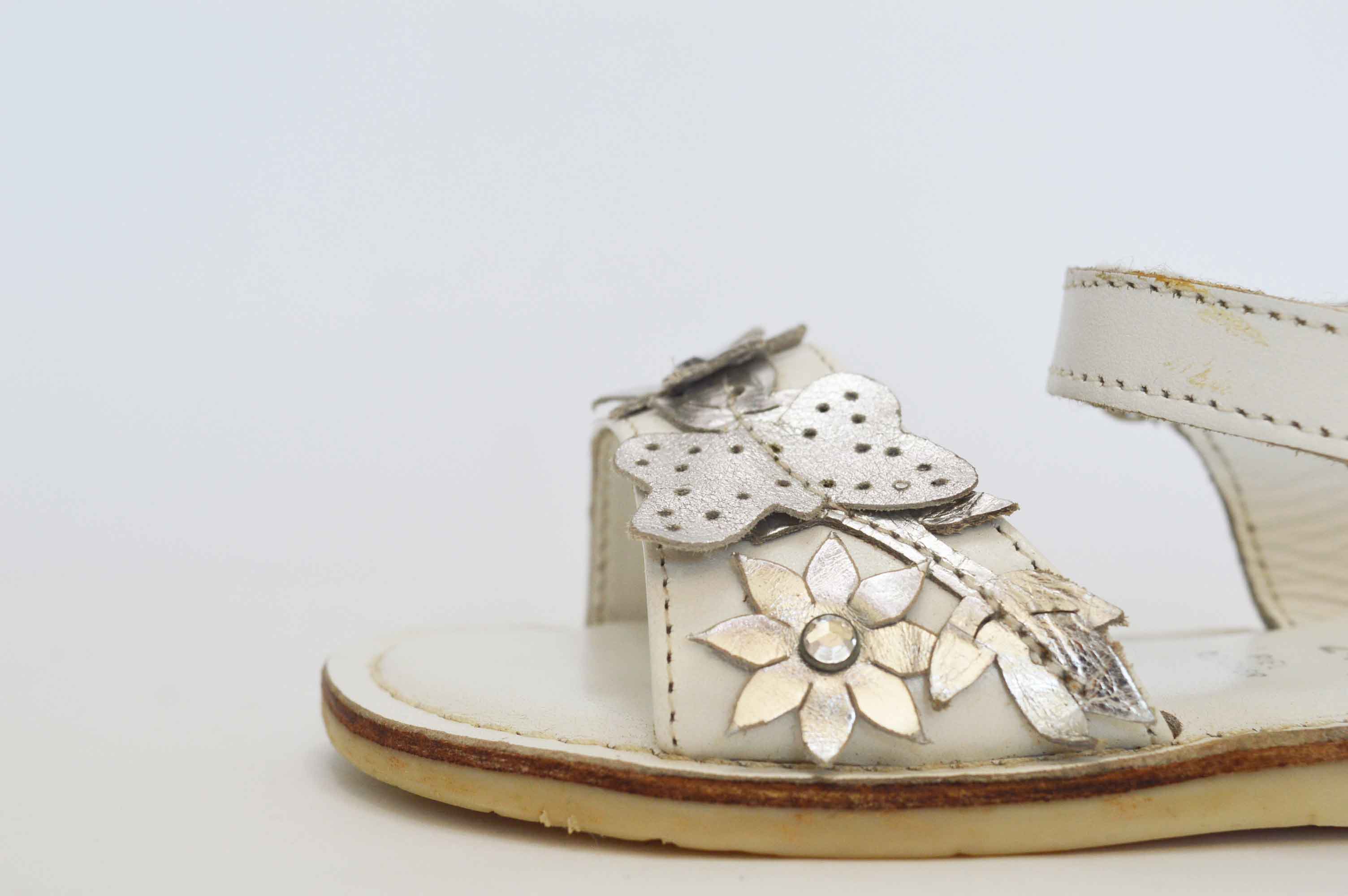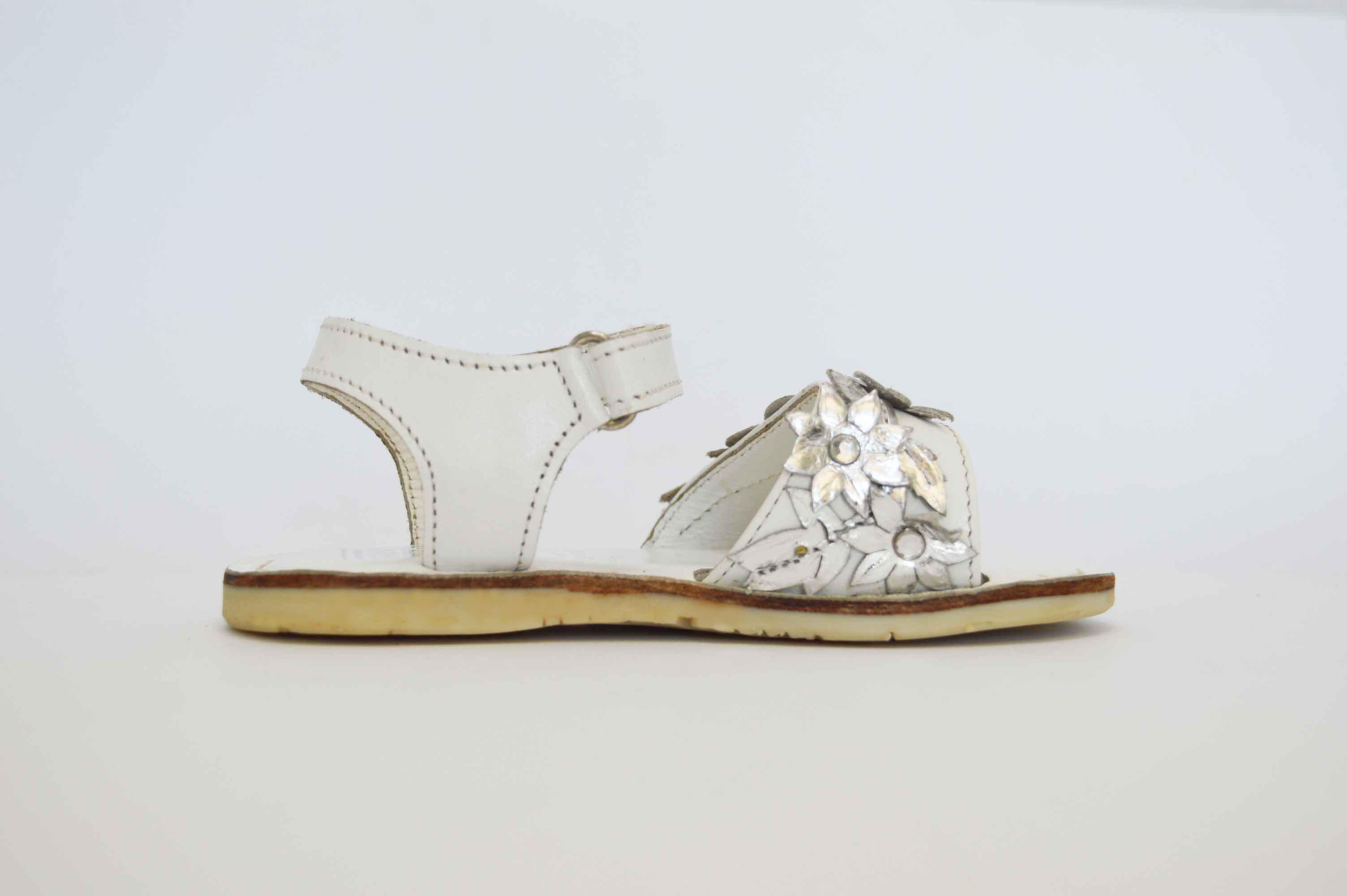 Sandalia para niña en piel con florecitas en color plata. Lleva la suela de goma y el piso acolchado.